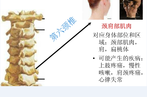 第六颈椎段:主要关联甲状腺、食道、气管、心肺、上肢等。如发生障碍,易患上臂或手腕痛、甲状腺炎、低血压、心律失常、五十肩、大拇指酸麻痛等症。
