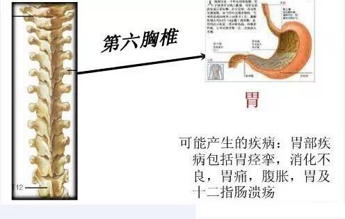 第六胸椎段:主要关联胰、胃、胆、胸背等。如发生障碍,易患肝区痛、胃痛、胆石症、上腹胀痛、肋间痛、食欲不振、胸背痛等症。