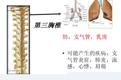 第三胸椎段:主要关联肺、支气管、食道、心脏、胸腔等。如发生障碍,易患气喘、咳嗽、支气管炎、肺炎、食道炎、肋膜炎、心脏病、胸闷、胸痛等症。