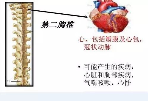 第二胸椎段:主要关联心脏、气管、食道、肩臂等。如发生障碍,易患食道炎、胸痛、气喘、咳嗽、血压异常、心律失常、肩臂酸麻痛、手麻木等症。