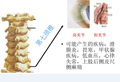 第七颈椎段:主要关联甲状腺、食管、气管、心肺、肱肌等。穴位之道公众号提示如发生障碍,易患甲状腺炎、低血压、心律失常、手臂外侧、中指、肱肌、无名指酸麻痛等症。