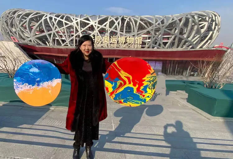 于2025年12月28日,米兰奥运万里行出征仪式前晨嫣曌右手持原创流体抽象画《红黄蓝的诉说》和左手持《白浪》两幅作品在鸟巢北京奥运博物馆前合影。