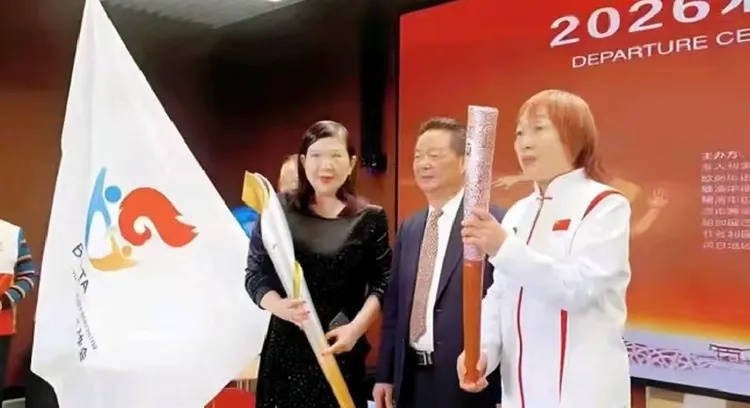 及北京双奥火炬手、奥运冠军刘玉坤在《米兰奥运万里行》出征仪式于2025年12月28日14点在鸟巢北京奥运博物馆合影。