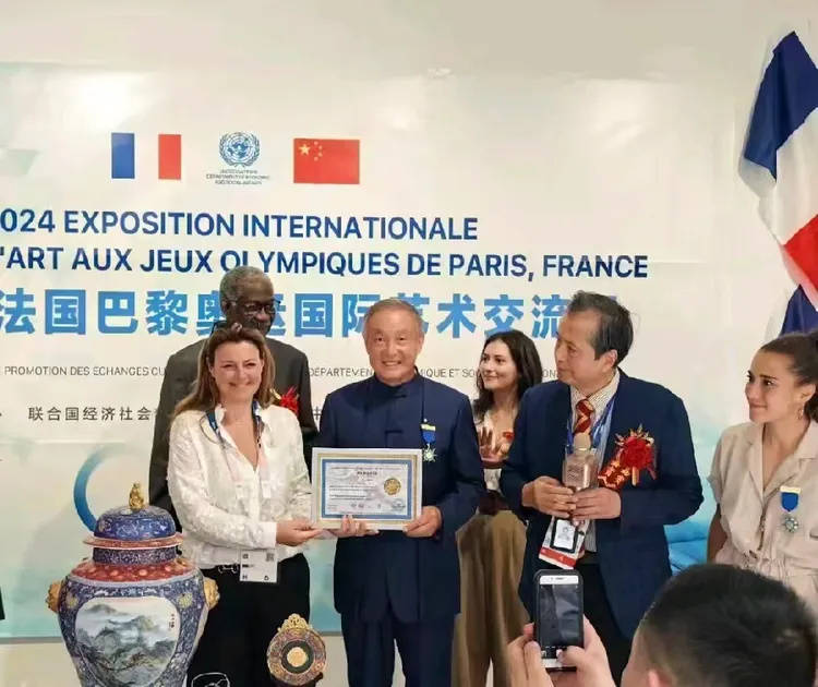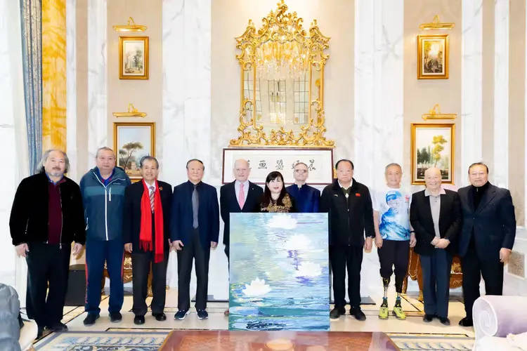 国际知名画家晨嫣曌与原北京奥委会副主席、全国政协委员蒋效愚先生、奥运射击冠军许海峰、原央视体育频道负责人、北京奥运火炬手、米兰冬奥会万里行主席岑传理、原全国政协委员,北京体育大学校长池建、资深外交官、原中国驻澳大利亚等多国领事姜云、著名表演艺术家赵丽蓉之子、国家一级书画师盛大鸣、国家一级京剧演员刘金泉、英国资深油画收藏家、法国巨匠莫奈作品绘画鉴赏家、画廊主罗伯特(英国)、企业家迪迪艾(比利时)在纪念现代奥林匹克运动会132周年及中法建交60周年纪念展、喜迎米兰冬奥会万里行活动中,晨嫣曌致敬法国巨匠莫奈的原创作品《梦境白莲》合影。