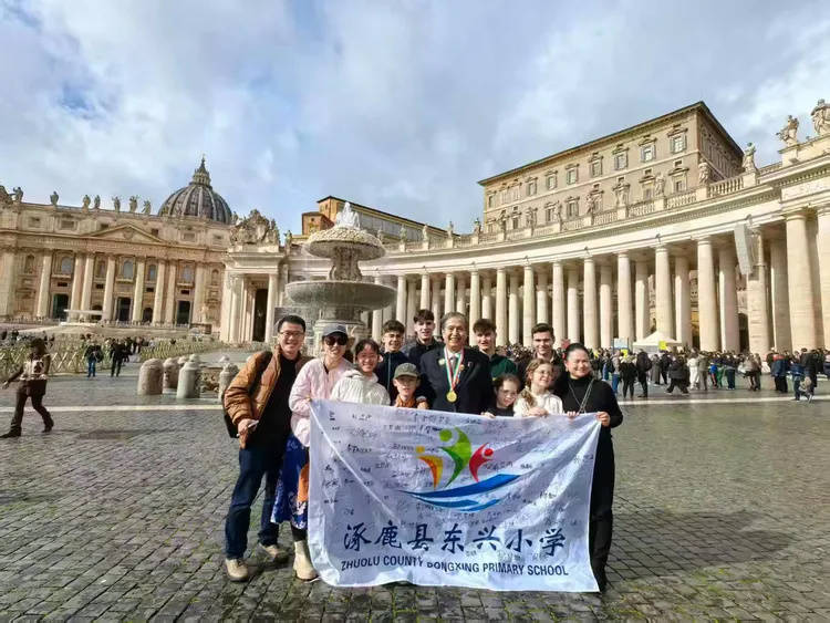图为米兰冬奥万里行主席岑传理与梵蒂冈圣彼得大教堂神职主教手持晨嫣曌《艳荷图》在梵蒂冈圣彼得大教堂合影。