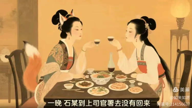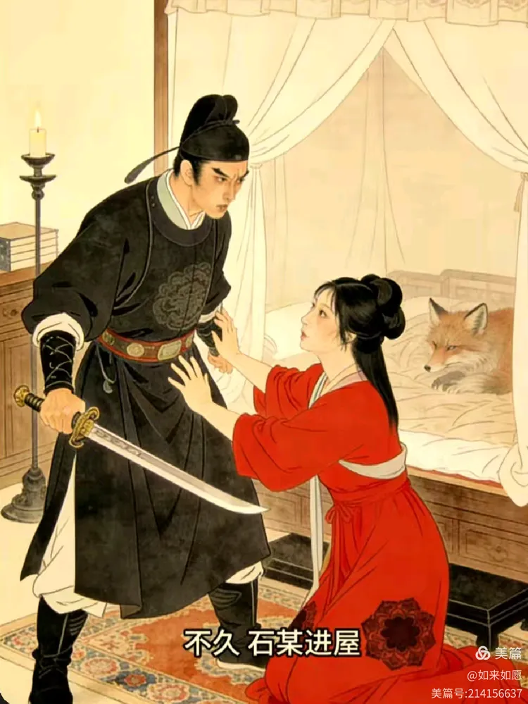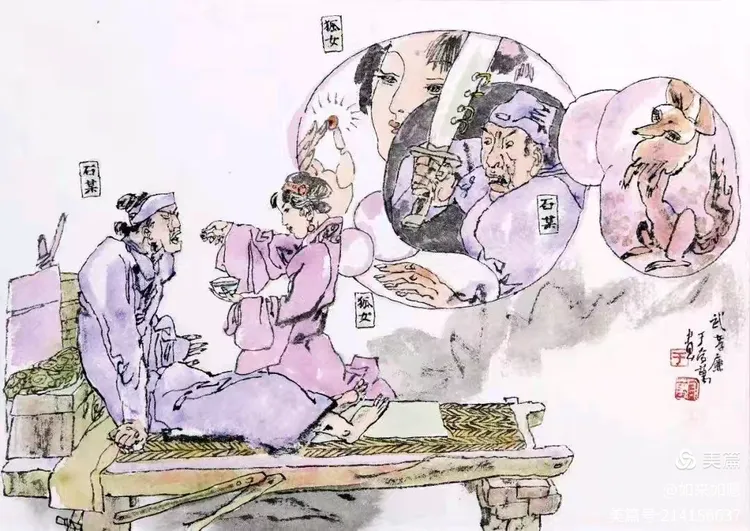 居之终岁,察其行多异。石疑其非人,常于寝后使人瞯听之,但闻床上终夜作振衣声,亦不知其何为。妇与王极相怜爱。一夕,石以赴臬司未归,妇与王饮,不觉醉,就卧席间,化而为狐。王怜之,覆以锦褥。未几,石入,王告以异,石欲杀之。王曰:“即狐,何负于君?”石不听,急觅佩刀。而妇已醒,骂曰:“虺蝮之行,而豺狼之心,必不可以久居!曩时啖药,乞赐还也!”即唾石面。石觉森寒如浇冰水,喉中习习作痒,呕出,则丸药如故。妇拾之,忿然径出,追之已杳。石中夜旧症复作,血嗽不止,半载而卒。