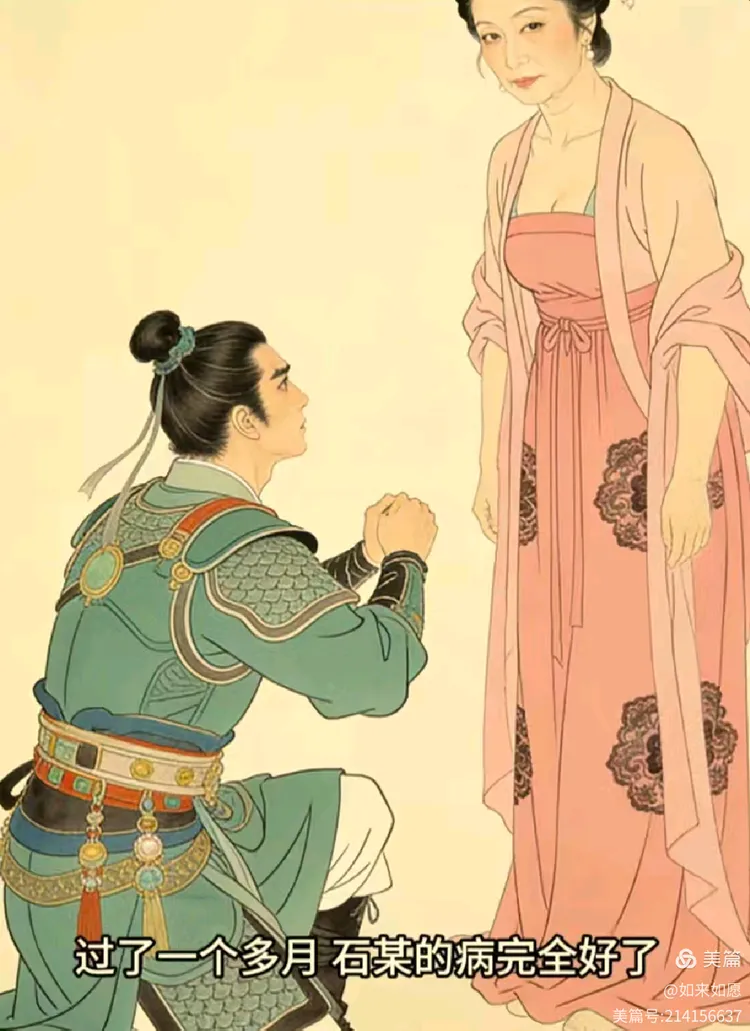 月余,病良已。石膝行而前,敬之如母。妇曰:“妾茕独无依,如不以色衰见憎,愿侍巾栉。”时石三十余,丧偶经年,闻之,喜惬过望,遂相燕好。妇乃出藏金,使入都营干,相约返与同归。