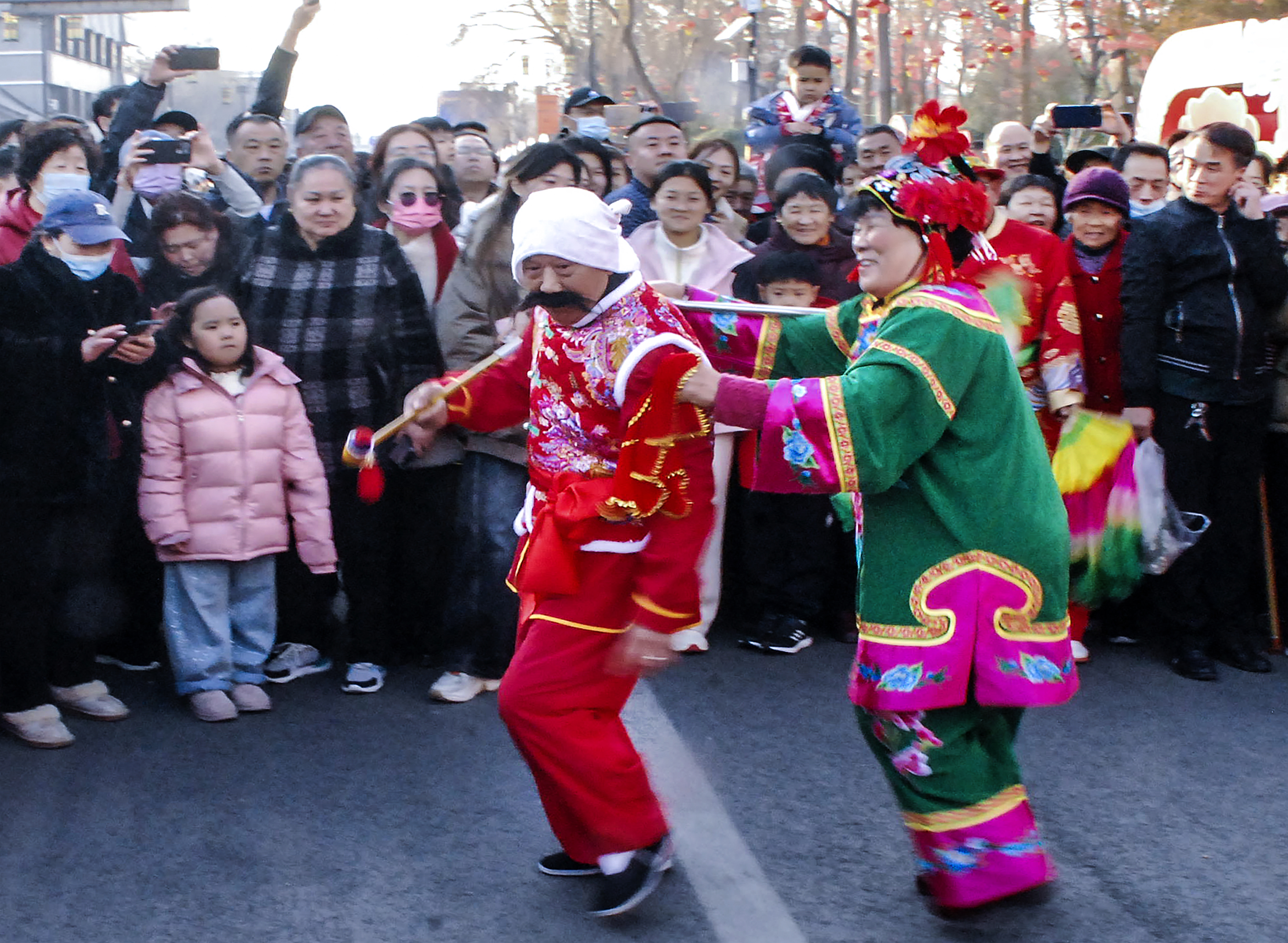 随后,济南新时代民俗秧歌团的民俗大秧歌表演粉墨登场。演员们身着鲜艳的服饰,脸上洋溢着灿烂的笑容,迈着欢快的步伐,扭起了欢快的大秧歌。他们的表演滑稽诙谐,逗人发笑。那夸张的动作、欢快的节奏,让现场的气氛达到了高潮。观众们也被这欢乐的氛围所感染,纷纷加入到秧歌队伍中,共同感受着节日的喜悦。