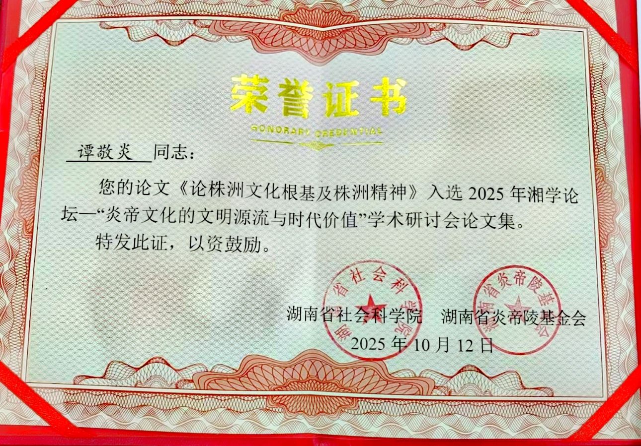 - 地方文化传承:积极参与《湘学论坛》《瓷耀醴陵》等特色活动,发布文图帖32个,深度宣传炎帝精神与醴陵釉下五彩瓷器文化,助力地方非遗与传统文化传承推广;撰写的《株洲文化根基和株洲精神》一文获湖南省社会科学院、湖南省炎陵基金会联合表彰并收编学者专著,为株洲文化传播添砖加瓦。