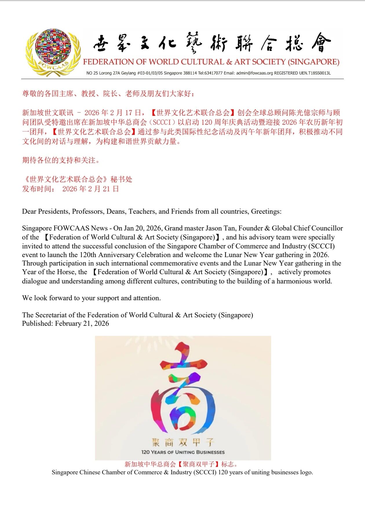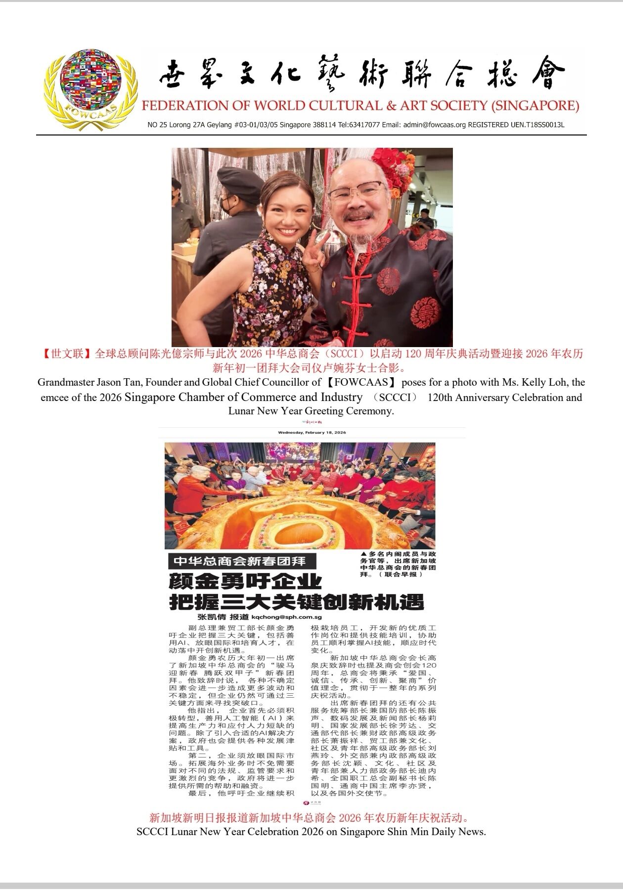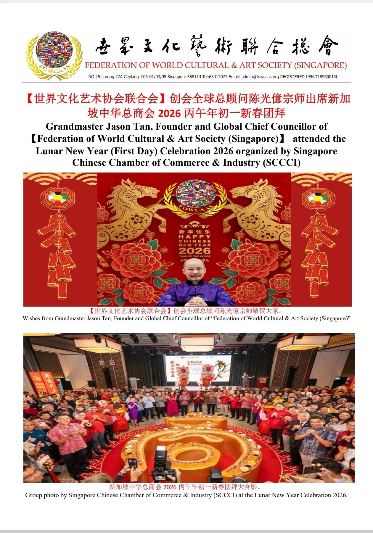 Grandmaster Jason Tan, Founder and Global Chief Councillor of 【Federation of World Cultural & Art Society (Singapore)】 attended the Lunar New Year (First Day) Celebration 2026 organized by Singapore Chinese Chamber of Commerce & Industry (SCCCI)