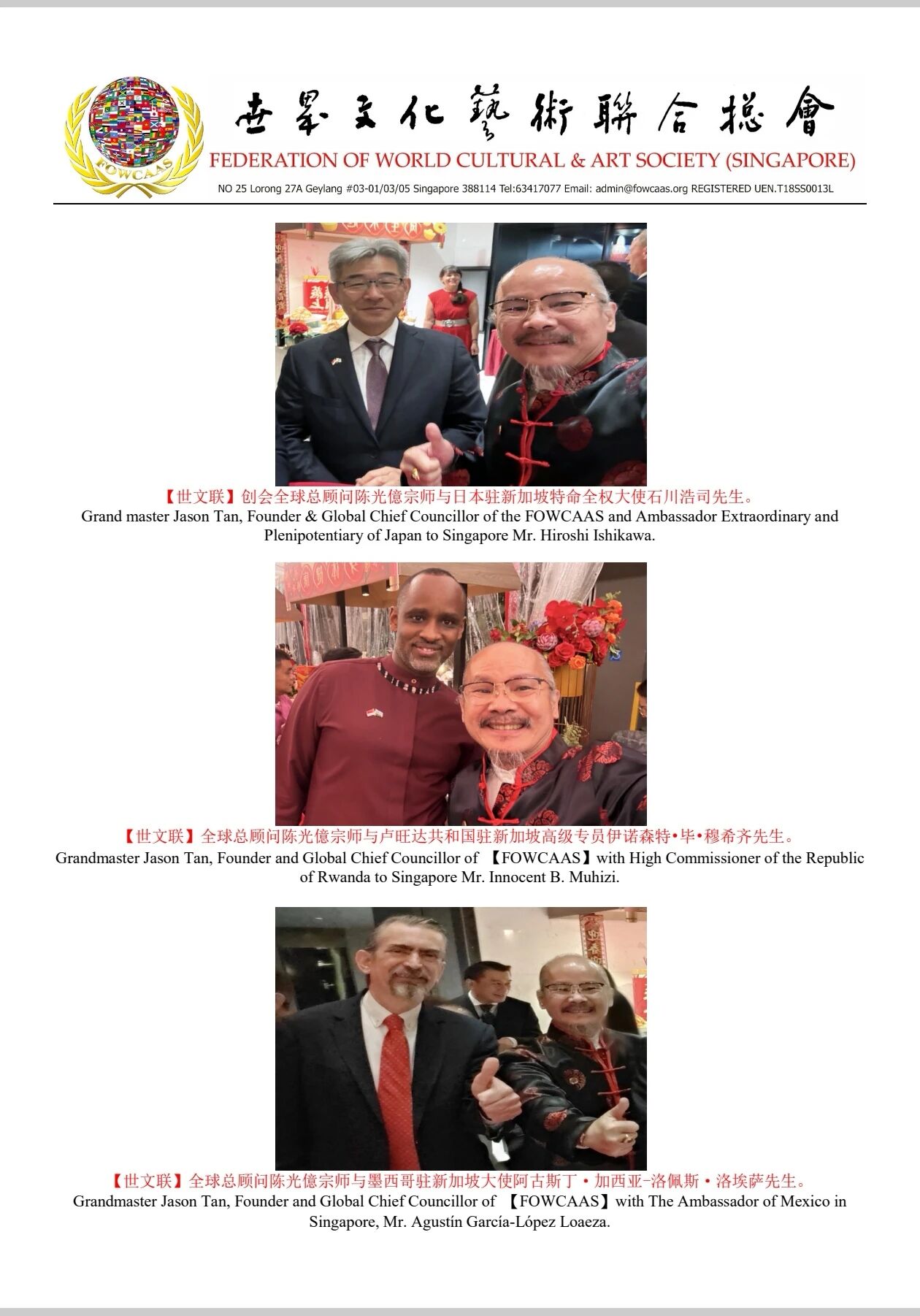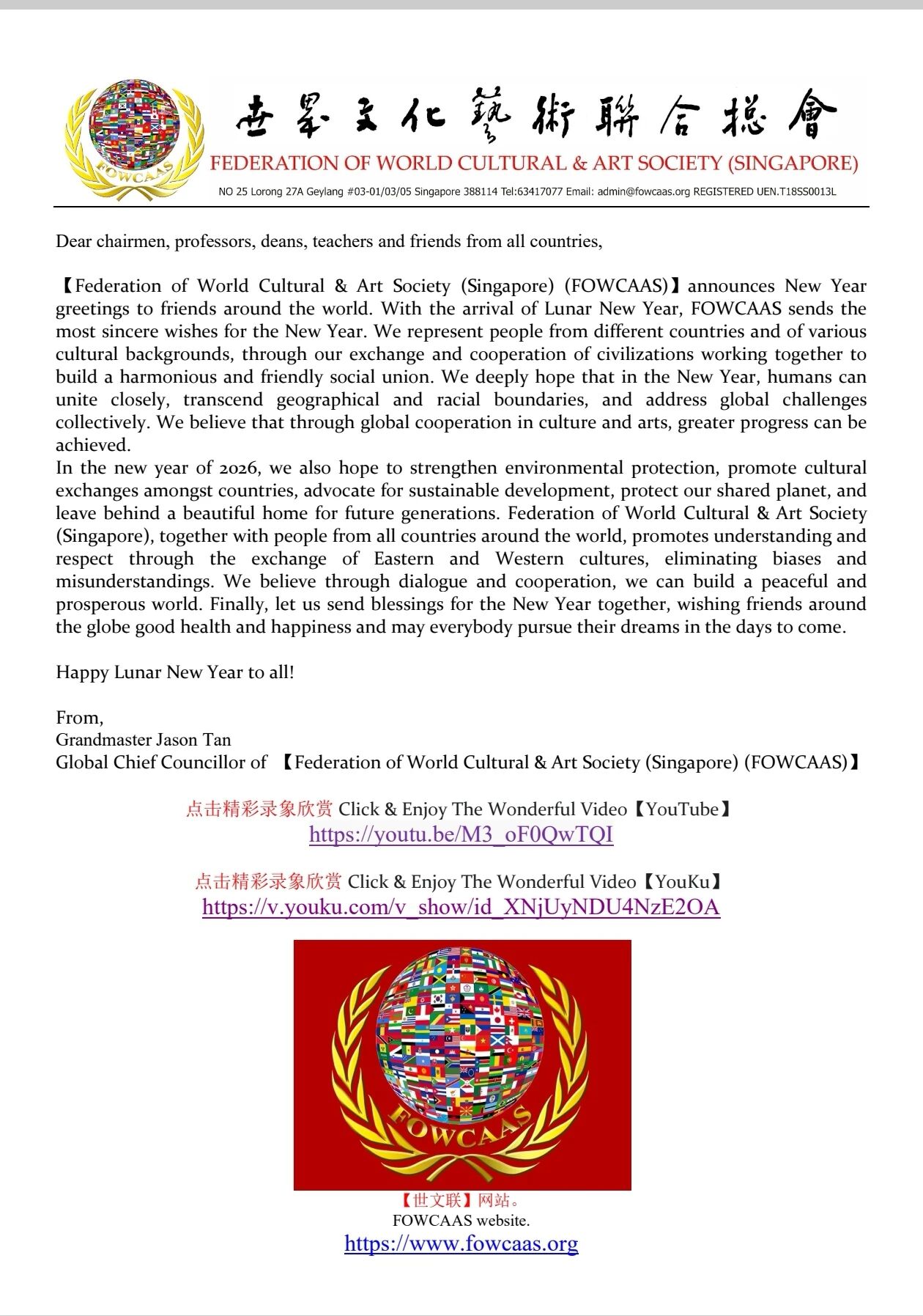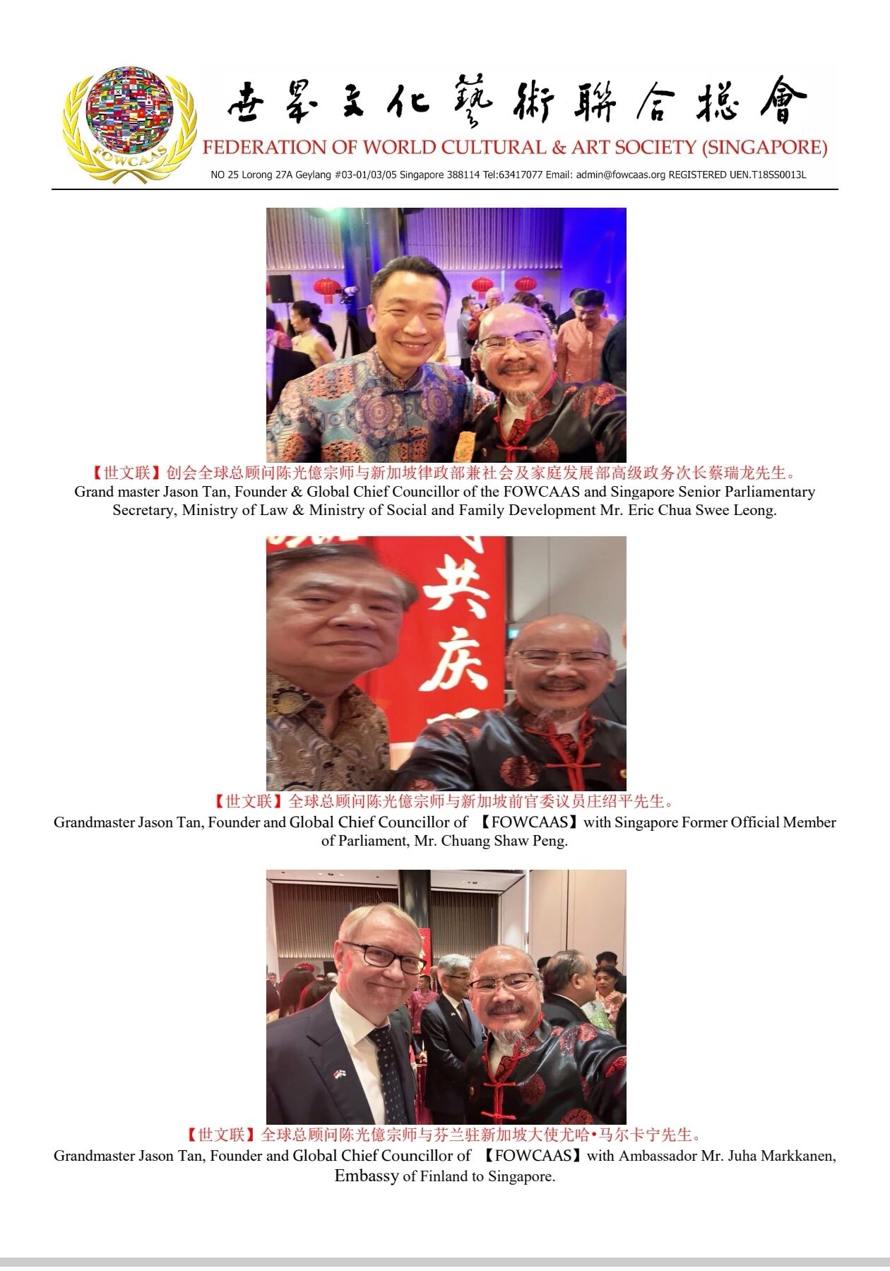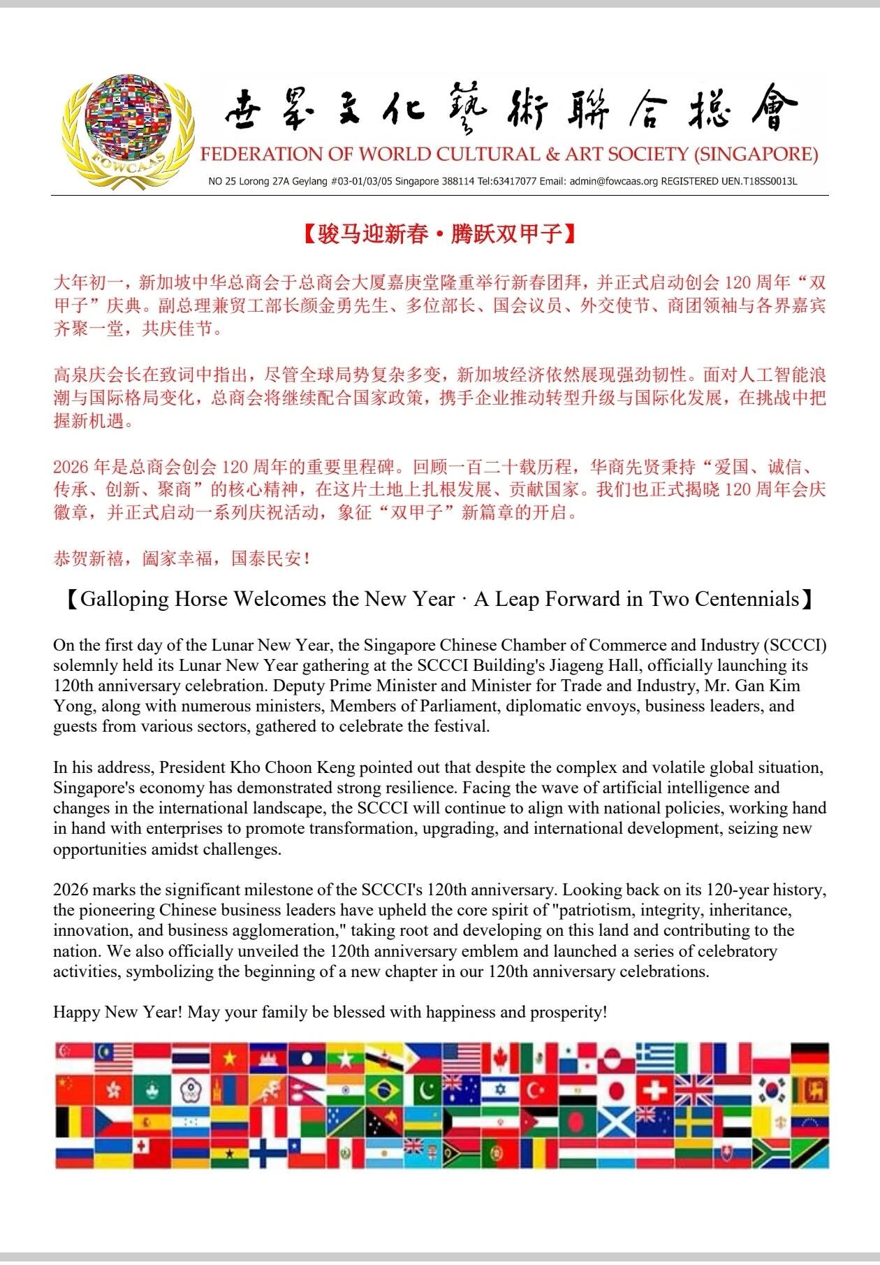 Grandmaster Jason Tan, Founder and Global Chief Councillor of 【Federation of World Cultural & Art Society (Singapore)】 attended the Lunar New Year (First Day) Celebration 2026 organized by Singapore Chinese Chamber of Commerce & Industry (SCCCI)