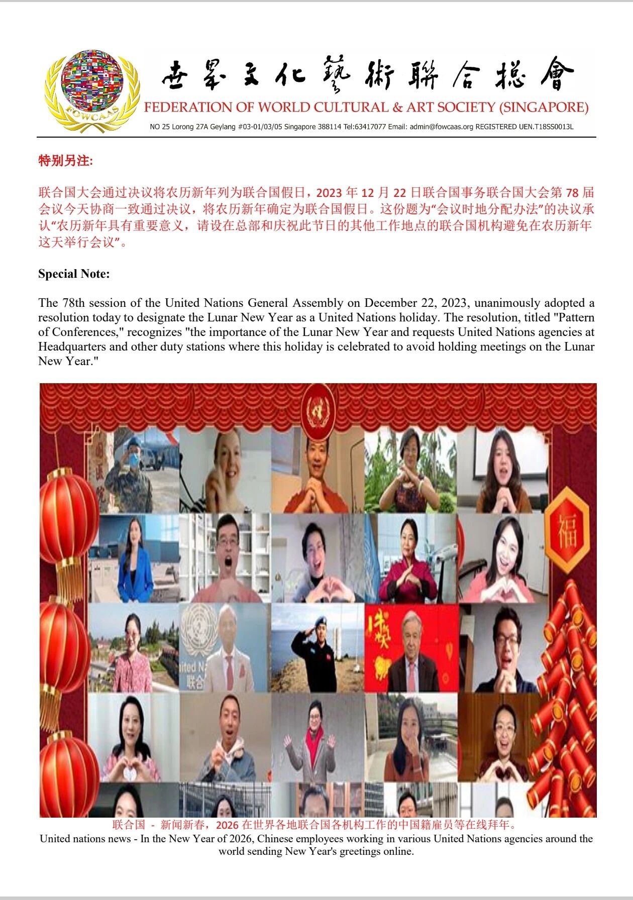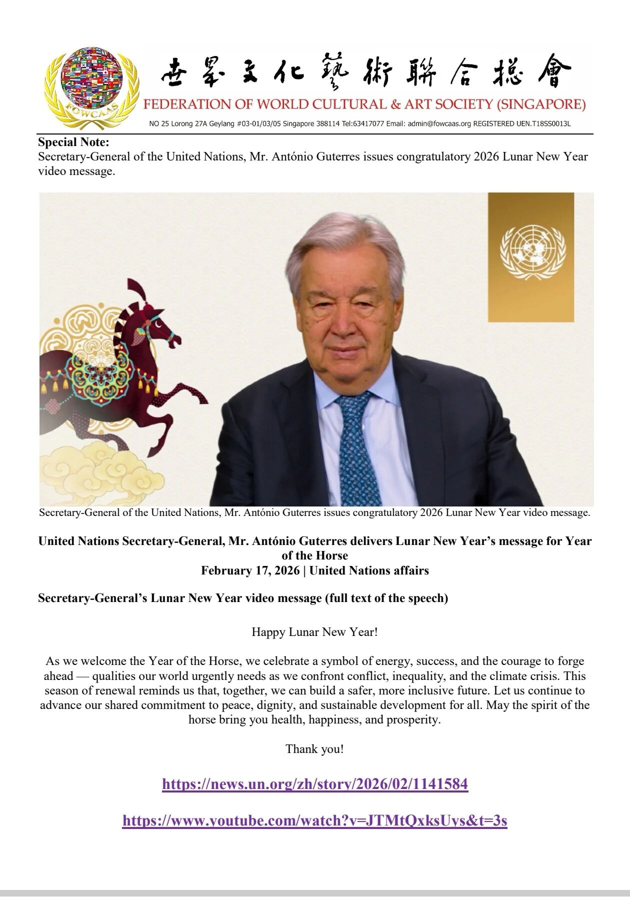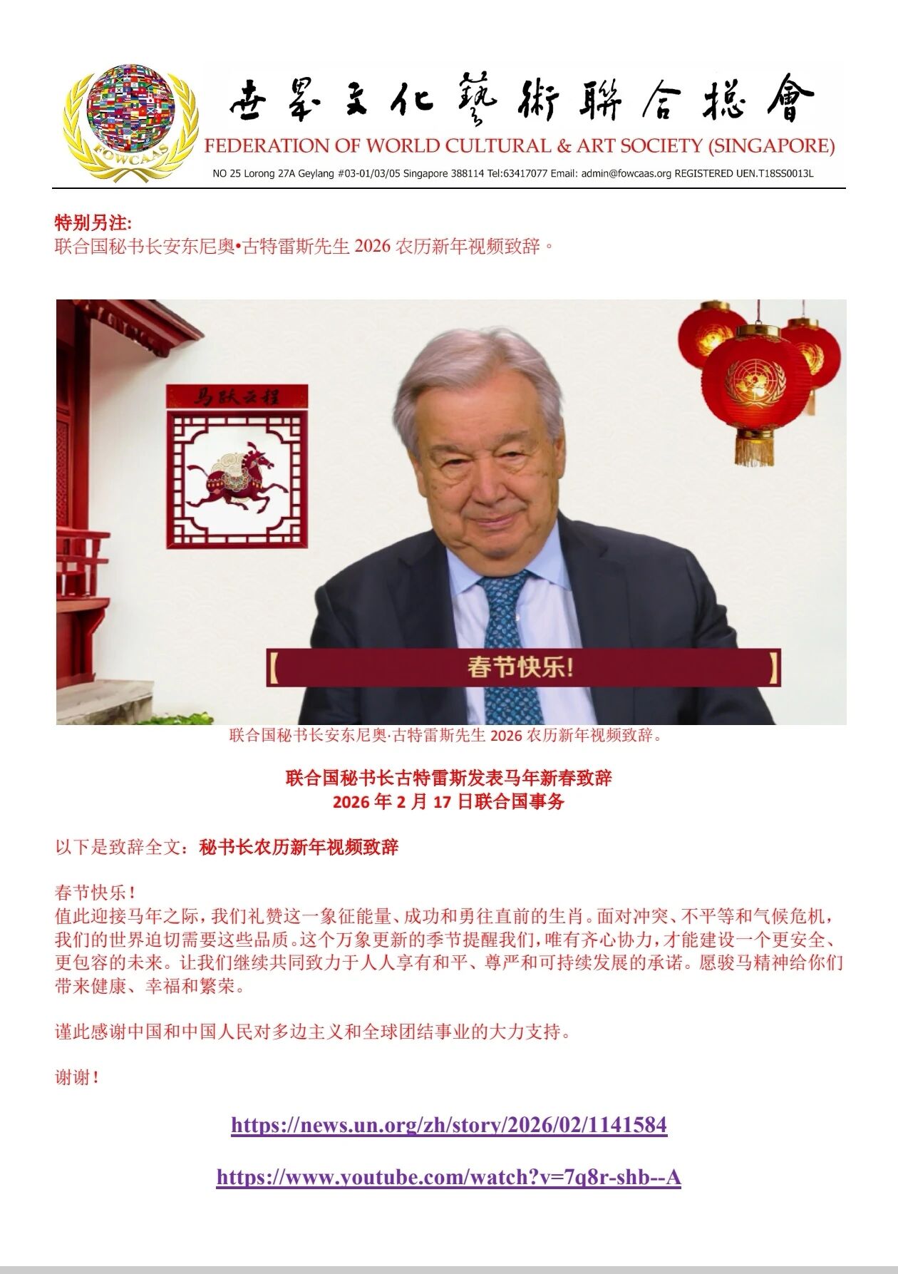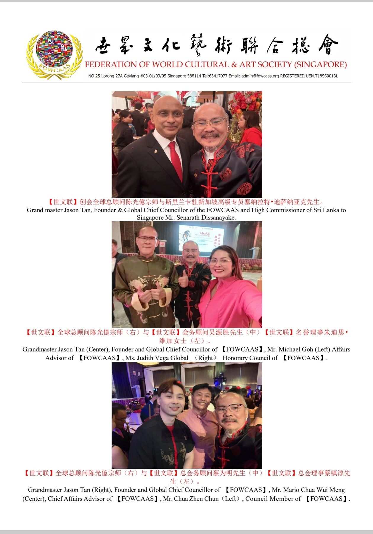 【世界文化艺术协会联合会】创会全球总顾问陈光億宗师出席新加坡中华总商会 2026丙午年初一新春团拜