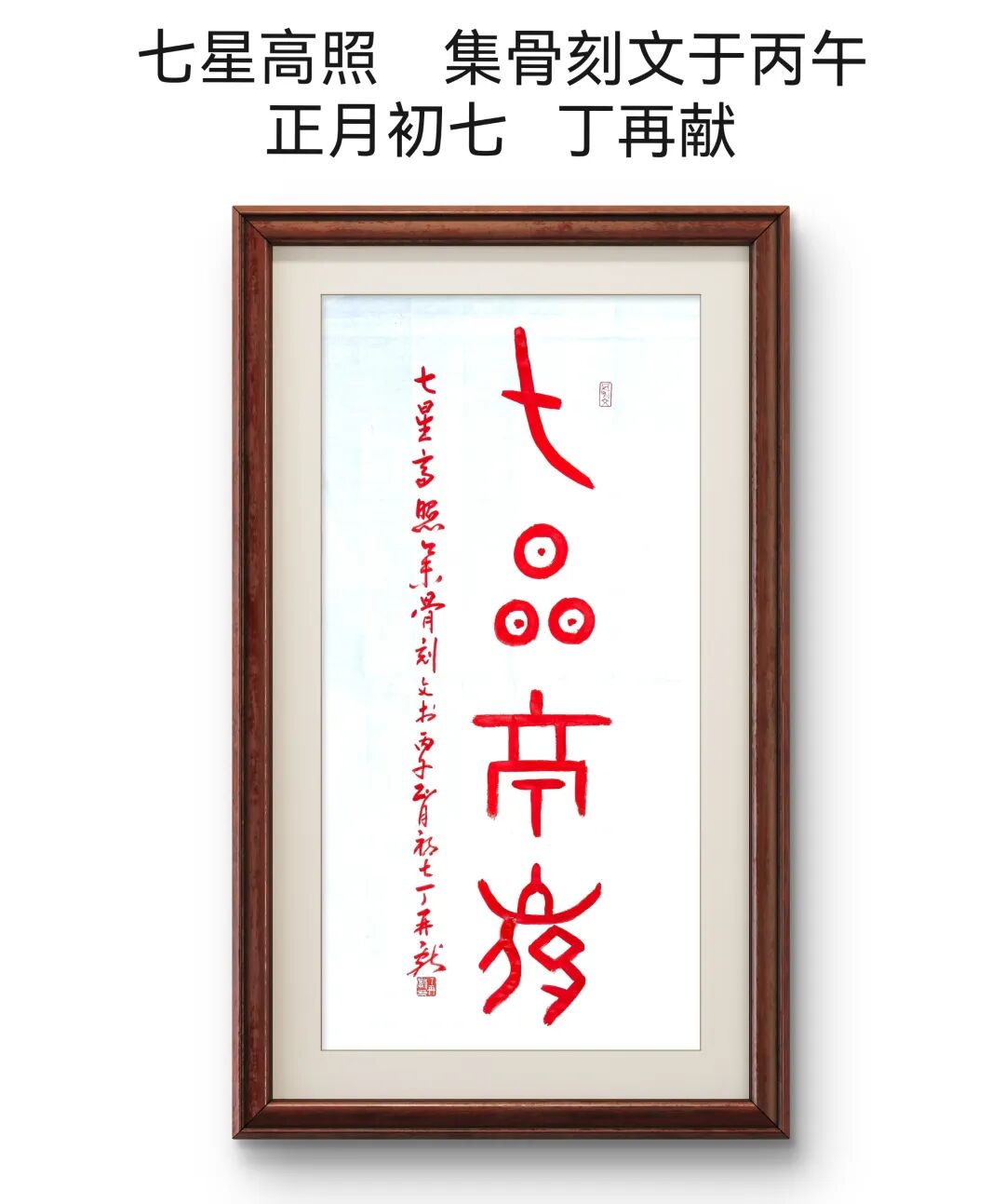 骨刻文,是镌刻在兽骨之上的文明初光,是中华文字的远古先声,承载着数千年前先民对天地的敬畏、对生活的期盼、对吉祥的向往。丁再献先生深耕骨刻文破译与传承数十载,以毕生心血解锁远古文字密码,让沉睡千年的文明符号重焕生机。此番于丙午人日书写“七星高照”,并非寻常笔墨,而是将上古文脉与新春吉庆相融,以最古老的文字,寄最真挚的祝愿,以朱砂红韵,辟尘俗邪秽,以七星瑞光,照人间万象。