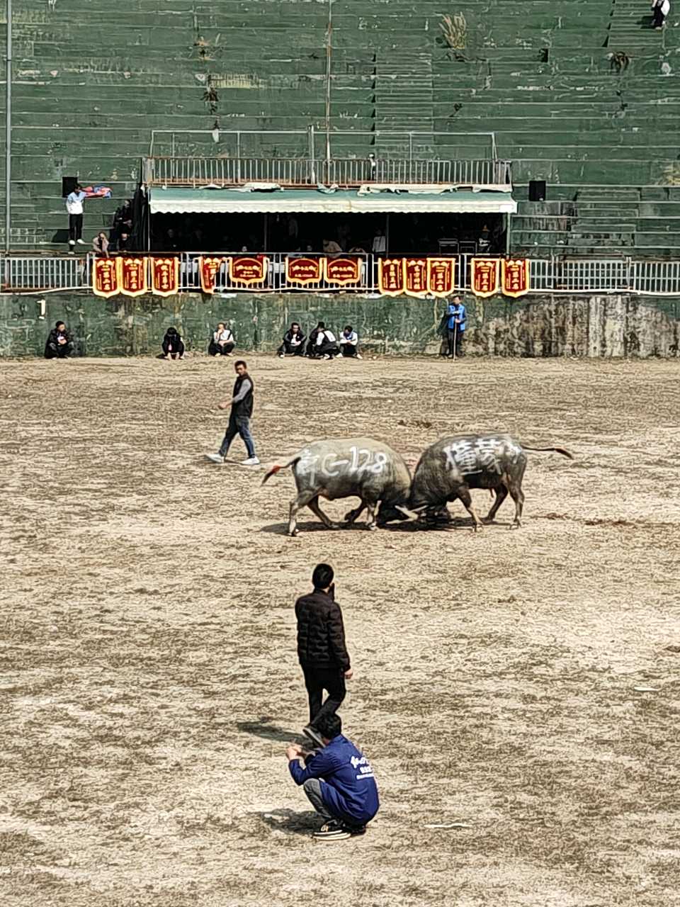 中午十二点钟左右,斗牛场地的两牛水牛已被工作人员牵着站在对面50米处,这场比赛首先由排号是“C”组的中型水牛开始角斗。“C”组的水牛比赛结束,然后才将“B”组的大型水牛进行角斗,这组的水牛比赛结束,才安排“A”组的特大型水牛进行角斗。这些参赛公牛都体格健壮,高大威猛,是水牛中的“英雄”,更是人们心中的光荣之柱。这些斗牛都来自独山县或者是外县不远之处。比赛开始之前先请牛主到主席台前先抽签再接顺序角斗。
