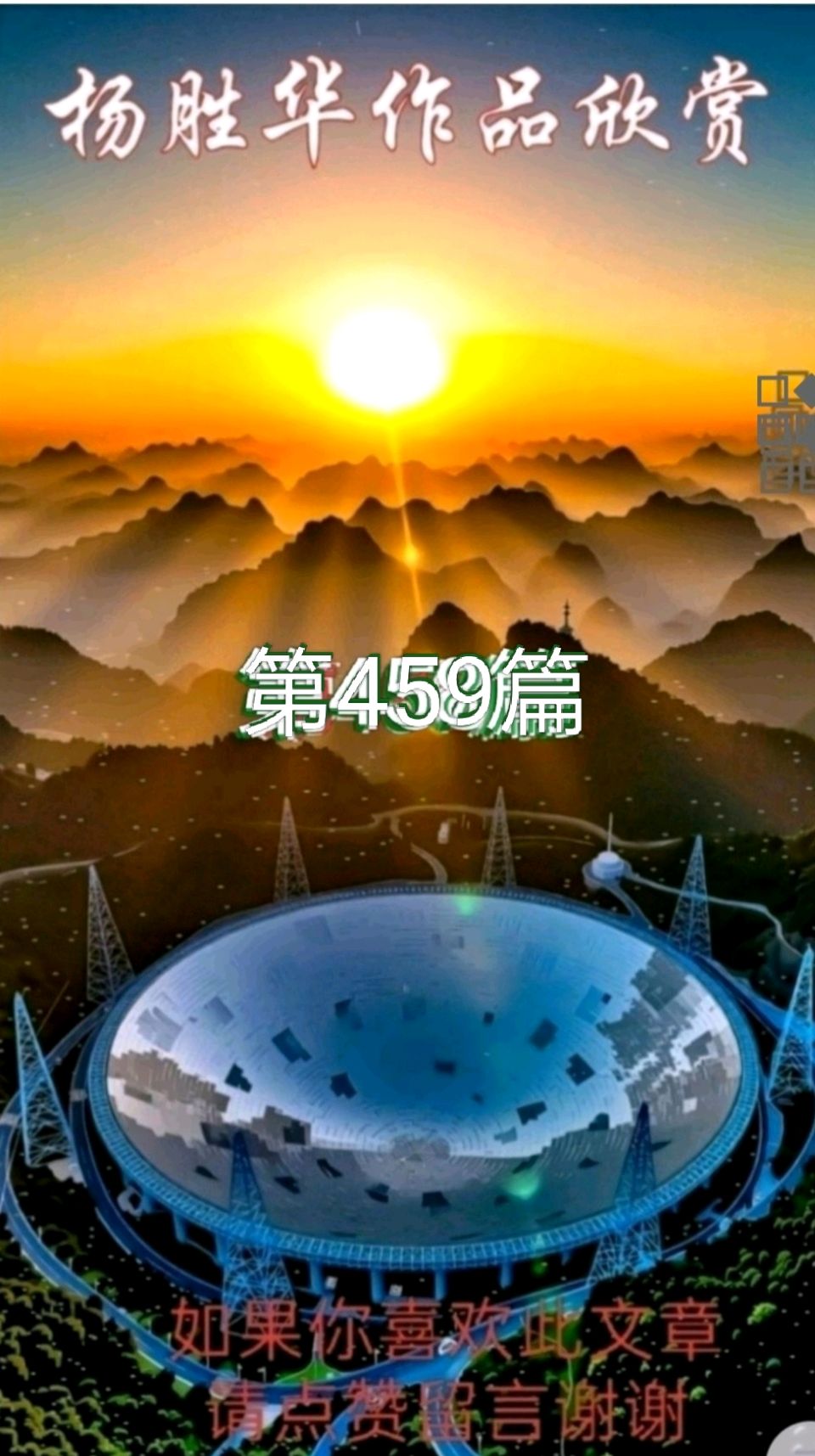 杨胜华,网名叫阳春白雪,苗族,贵州平塘人,生于上世纪六十年代初期,中共党员,退休教师,原系贵州省诗词楹联学会会员,中国楹联学会会员,现系中国诗歌学会会员,中国散文学会会员,中国新时代诗人档案库认证诗人,中国乡村杂志和宁古塔作家杂志签约作家,都市头条认证编辑,贵州省黔南州作家协会都匀市作家协会平塘县作家协会会员,曾在全国各大文学网站纸质及公众平台发布作品一千多篇,出版有个人诗歌专集《野草》《高山流水》及散文集《生于天文小镇》敬请关注。