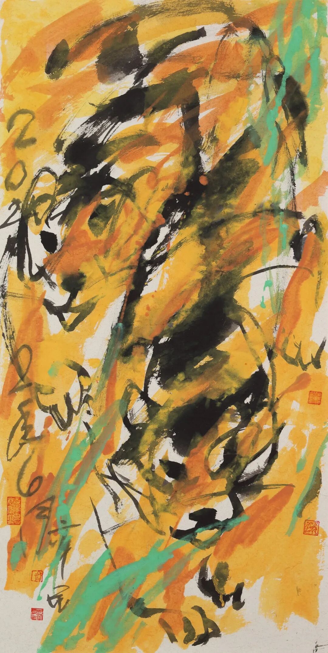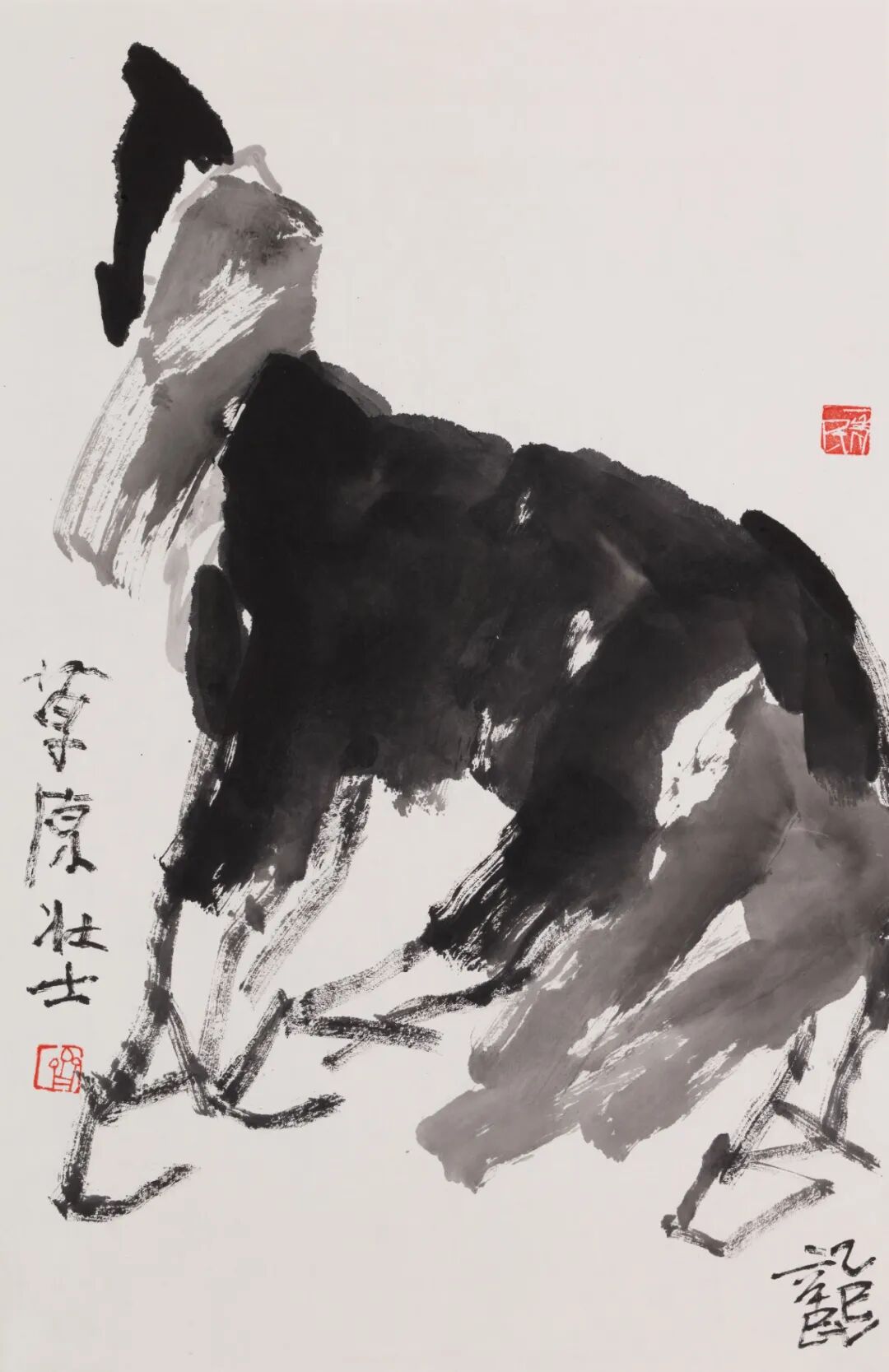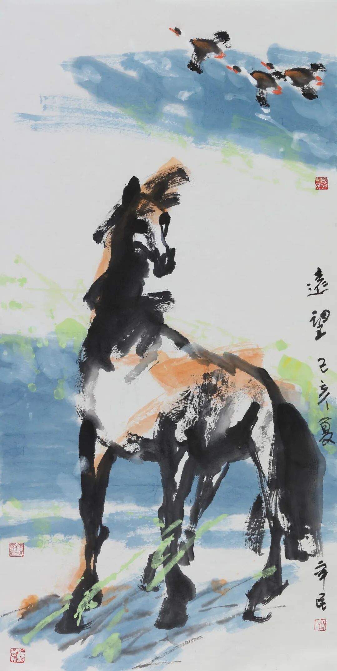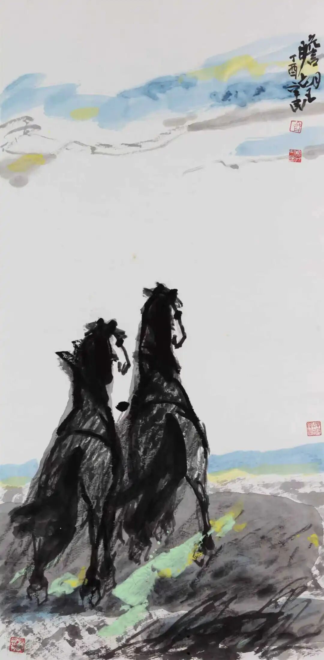 丙午画马,自是艺坛风尚,也在暗中竞技。然能革故鼎新、别开生面、自出机杼者鲜见,多为应景作画,凑个热闹,博些关注。盖因画马古有韩干、李公麟诸大家之传摹工绘、形神兼备,近有徐悲鸿一改前人画马之法——融合西方解剖学与东方笔墨,以泼墨写意表现马的雄健与中华民族之精神,成就了现代中国画之典范。时至当代,画马者虽众然出新者寡,能代表当今时代之精神和审美之高度者更是千万中难觅一二。今有幸观赏当代大写意花鸟画代表性画家齐辛民画“马”及其近期创作,不仅因其雄健豪放、色彩明丽的艺术风格而眼前一亮,更因看到其艺术语言和表现形式的诸多创新而心中一震——“齐家样”在继承传统的基础上融合现代审美和时代精神,让当代马画有望攀登艺术的高峰、造就新时代的经典。这并非鄙人的大胆溢美之评,而是基于两点粗浅认知。其一,马之造型一改前人求“似”的创作传统,而转向当代梦寐以求“不似”的突破这不仅丰富了国内外画坛表现“马”的艺术语言,而且其艺术创作的超前性、实践成果的意义和价值点目前来看也是无出其右的;更令人敬佩的是,已逾鲐背之年的艺术家在衰年变法过程中所展现出的开拓精神、创新魄力,可望近现代大家黄宾虹、齐白石诸贤之项背。其二,马之色彩运用得当,既基于“齐家样”的明丽鲜亮又尽显当代审美之风尚,让其创作雅俗共赏;而在创作中艺术家展现出融汇中西、尽取诸法的开阔视野和博大胸襟,则获得了中外画坛的盛赞。画马一事,先秦已盛。今所见商代殷墟妇好墓出土的玉马,湖北荆门包山大冢出土一件绘有人物车马出行场面的楚漆奁,乃中国美术史上较早出现的马图像,它们展现出了朴素庄重又生动传神的艺术“马”之原始风貌。至秦代兵马俑、汉代铜奔马及画像石上的各类马图像,更显马之英姿矫健、气宇轩昂;然在魏晋南北朝时期,多陶马存世,虽惟妙惟肖,然其造型艺术多有欠缺。时入盛唐,画马进入鼎盛时期,名家辈出,尤以曹霸、韩干最为出色,此一时期的画马虽均为写实之作,然个性鲜明,震古烁今。宋代画马的佼佼者唯李公麟,然他多学韩干,摹古水准高超。元人画马,首推赵孟頫,线描工细劲健,融合唐人青绿重彩与宋人笔墨技法,体现了赵孟頫“书画同法”的艺术主张;另有任仁发创作的《二马图》以肥马喻贪官“肥一己而瘠万民”,则将画马带向了政治隐喻的“写意”之路。明清画马者虽众,然凭此技而闻名遐迩者寡,更多还是将马作为陪衬人物或者山水之物。如仇英的《双骏图》,其骏马形象常在其人物画中出现,以烘托人物;意大利籍清代宫廷画家郎世宁的《百骏图》,全卷色彩浓丽,构图复杂,别具意趣——此处更需一提的是,《百骏图》诞生于清宫绘画兼崇并推传统文人画和西方纪实性艺术的独特时期,由此也开启了中西方艺术在中国深刻融合发展的历史。近现代以来,国运多舛,然画马一事则迎来一大变革,其践行者徐悲鸿亦因此开宗立派,名垂千古。徐悲鸿一改传统的画“马”笔法,运用写意笔墨结合西画的光影技法,通过拉长马腿比例、夸张鼻孔造型等艺术处理,塑造出具有立体透视效果的马形象——此“马”既融合西方解剖学造型的精准性,又保留了中国水墨的写意气韵,从而成为中国美术史上画马乃至艺术创作的时代制高点,更成为中华民族精神的视觉象征。中国画“妙在似与不似之间”——齐白石作画的美学追求,被后世奉为中国画创作之圭臬。然近现代以前中国画之“马”皆在求“似”上殚精竭力、各显神通,即便是徐悲鸿笔下的“奔马”也未脱离求“似”的艺术表现范畴。此外,自20世纪至今,虽有西方画论如“印象”“解构”“立体”“观念”等诸多思想无不影响着中国画的发展,画马者亦因此而多方求索——或中西融合,或重开炉灶,凡此种种的努力和尝试并未有大突破和令人心悦神畅的创新。由中国美术史中画马一事的发展脉络和演变轨迹细观之齐辛民于丙午年前后创作之“马”,其最震撼人心的是他运用大写意的笔墨,以更为抽象的点、线、面——多用粗线、大块面,胸怀破而后立的勇气,“写”出了马的立体形象及其身处的深远意境,这一成功尝试不仅开拓创新了中外画“马”的视觉图像和艺术语言,也为大写意在新时代的发展树立了典范,且有望突破当代画马“有高原而少高峰”的时代困境。其实,早在20多年前和10多年前的上上轮和上一轮生肖马年,齐辛民也画马。但如今回头再看,那时候的马虽风貌写意然形色写实,可以说是用写意的笔墨来表现马的艺术之美、客观之美;而他的丙午写马则走向了于“不似”中求马画之时代风貌和突破经典的全新创作之路。更值得研究的是,从中国美术史中画马的轨迹演变来看,齐辛民丙午“写”马的用笔完全出自传统的写意笔法,即把最能代表所画对象现实特征和精神特征的点、线、面提炼出来,然后重新组合、创作,而且重在写意而不在写实,甚至有时候特意“舍实”而“取神”——即便是近现代“画马”宗师徐悲鸿,是用写意的笔墨来画马,但整体风貌还是在求“似”的创作范畴中缔造了近现代中国画的经典。而齐辛民的丙午写马则于愈加抽象的笔墨中全心全意地追求写意,这是他对中国画自近现代之前画马皆追求“形似”和“神似”的“写实”之路的一大开拓。由此体现出齐辛民于艺术创作上竭力所