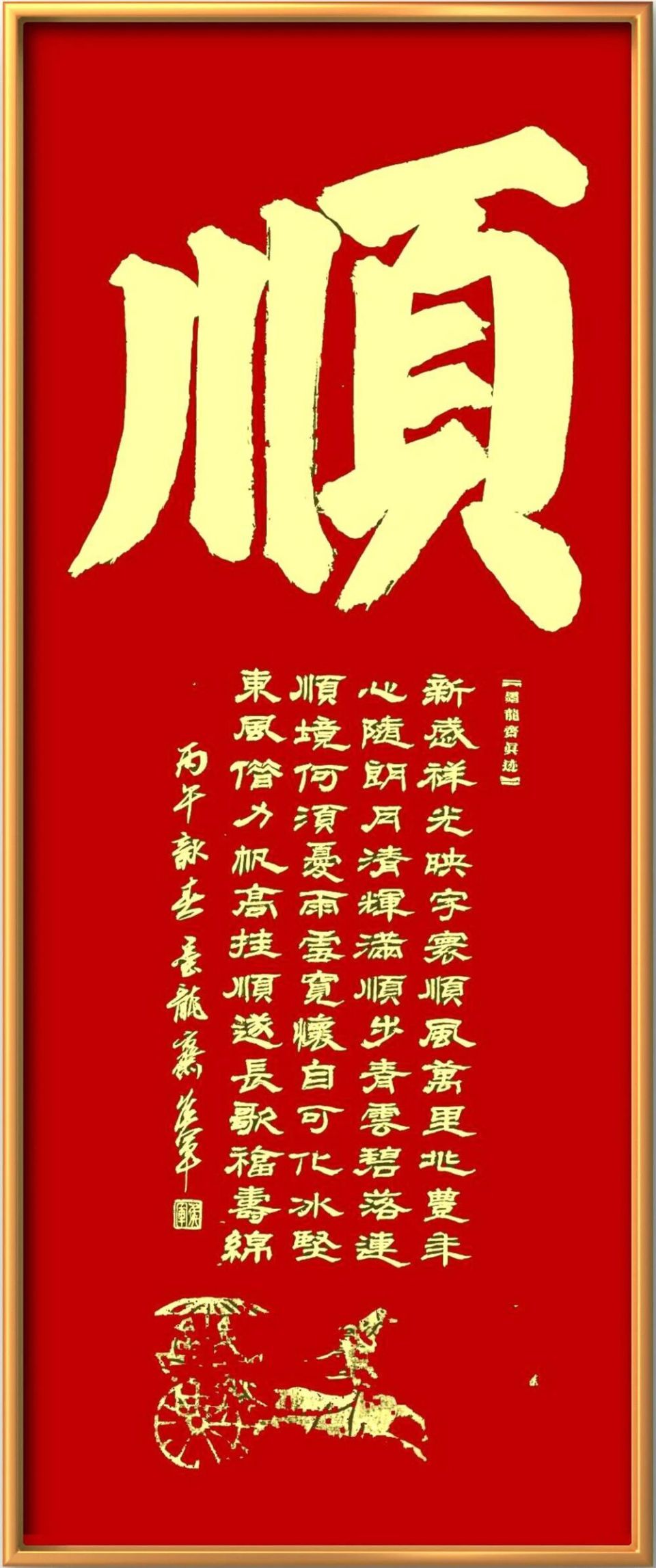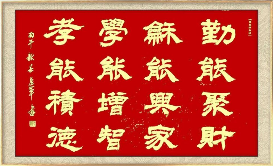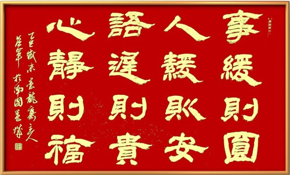 得篆书的文化功成后,先生又深修两汉隶书,功取十碑,从他的隶书作品中可发觉,先生是把华山,礼器,乙瑛,石门等诸多碑隶,统收笔下,一碑不漏,反复卓研,极力体验。临池诀有云,引过其曲,转蹲其锋,不欲出,须暗收,这是隶书的笔法要诀,先生的笔法深得其意,作品用笔以圆化方,以直为曲,笔锋微微收紧,出锋渐渐外推,方折化半圆,如负芒刺则善,笔法正然。先贤包世臣曾言,凡字无论疏斜正,为有精神挽结之处,是为字之中宫,反观先生的隶书结构,正是完美切合了此高观明点,其字中宫疏朗,直线点弧,穿梭其间,竖作笔线加粗,四周笔画通边,通体呈现出了外紧内松之势,敢问如今书坛隶书之作,能达此功者,能有几人,如此隶作,观之岂能不令人称奇也!