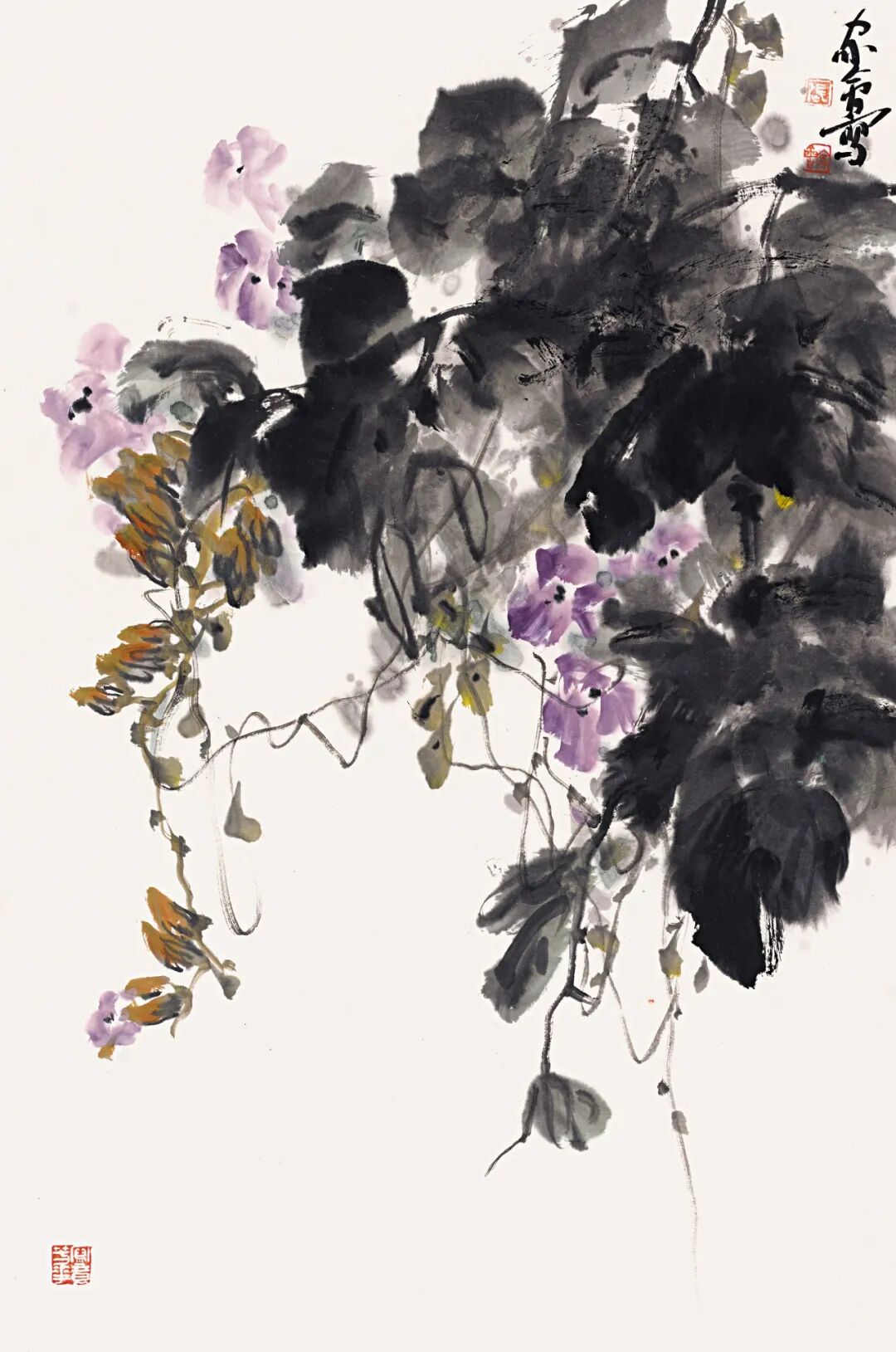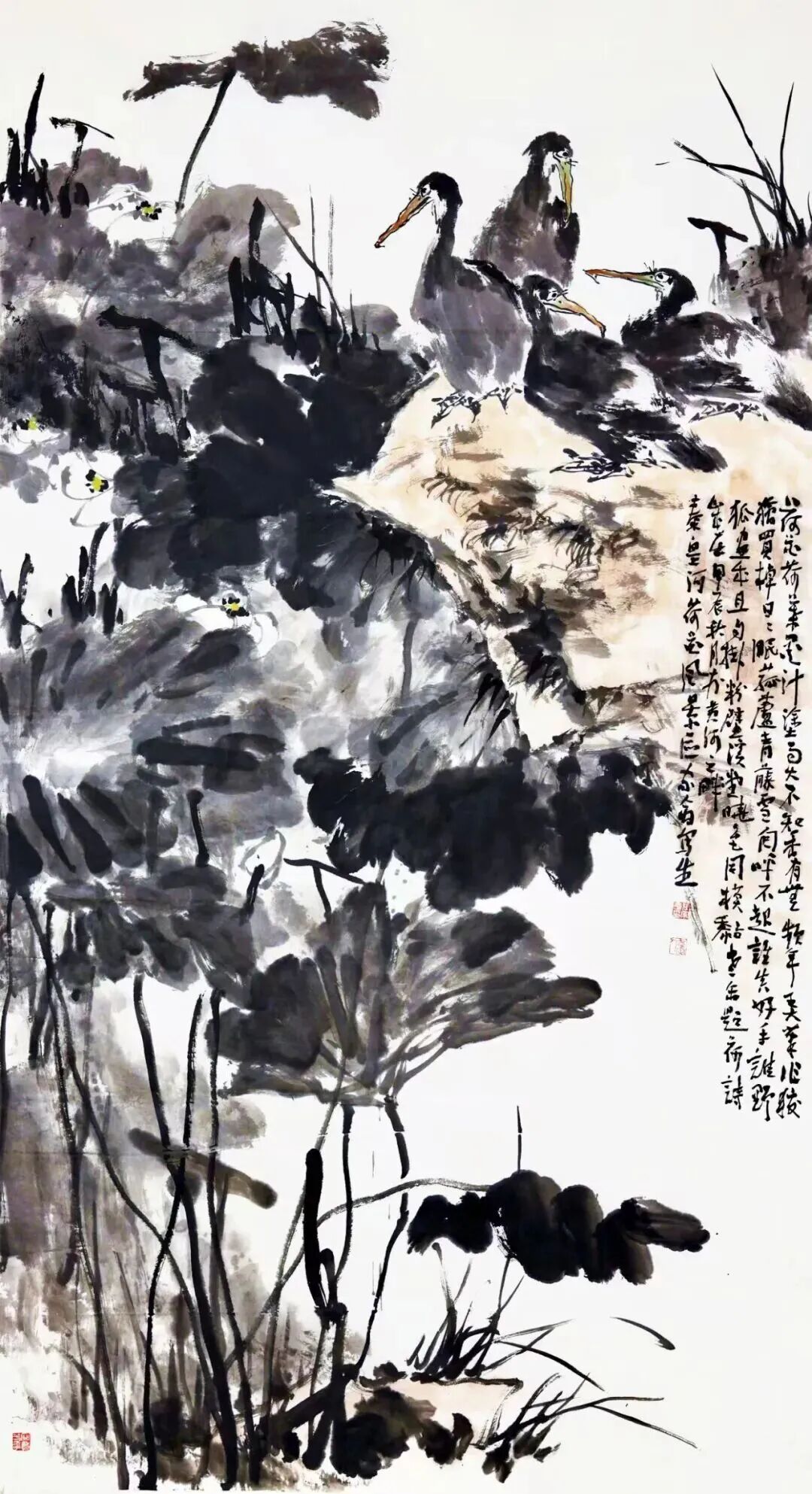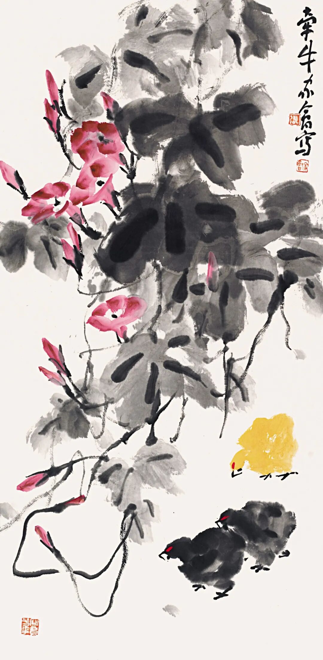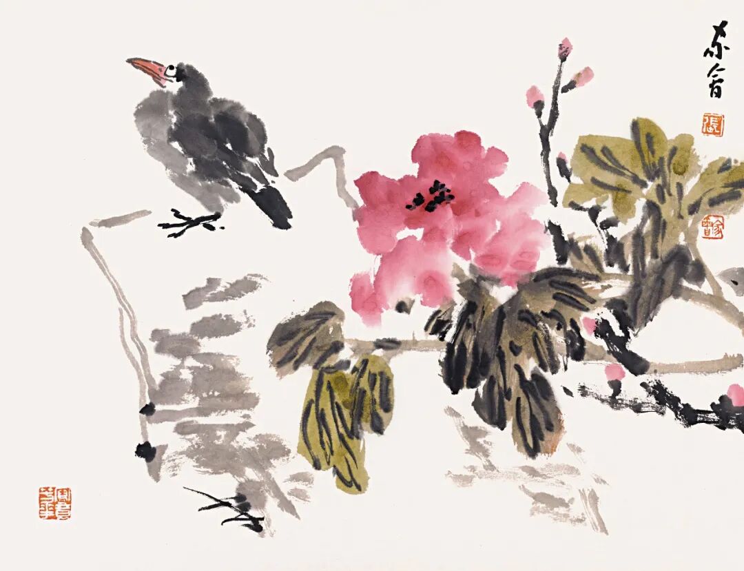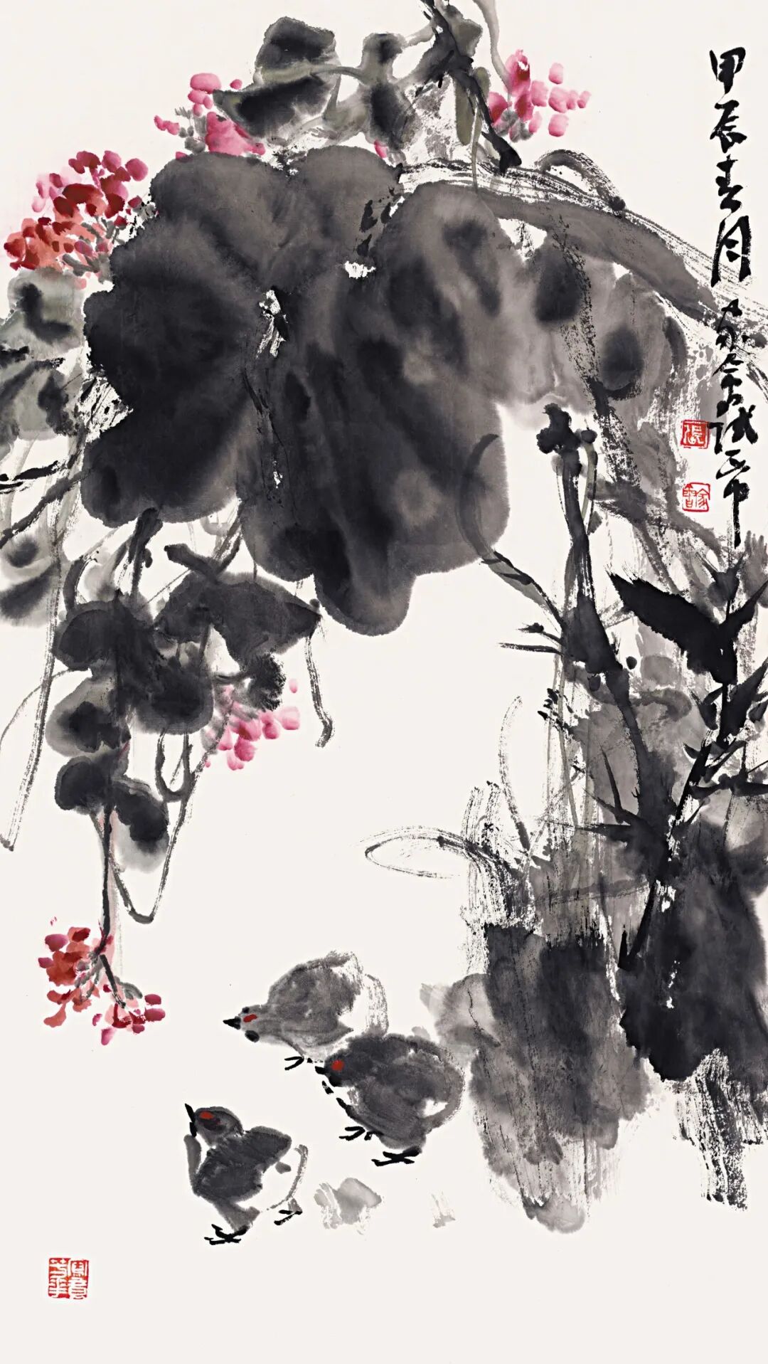 其又兼具了造像塑形和寓意明鉴之功效,其形态是一种介于具象与抽象之间、可被描述的模糊状态。正是这种笔墨形态与意象符号的生成转化,使家会先生写意花鸟画有了丰富的表现力、概括力和寓意性。其“笔墨”形态是刚柔相济,跌宕多姿,气势中有节奏,浓淡里见色泽。