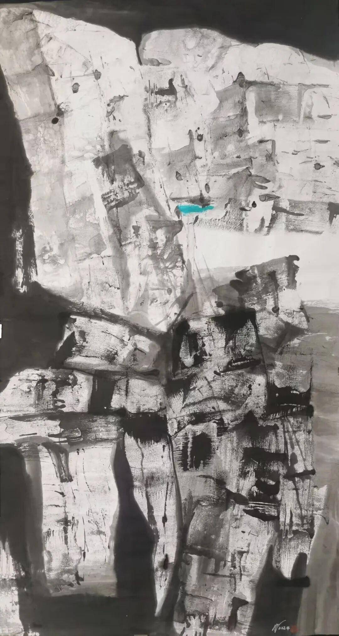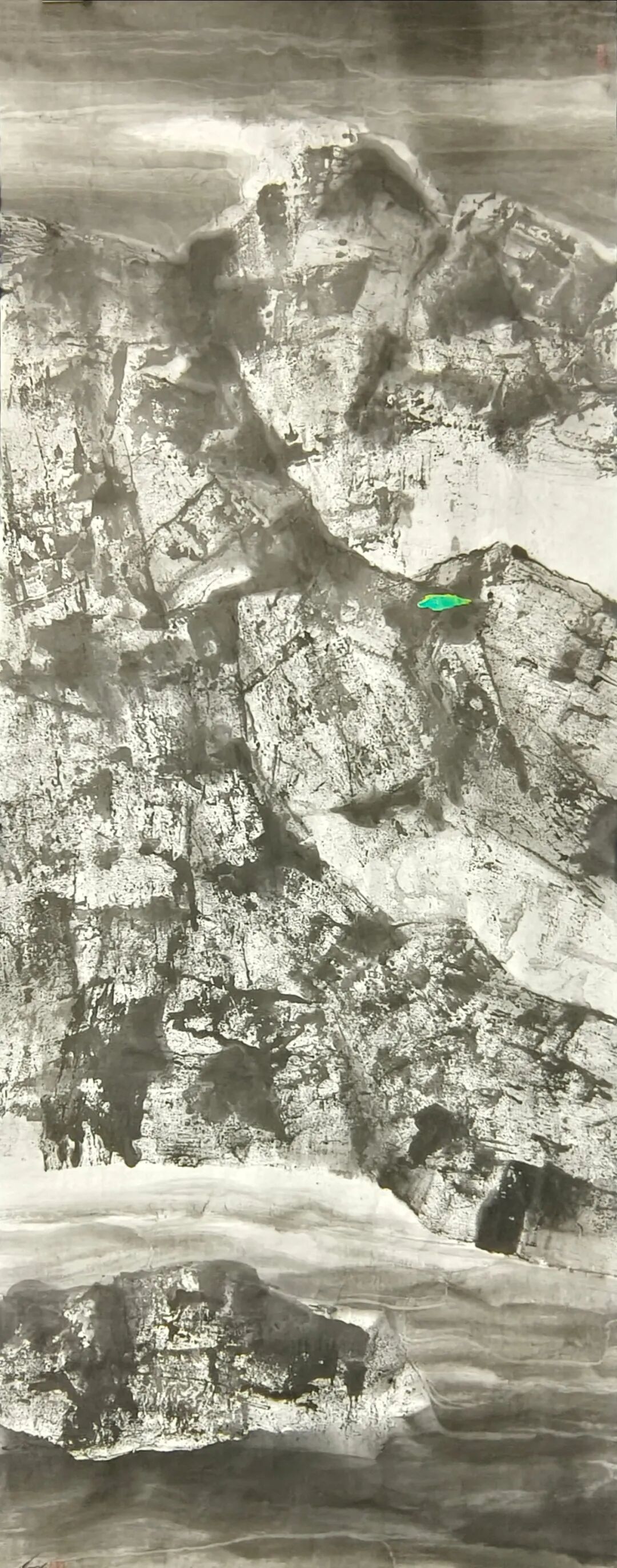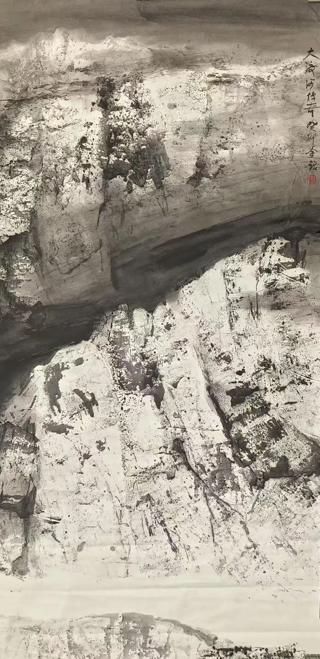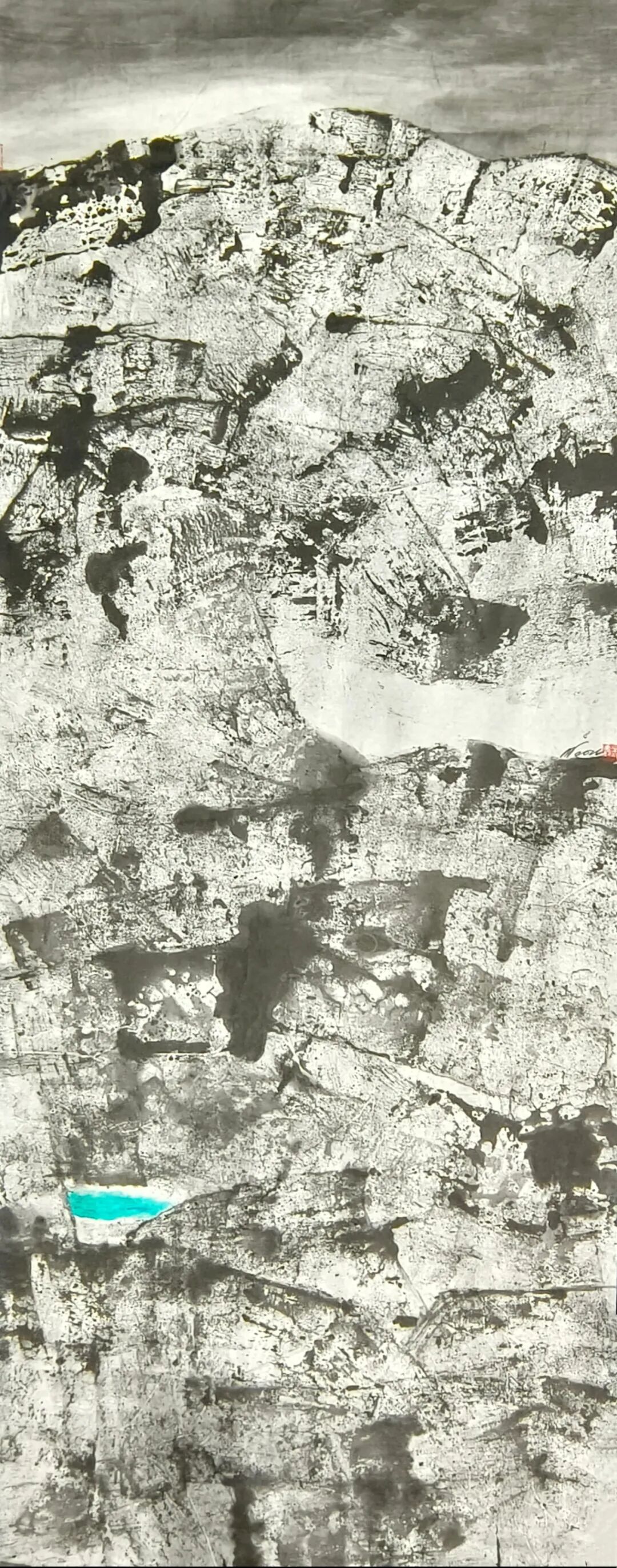 在构图上,米金铭摒弃了传统山水画“三远法”的平稳布局,转而采用更具现代构成感的视角。他常常将峡谷的纵向纵深与横向开阔并置,以大面积的墨色块面挤压留白,让画面形成强烈的视觉冲击。如《峡谷惊雷》中,浓黑的山岩占据画面主体,仅在缝隙处留一抹浅淡的云气,岩石的肌理与云气的轻盈形成鲜明对比,仿佛能听见峡谷间回荡的雷声,感受到自然力量的磅礴。这种构图方式打破了传统山水的平和之美,以紧张的视觉关系传递出大山峡谷的雄奇与险峻,让观者在画面中感受到自然的威压与震撼。而笔触与墨色的交织,更让每一幅作品都成为独一无二的艺术存在——肌理的不可复制性,使得画面的每一处细节都充满偶然与必然的碰撞,淋漓尽致地展现出自然山水的野性与生命力。这种张力不仅停留在视觉层面,更能穿透纸背,让观者的心灵与自然产生共振,体会到大山峡谷所蕴含的雄浑气魄。