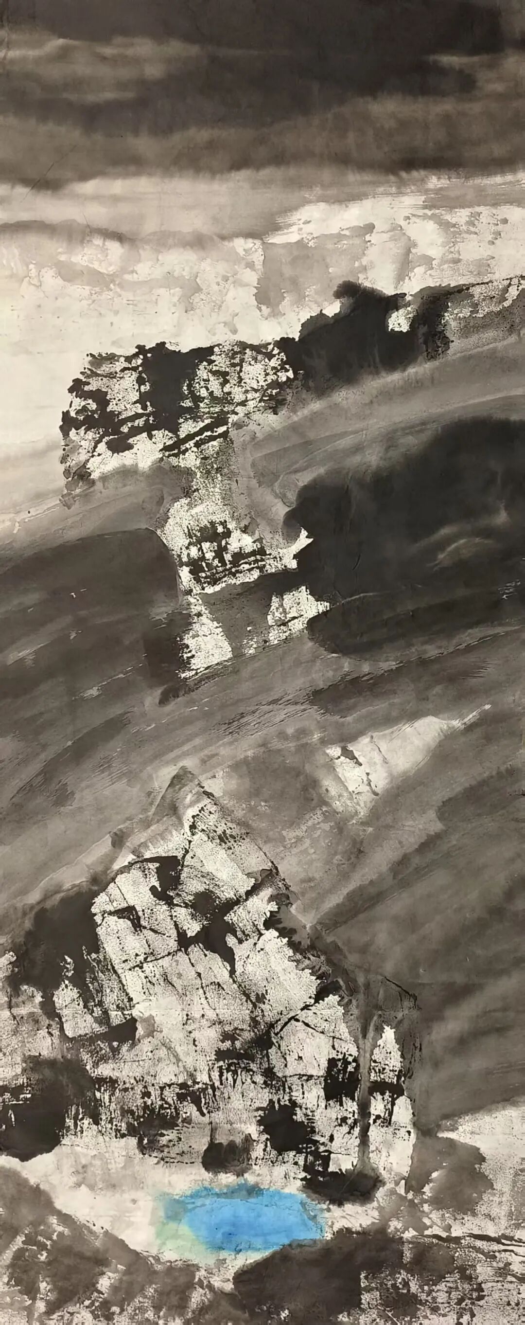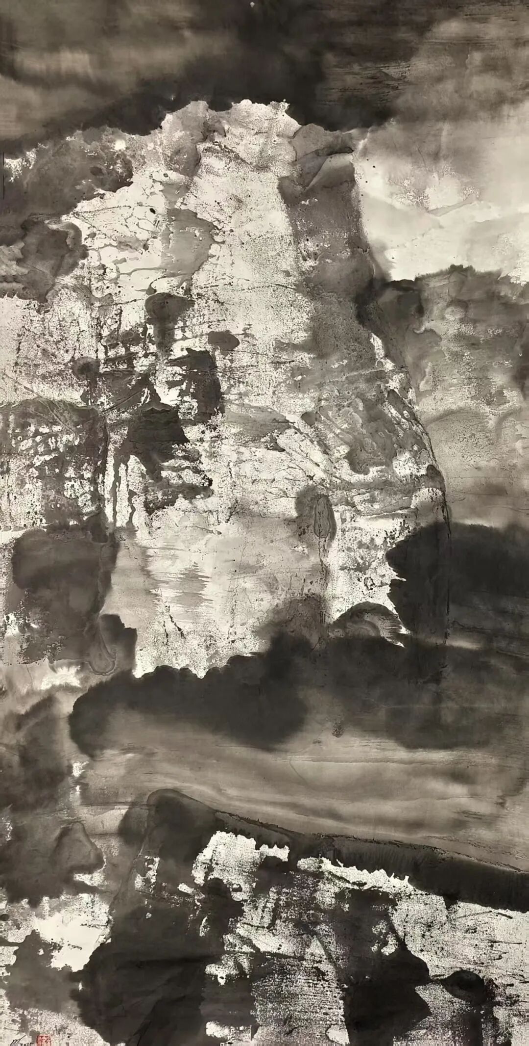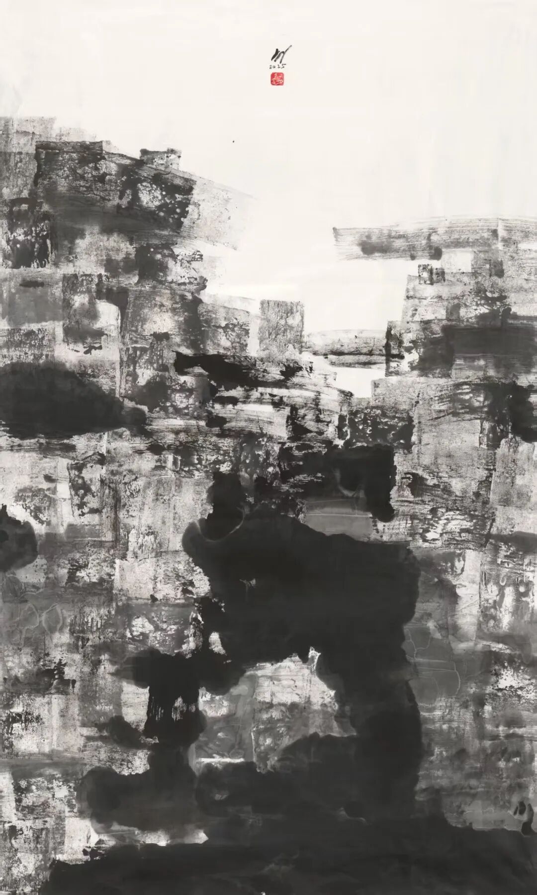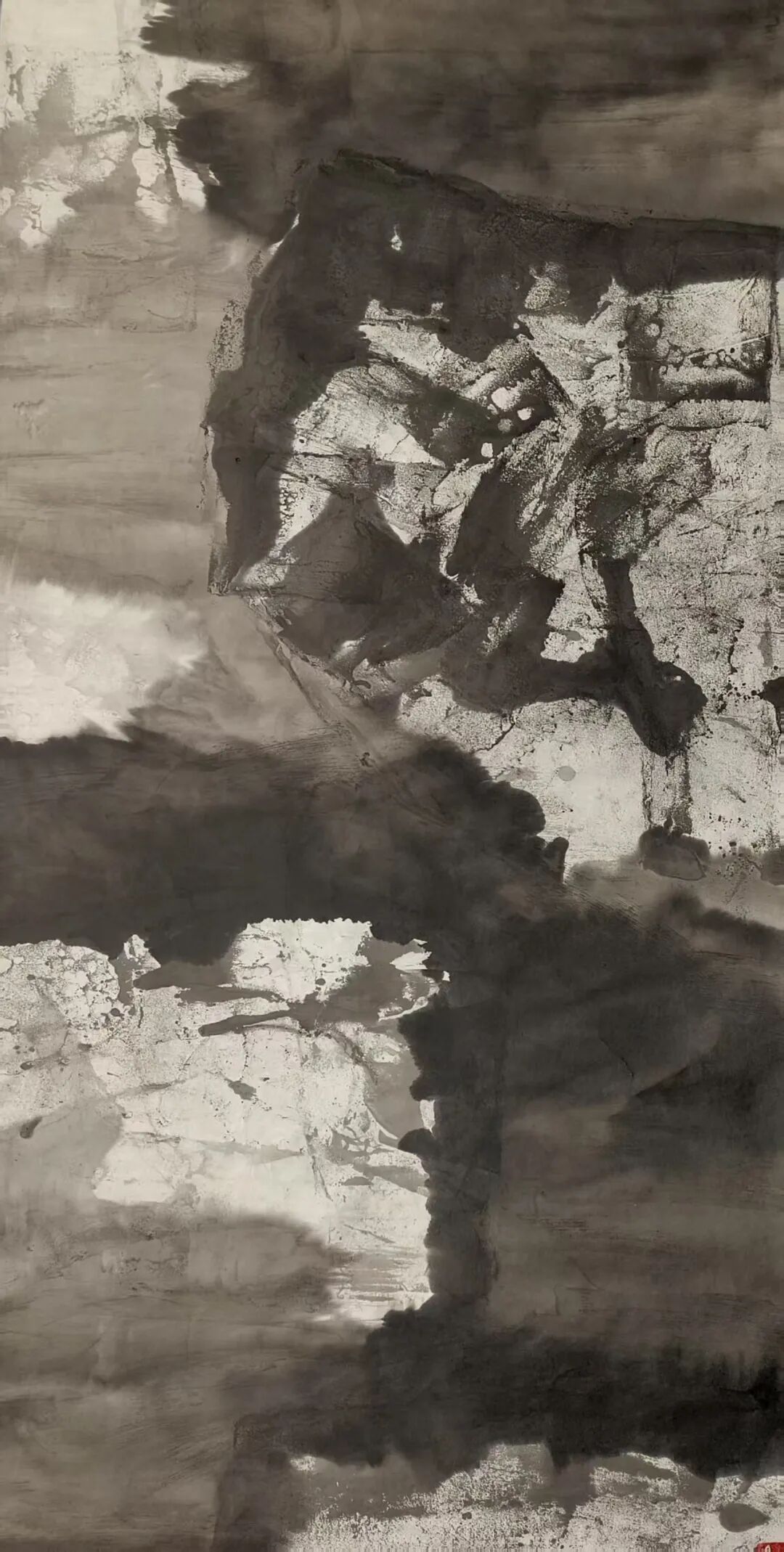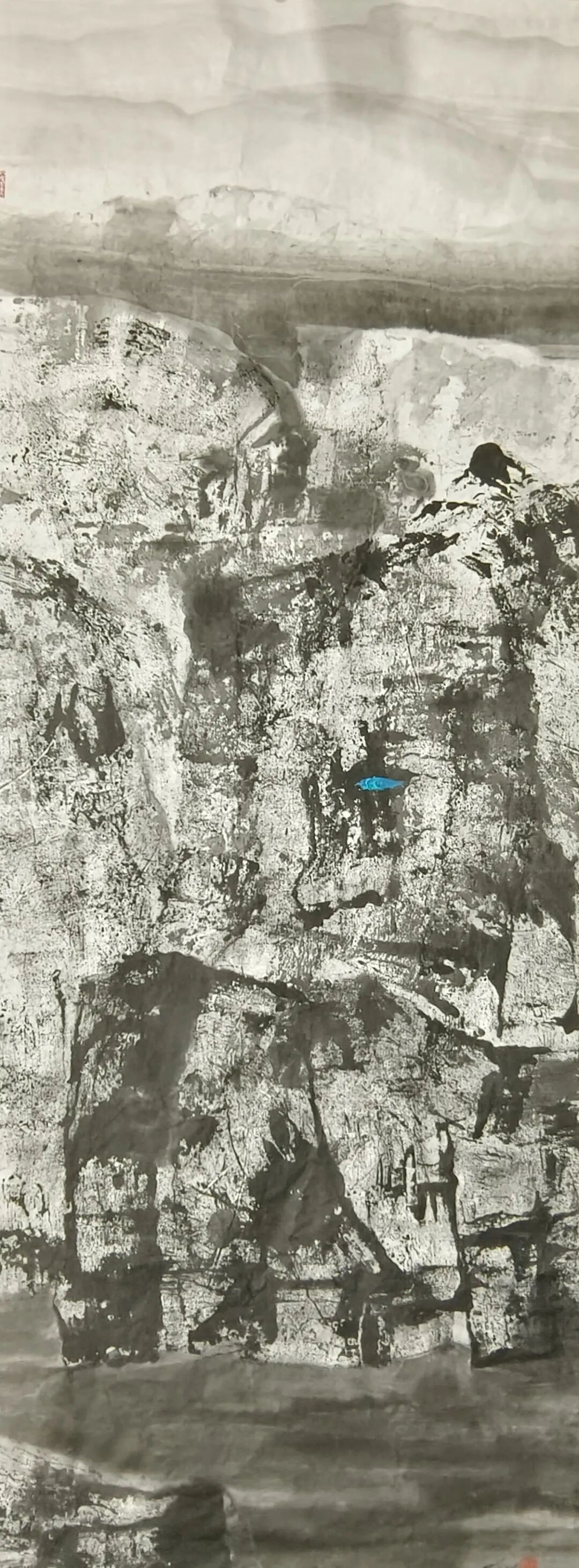 在构图上,米金铭摒弃了传统山水画“三远法”的平稳布局,转而采用更具现代构成感的视角。他常常将峡谷的纵向纵深与横向开阔并置,以大面积的墨色块面挤压留白,让画面形成强烈的视觉冲击。如《峡谷惊雷》中,浓黑的山岩占据画面主体,仅在缝隙处留一抹浅淡的云气,岩石的肌理与云气的轻盈形成鲜明对比,仿佛能听见峡谷间回荡的雷声,感受到自然力量的磅礴。这种构图方式打破了传统山水的平和之美,以紧张的视觉关系传递出大山峡谷的雄奇与险峻,让观者在画面中感受到自然的威压与震撼。而笔触与墨色的交织,更让每一幅作品都成为独一无二的艺术存在——肌理的不可复制性,使得画面的每一处细节都充满偶然与必然的碰撞,淋漓尽致地展现出自然山水的野性与生命力。这种张力不仅停留在视觉层面,更能穿透纸背,让观者的心灵与自然产生共振,体会到大山峡谷所蕴含的雄浑气魄。