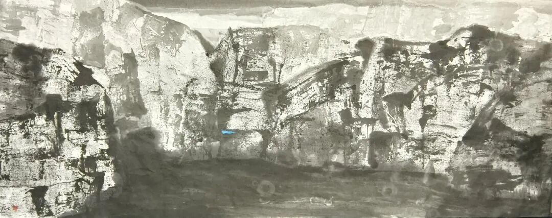 米金铭的大山峡谷系列,是其对传统山水精神的现代性转译。传统中国山水画讲求“卧游”与“畅神”,多以披麻皴、斧劈皴等程式化技法表现山水之形,追求意境的悠远与含蓄。而米金铭则跳出传统技法的桎梏,以“笔触刀痕”的视觉语言重塑大山峡谷的视觉形象,让画面充满原始的力量感与动态的张力。在他的笔下,峡谷的嶙峋怪石不再是温婉的写意勾勒,而是通过浓淡干湿的墨色叠加、枯笔焦墨的擦刮皴擦,形成丰富的肌理层次。墨色的堆积如岩层的褶皱,枯笔的飞白似山石的裂纹,刀刻般的笔触则赋予画面一种雕塑般的质感,仿佛能触摸到峡谷岩壁的粗糙与坚硬。这种技法的突破,让大山峡谷不再是静态的风景再现,而是充满生命律动的精神载体。
