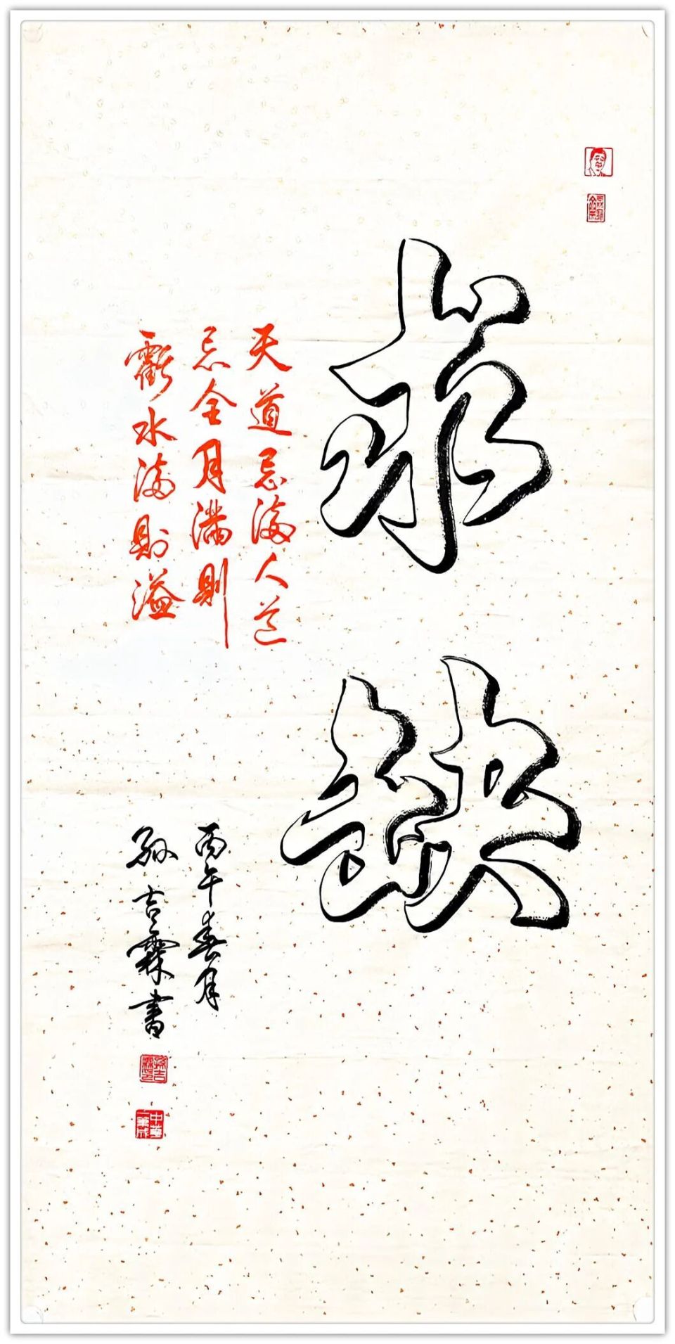 孙先生的书法,有金书锦字的审美品质,这跟取法为上的磨砺有关系,也与书性超人的表达成因果。书法如果只有取法,无有书性自如的表达,难免匠气,称为书奴。观看他的书法,毫无匠气,师二王而不拘,法米芾而不谨!绝对不作书奴,必有自立面目的勇气和成绩!在锋须往来之间,写得高低有趣。有怀素书法的妙于瘦,铁点银钩,方圆周备。也参意张旭书法的妙于肥,笔墨有气象,丰姿多神!当然,在他的书法里,还可以读到徐渭草书的笔墨磅礴,有骨有内,有劲有气,是谓圣!取历代诸贤的笔墨精神,融会贯通,经营自己的书法灵魂,不遗余力!这是先生的书法有审美品位,有专业境界的重要原因。每遇大展必有高段位奖项,亦有诸多作品成为文化机构的国藏上品,还有作品走出国门成为文化交流的信物,被印制成邮册发行,拥有国家文化名片的资质!