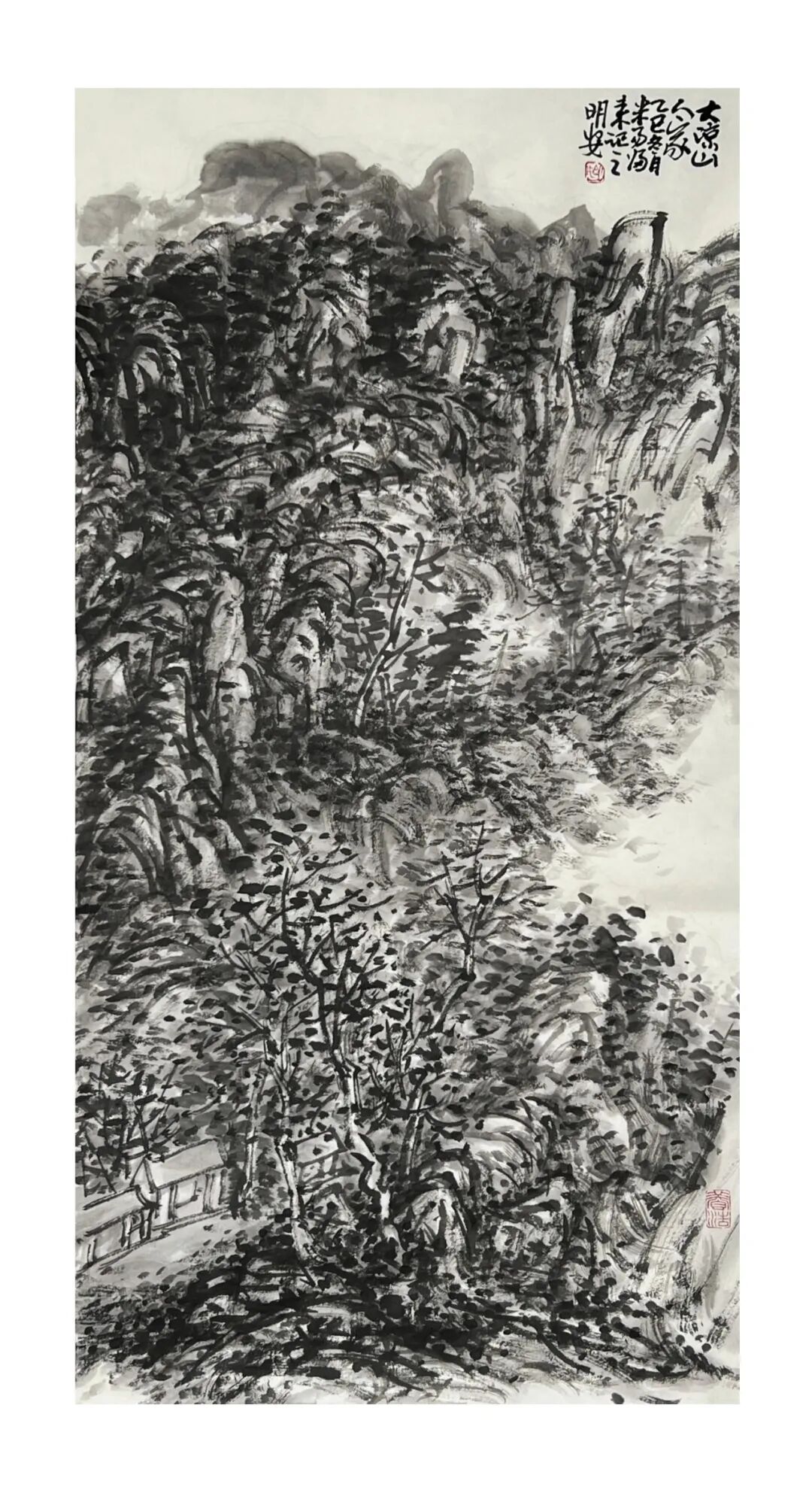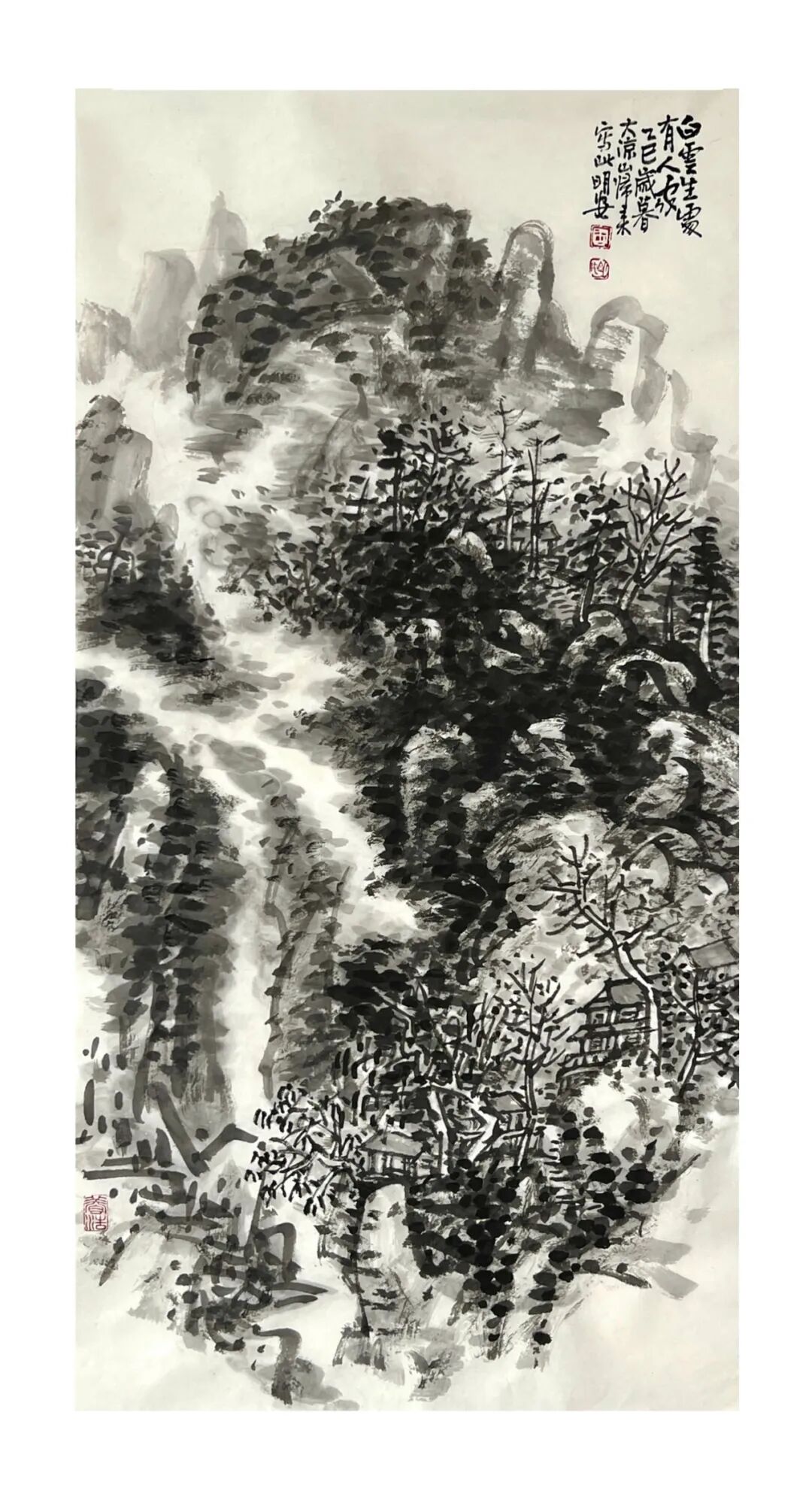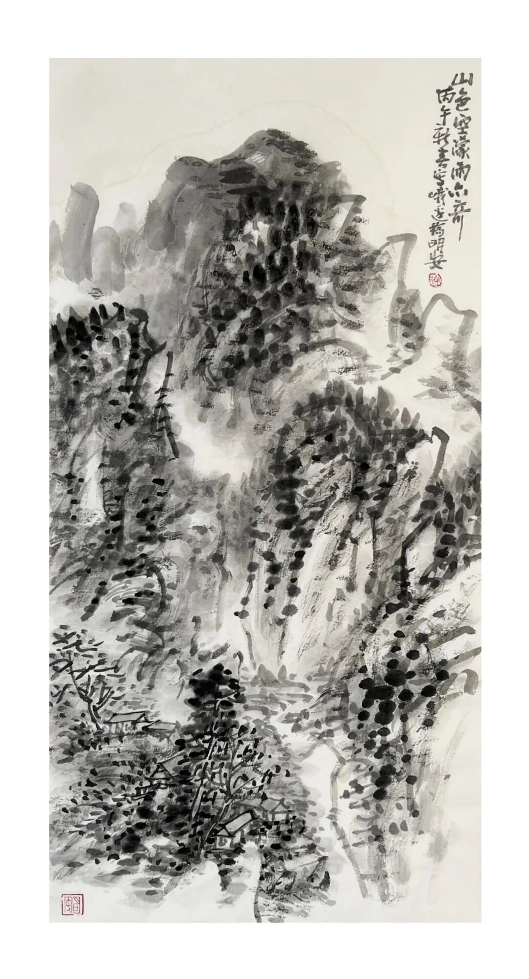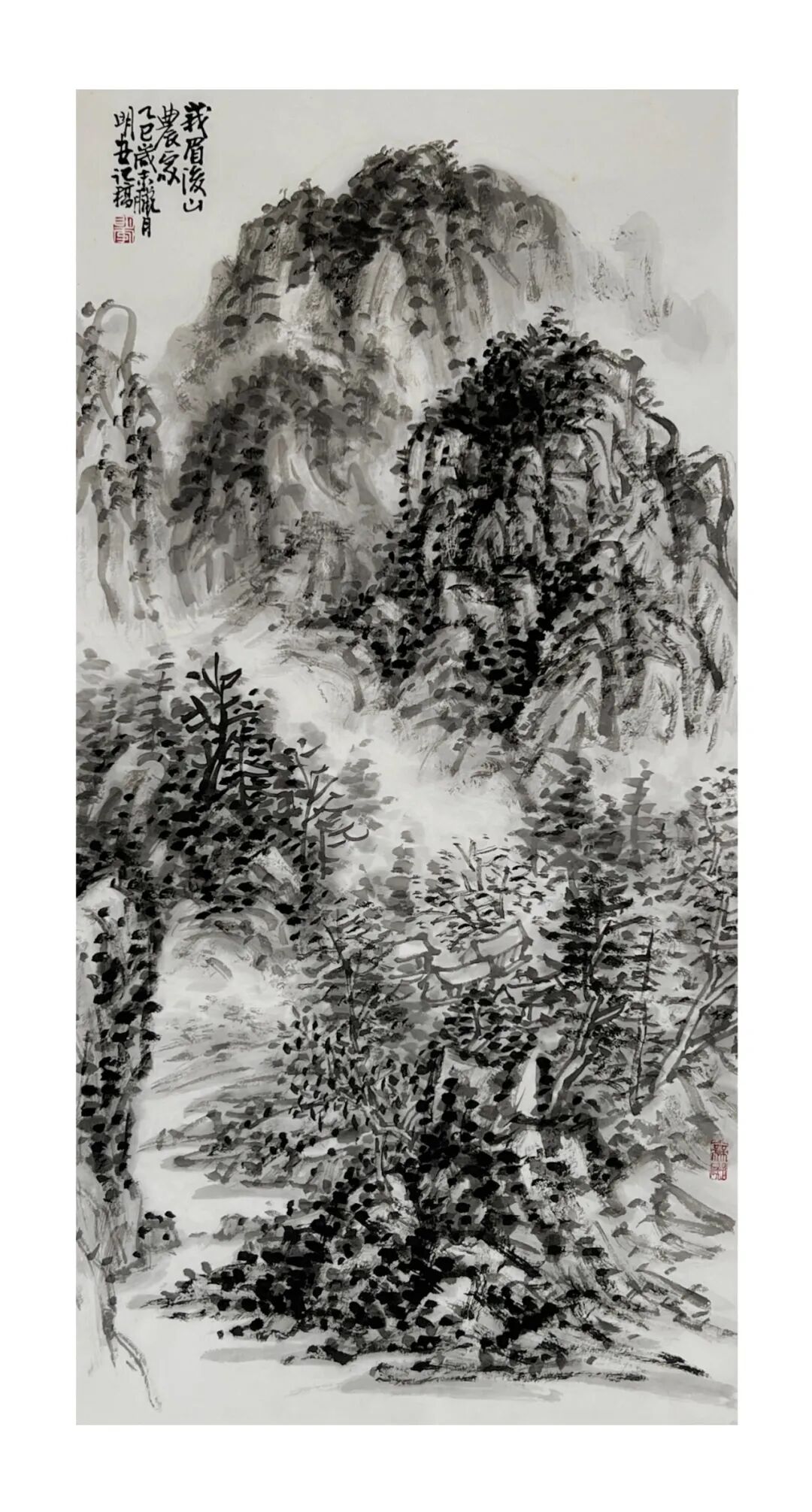 周明安的山水画,注重写生,将巴蜀山水、自然山水、各地不同的风貌和审美特征,用自己的笔墨语言记录下来,在创作中加以运用和升华。笪重光在《画筌》中说:“空本难图, 实景清而空景现;神无可绘,真境逼而神境生。”[147]此论先谈虚实相生,而后谈作品的精神表现,都源于对自然山水真实的笔墨表现和境界的提升。周明安在创作中遵循这一山水创作的艺术规律,同时,他对黄宾虹先生的“五笔七墨”法有着自己的认识。他认为“五笔”之中,“变” 最重要,书法用笔运之于画,画中之笔,笔笔来自书法,却又不是书法,无一笔是点横撇捺。 画是变与化的交响乐。对于黄宾虹先生所提出的“七墨”即浓墨、淡墨、破墨、泼墨、积墨、 焦墨、宿墨,周明安将对其的感受运用于山水画的创作中。一是浓墨勾皴,二是淡墨分阴阳, 三是泼墨点染,四是积墨加厚,五是焦墨提精神,六是宿墨点睛。而破墨法的浓破淡、淡破浓、 墨破色、色破墨,运用在每道程序中,积墨法则可反复使用。对黄宾虹先生作品的认识及技法的灵活运用,使周明安在山水画的写生或创作中思路分明,得心应手。如他的作品《蜀山春潮》《青城道中》等,都体现出他学习黄宾虹笔墨语言的心得。