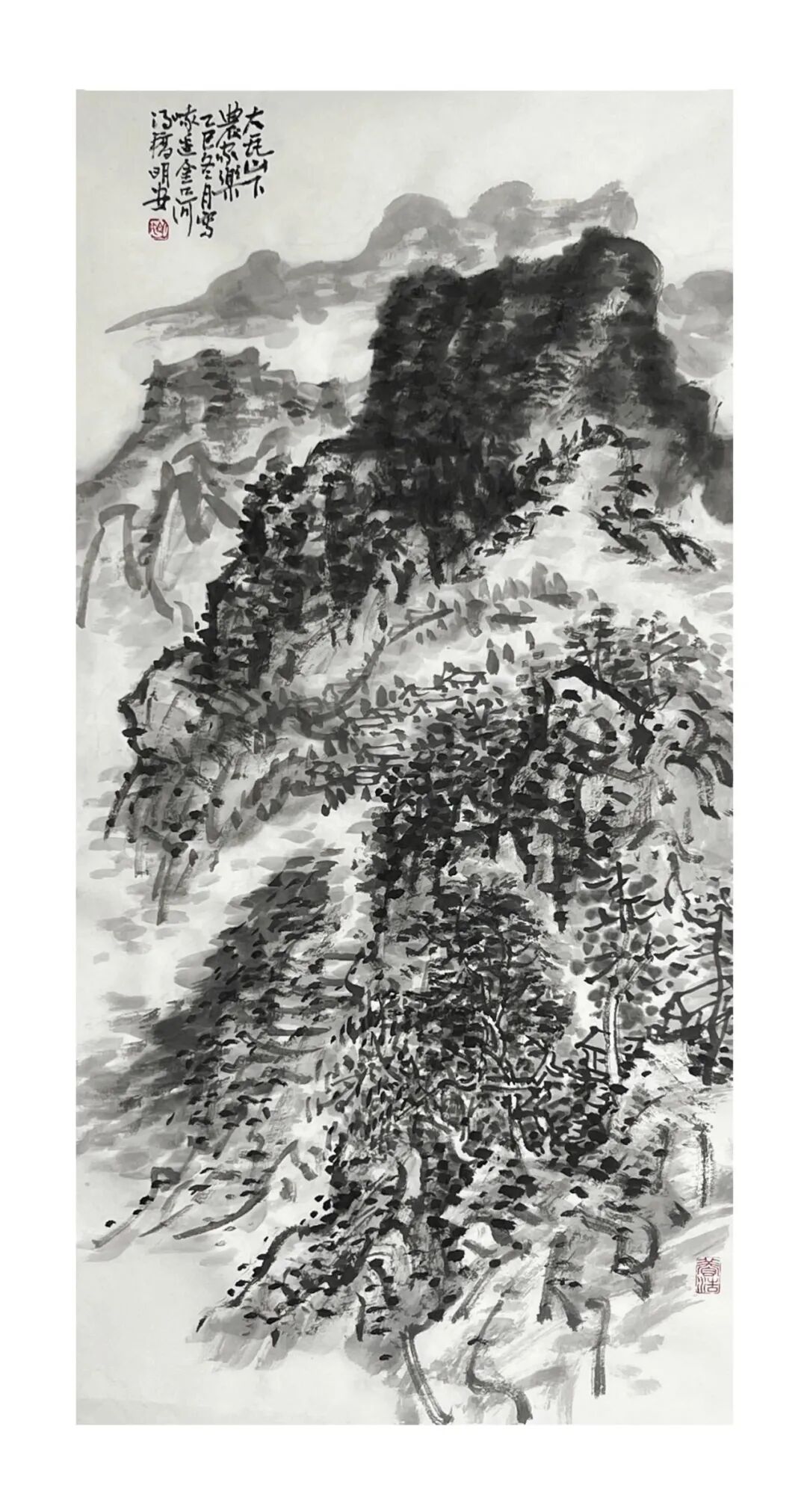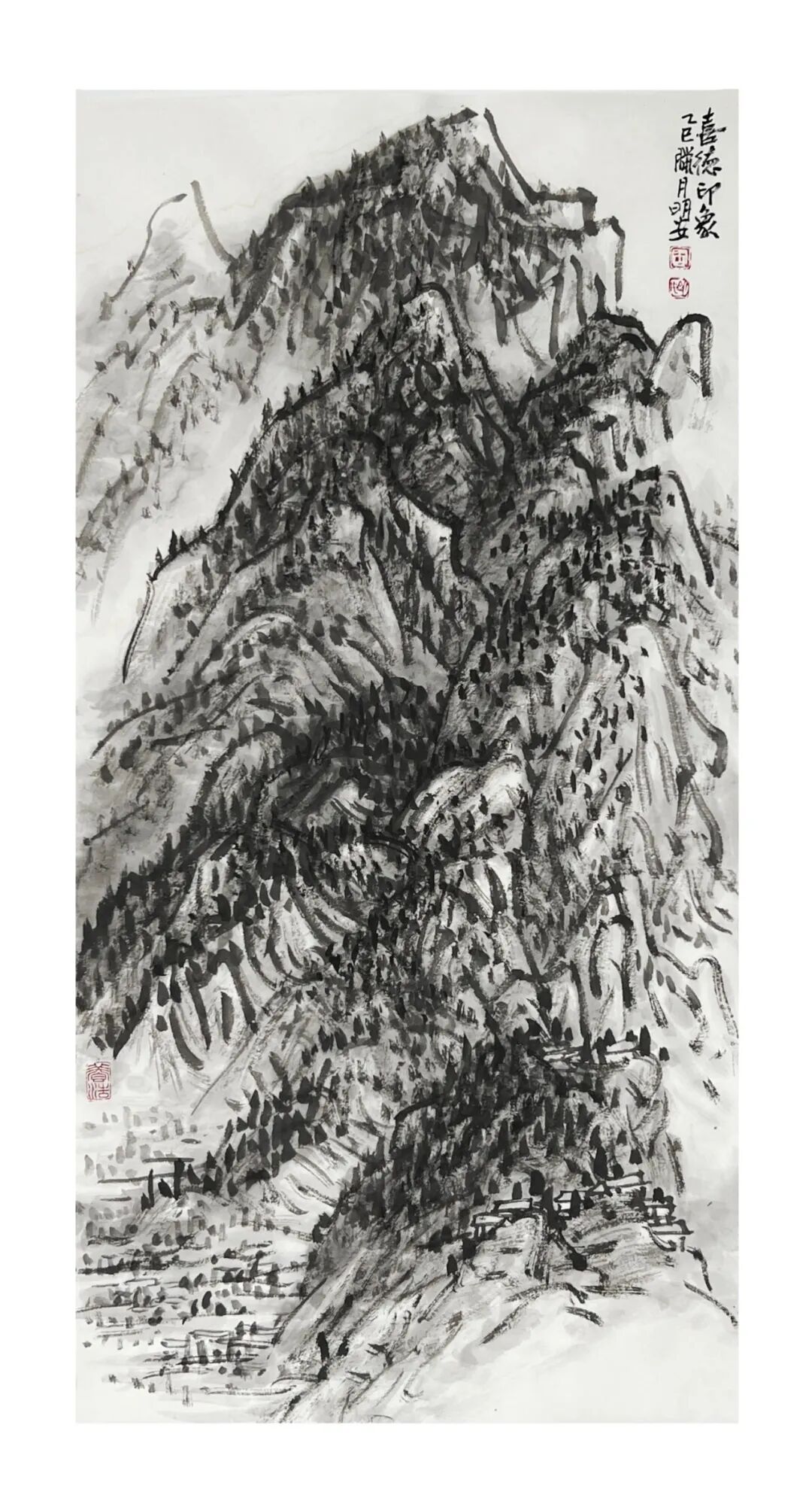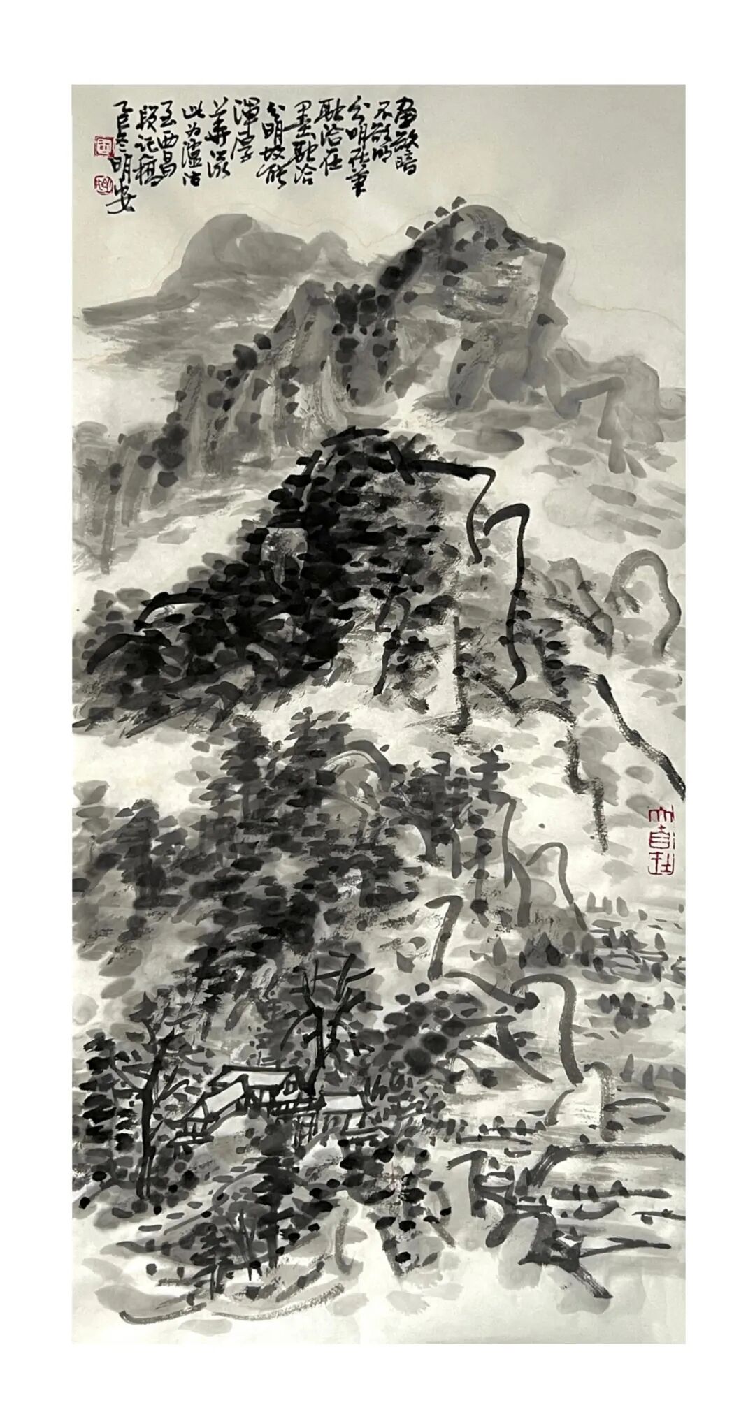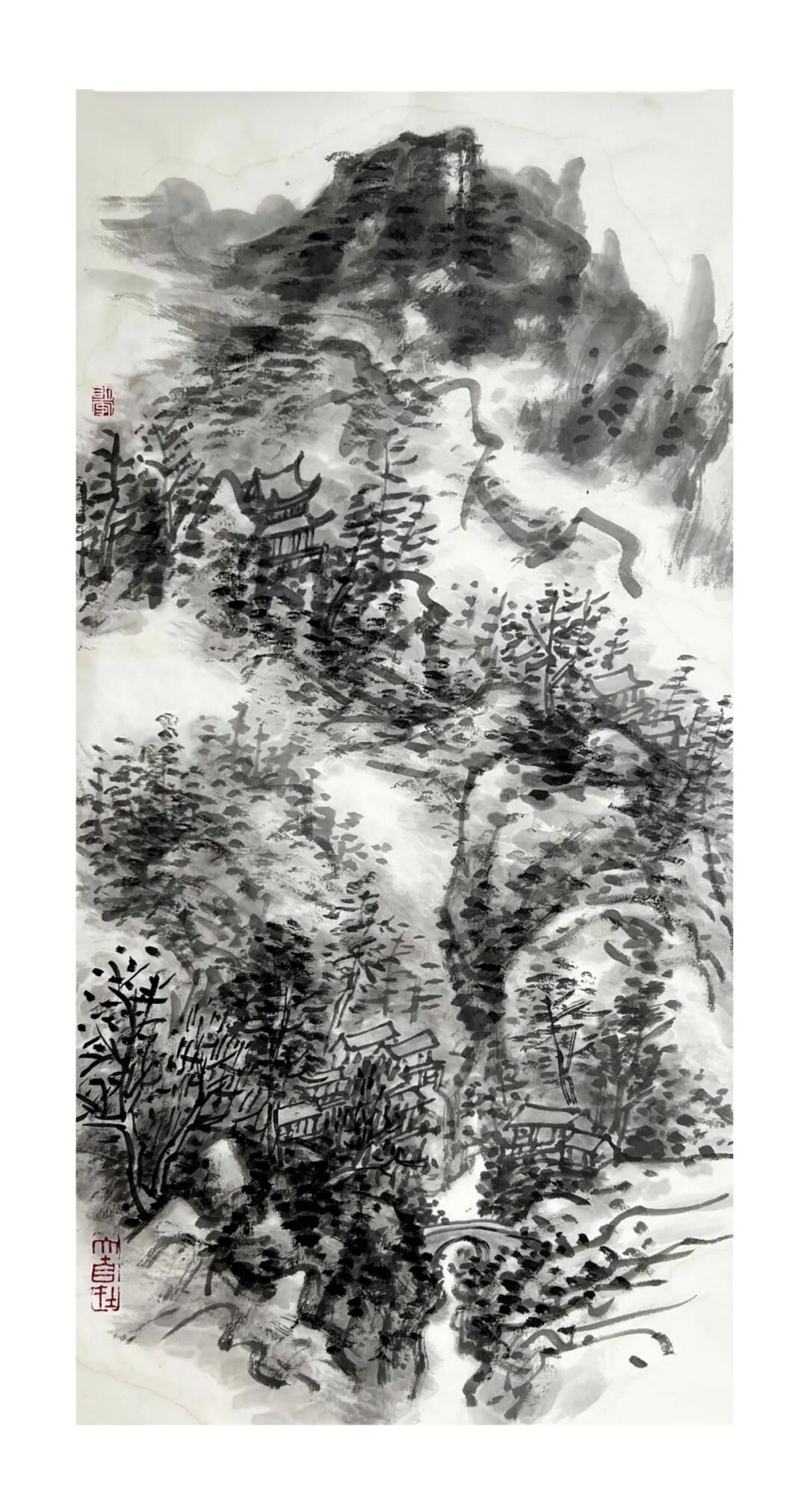 周明安的山水画,注重写生,将巴蜀山水、自然山水、各地不同的风貌和审美特征,用自己的笔墨语言记录下来,在创作中加以运用和升华。笪重光在《画筌》中说:“空本难图, 实景清而空景现;神无可绘,真境逼而神境生。”[147]此论先谈虚实相生,而后谈作品的精神表现,都源于对自然山水真实的笔墨表现和境界的提升。周明安在创作中遵循这一山水创作的艺术规律,同时,他对黄宾虹先生的“五笔七墨”法有着自己的认识。他认为“五笔”之中,“变” 最重要,书法用笔运之于画,画中之笔,笔笔来自书法,却又不是书法,无一笔是点横撇捺。 画是变与化的交响乐。对于黄宾虹先生所提出的“七墨”即浓墨、淡墨、破墨、泼墨、积墨、 焦墨、宿墨,周明安将对其的感受运用于山水画的创作中。一是浓墨勾皴,二是淡墨分阴阳, 三是泼墨点染,四是积墨加厚,五是焦墨提精神,六是宿墨点睛。而破墨法的浓破淡、淡破浓、 墨破色、色破墨,运用在每道程序中,积墨法则可反复使用。对黄宾虹先生作品的认识及技法的灵活运用,使周明安在山水画的写生或创作中思路分明,得心应手。如他的作品《蜀山春潮》《青城道中》等,都体现出他学习黄宾虹笔墨语言的心得。