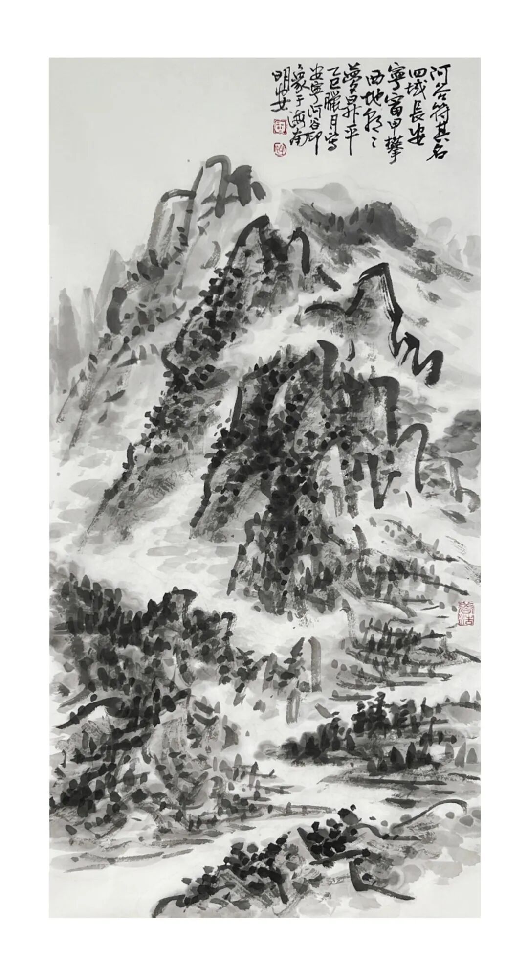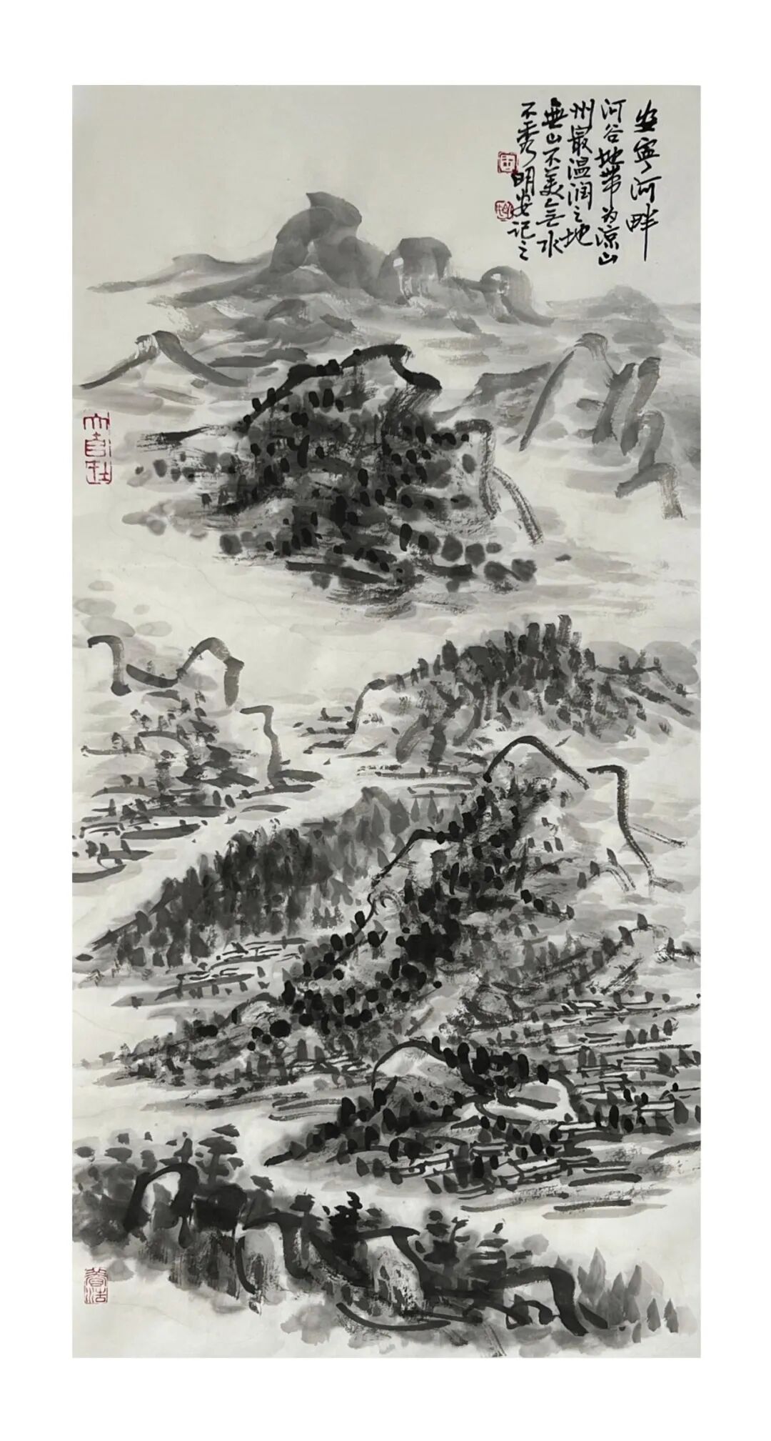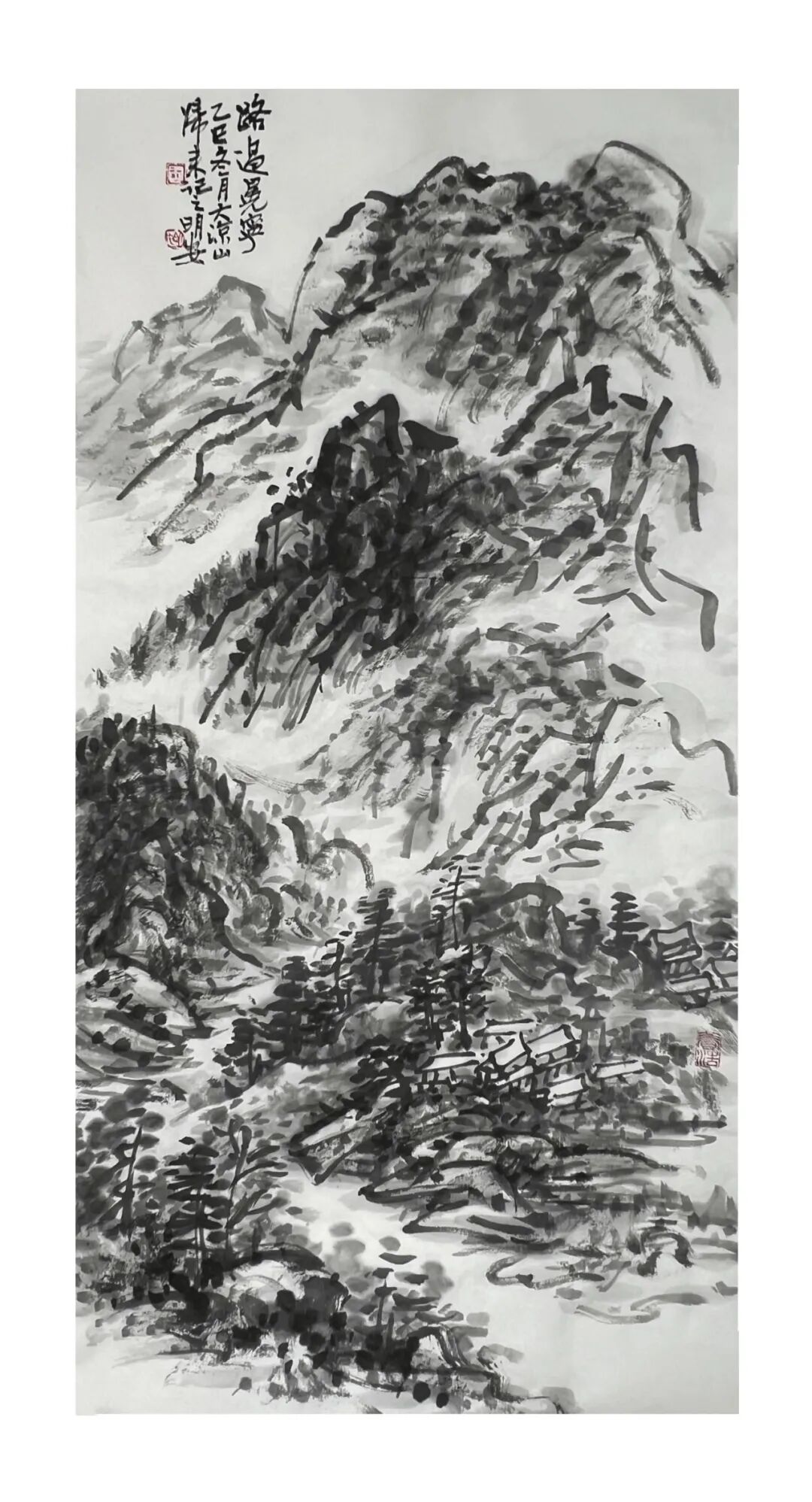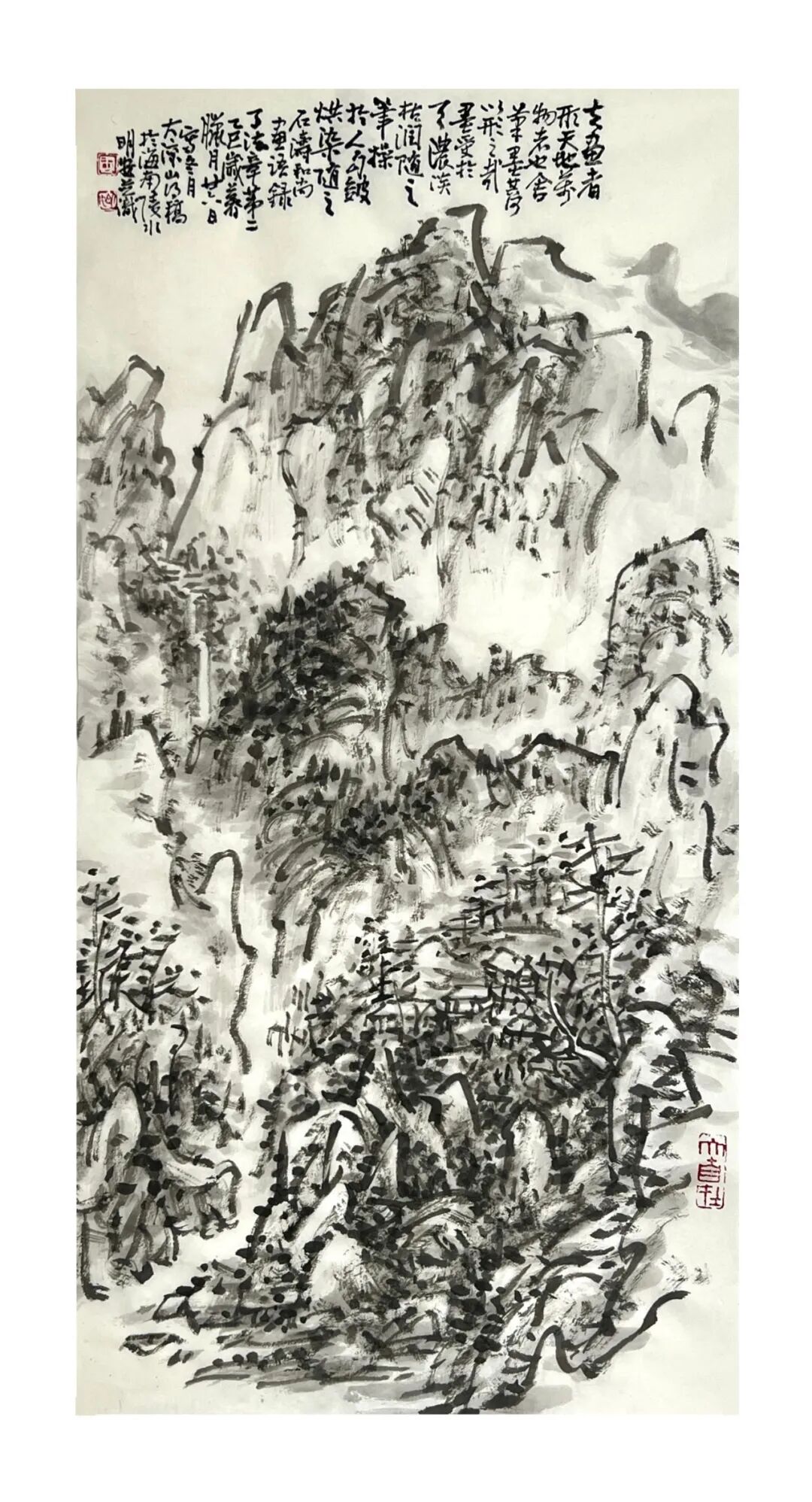 周明安的山水画,注重写生,将巴蜀山水、自然山水、各地不同的风貌和审美特征,用自己的笔墨语言记录下来,在创作中加以运用和升华。笪重光在《画筌》中说:“空本难图, 实景清而空景现;神无可绘,真境逼而神境生。”[147]此论先谈虚实相生,而后谈作品的精神表现,都源于对自然山水真实的笔墨表现和境界的提升。周明安在创作中遵循这一山水创作的艺术规律,同时,他对黄宾虹先生的“五笔七墨”法有着自己的认识。他认为“五笔”之中,“变” 最重要,书法用笔运之于画,画中之笔,笔笔来自书法,却又不是书法,无一笔是点横撇捺。 画是变与化的交响乐。对于黄宾虹先生所提出的“七墨”即浓墨、淡墨、破墨、泼墨、积墨、 焦墨、宿墨,周明安将对其的感受运用于山水画的创作中。一是浓墨勾皴,二是淡墨分阴阳, 三是泼墨点染,四是积墨加厚,五是焦墨提精神,六是宿墨点睛。而破墨法的浓破淡、淡破浓、 墨破色、色破墨,运用在每道程序中,积墨法则可反复使用。对黄宾虹先生作品的认识及技法的灵活运用,使周明安在山水画的写生或创作中思路分明,得心应手。如他的作品《蜀山春潮》《青城道中》等,都体现出他学习黄宾虹笔墨语言的心得。