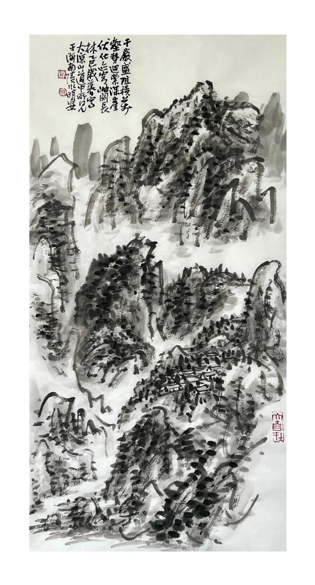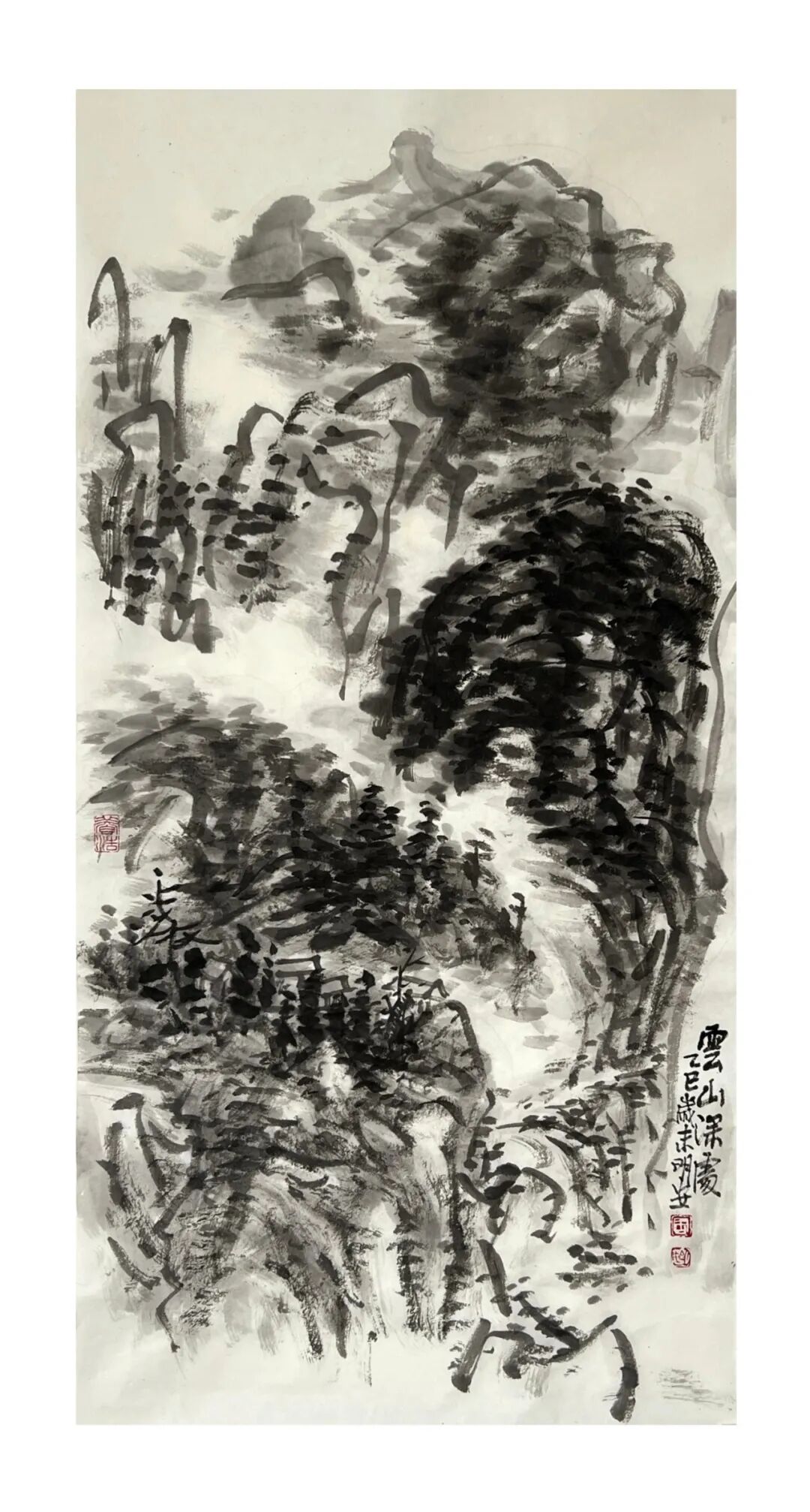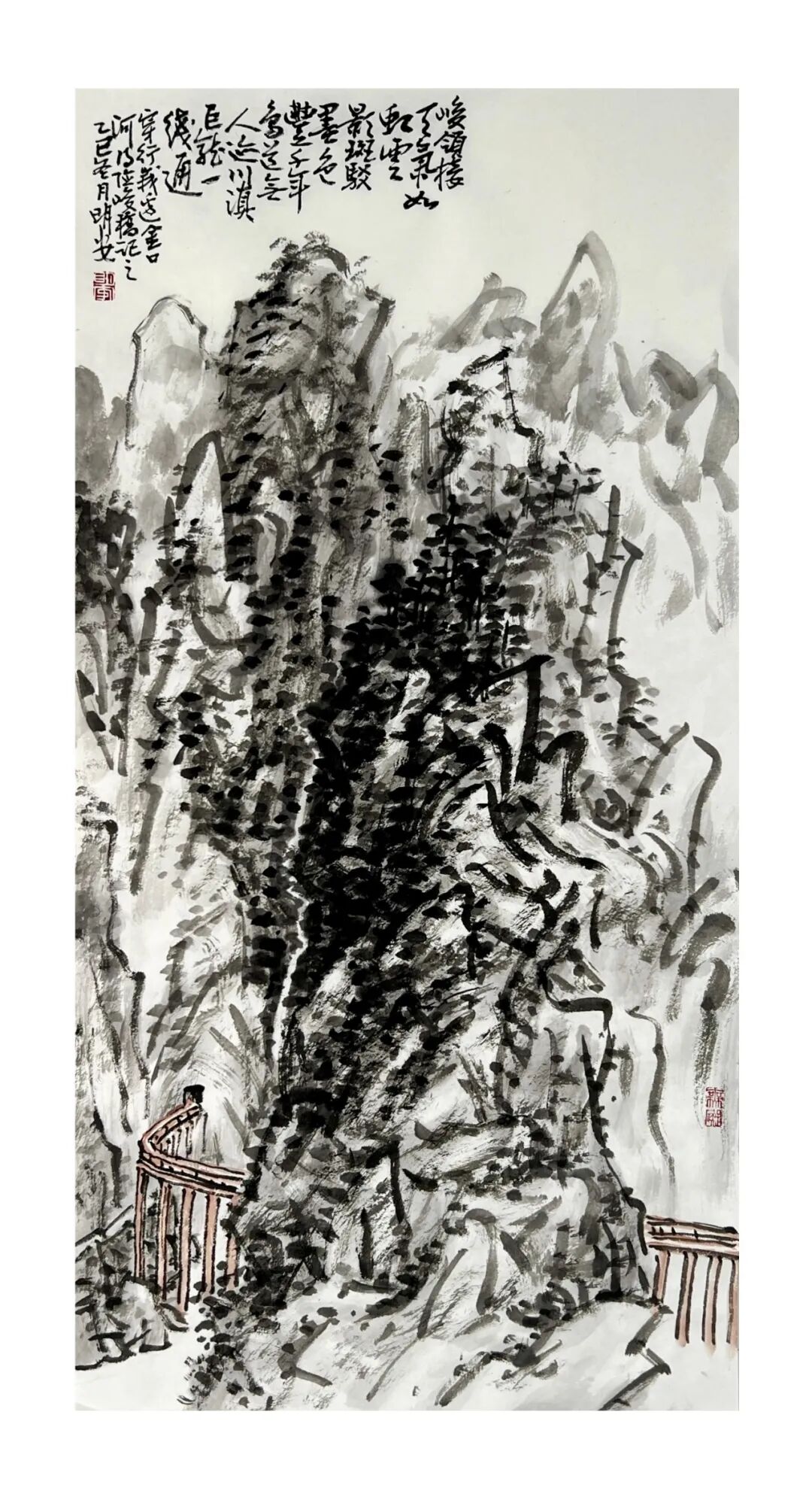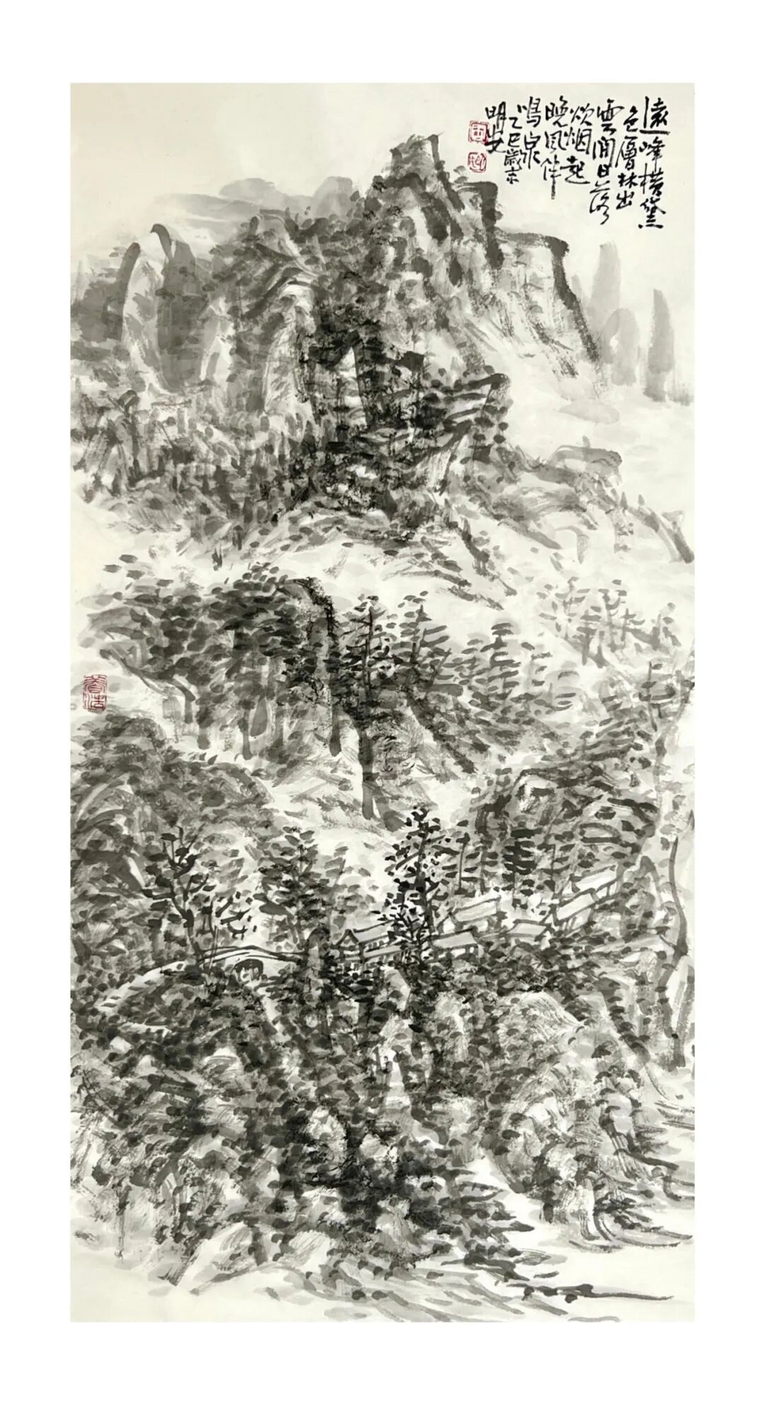 周明安的山水画,注重写生,将巴蜀山水、自然山水、各地不同的风貌和审美特征,用自己的笔墨语言记录下来,在创作中加以运用和升华。笪重光在《画筌》中说:“空本难图, 实景清而空景现;神无可绘,真境逼而神境生。”[147]此论先谈虚实相生,而后谈作品的精神表现,都源于对自然山水真实的笔墨表现和境界的提升。周明安在创作中遵循这一山水创作的艺术规律,同时,他对黄宾虹先生的“五笔七墨”法有着自己的认识。他认为“五笔”之中,“变” 最重要,书法用笔运之于画,画中之笔,笔笔来自书法,却又不是书法,无一笔是点横撇捺。 画是变与化的交响乐。对于黄宾虹先生所提出的“七墨”即浓墨、淡墨、破墨、泼墨、积墨、 焦墨、宿墨,周明安将对其的感受运用于山水画的创作中。一是浓墨勾皴,二是淡墨分阴阳, 三是泼墨点染,四是积墨加厚,五是焦墨提精神,六是宿墨点睛。而破墨法的浓破淡、淡破浓、 墨破色、色破墨,运用在每道程序中,积墨法则可反复使用。对黄宾虹先生作品的认识及技法的灵活运用,使周明安在山水画的写生或创作中思路分明,得心应手。如他的作品《蜀山春潮》《青城道中》等,都体现出他学习黄宾虹笔墨语言的心得。