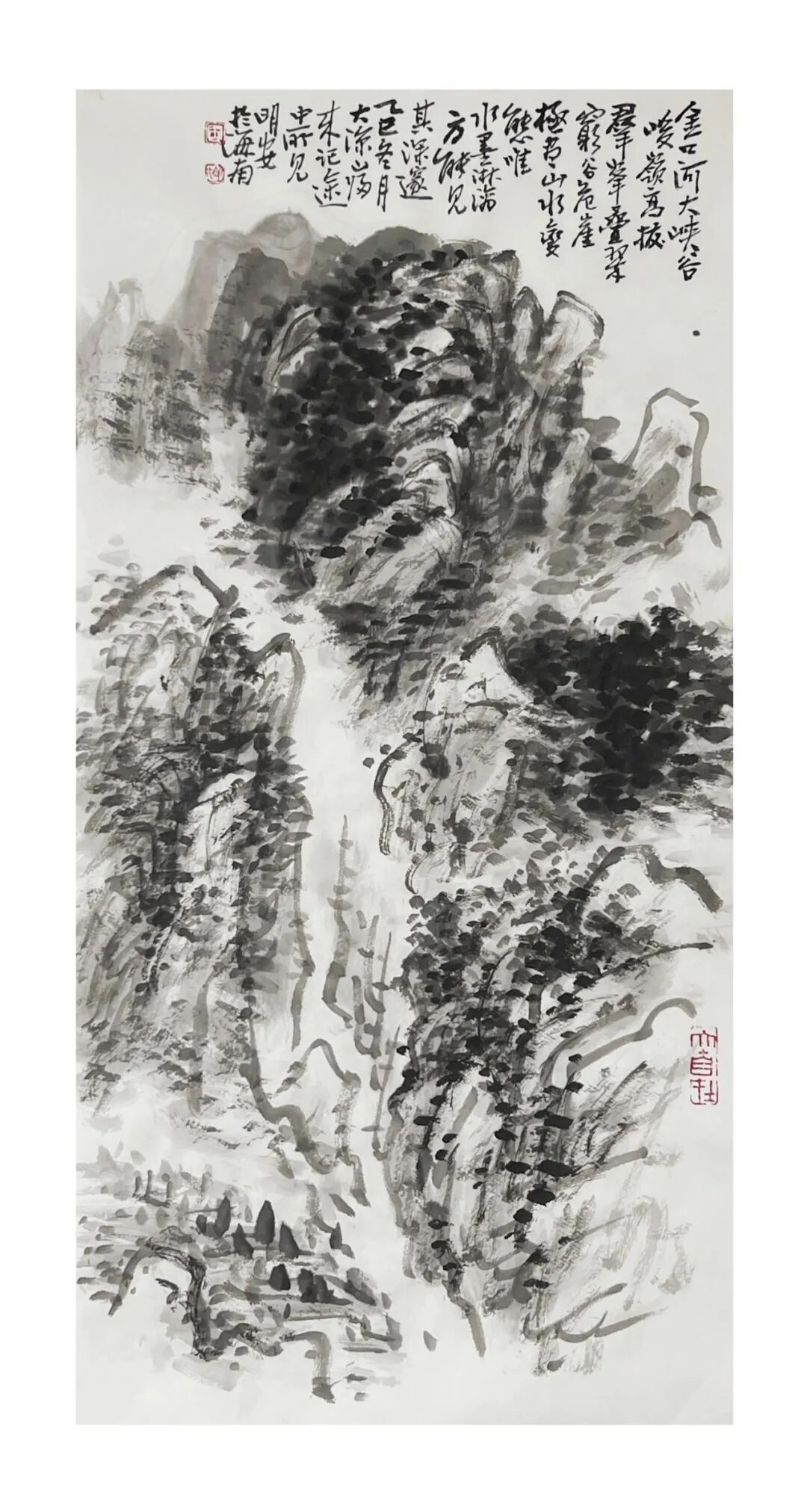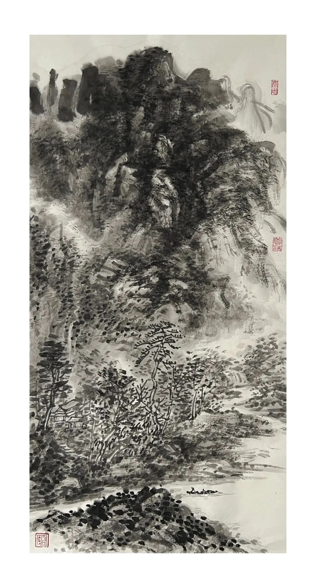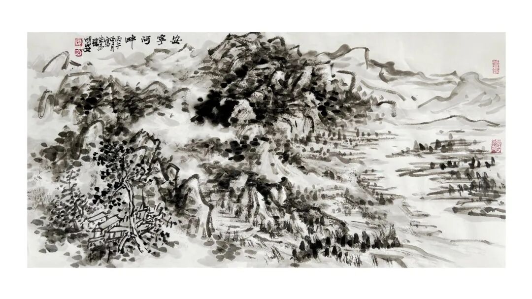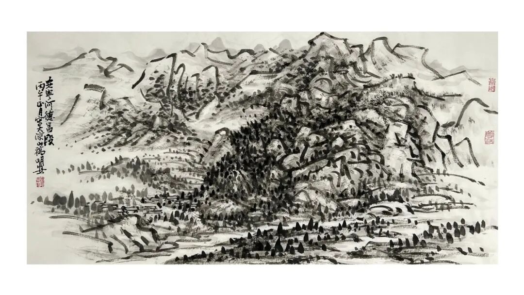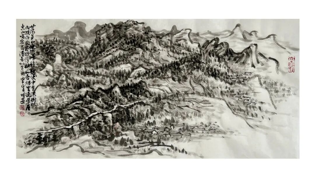 周明安的山水画作品传统功力深厚,笔法多样,应物象形,他的构图多取自然之造化, 顺其自然而心生境象,呈现出雄健苍润,古拙真朴的巴蜀山水画境界。