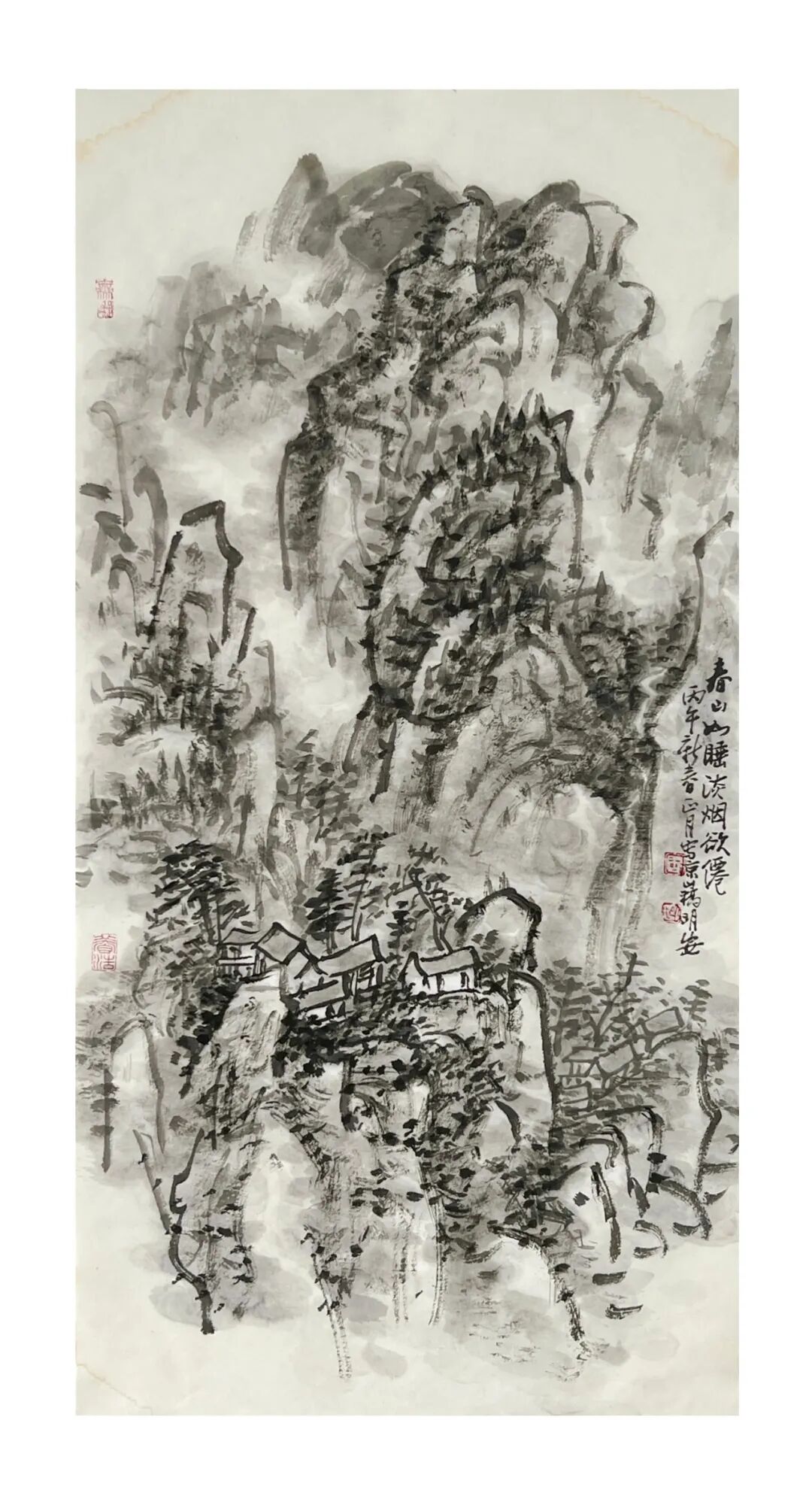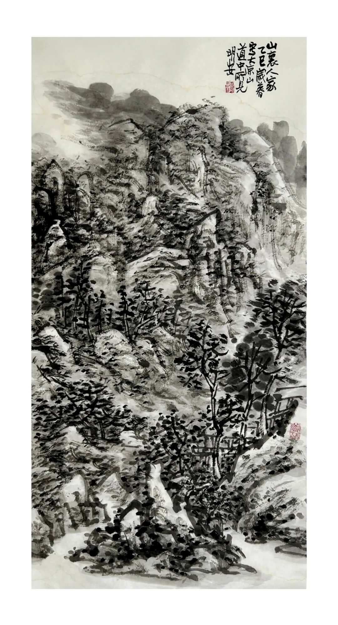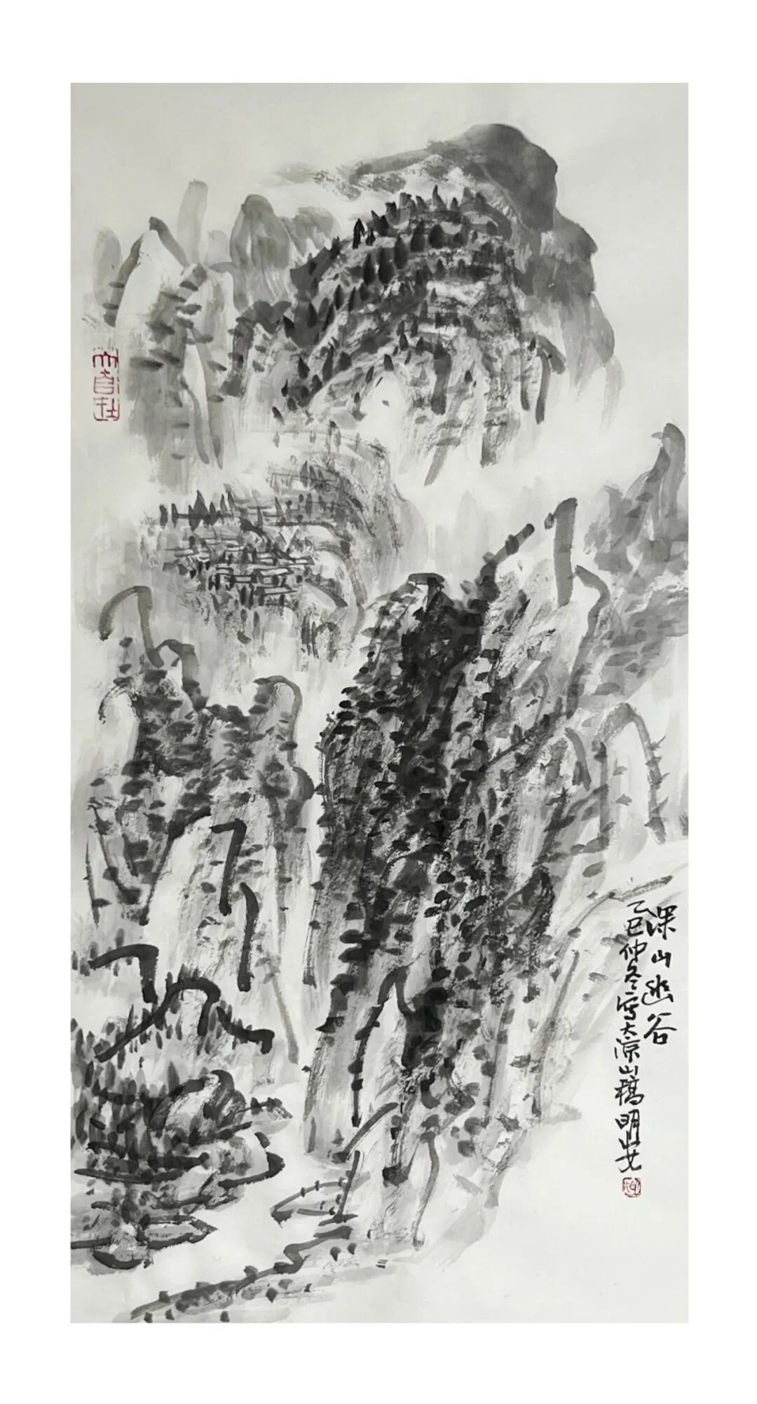周明安的山水画作品传统功力深厚,笔法多样,应物象形,他的构图多取自然之造化, 顺其自然而心生境象,呈现出雄健苍润,古拙真朴的巴蜀山水画境界。