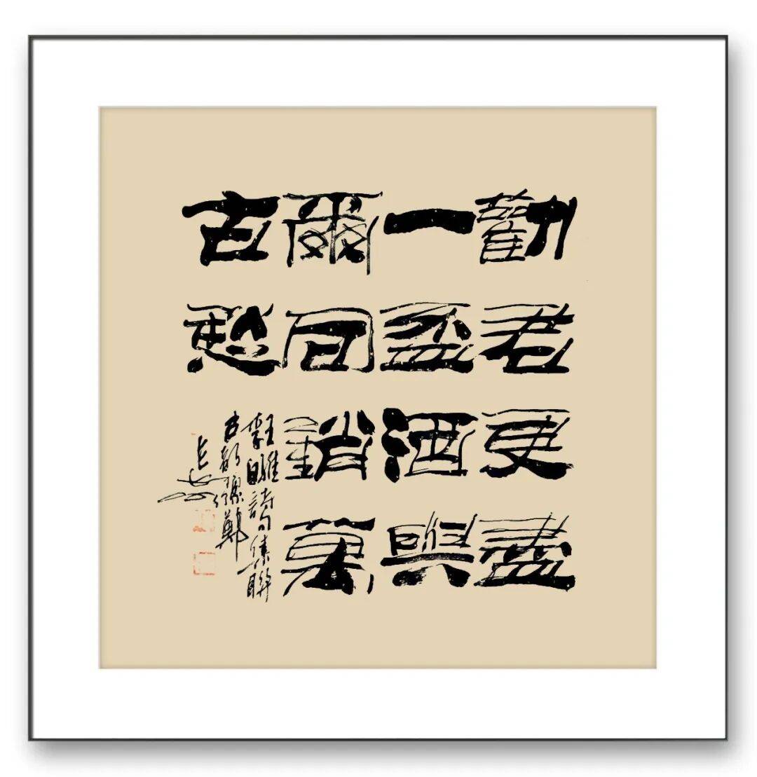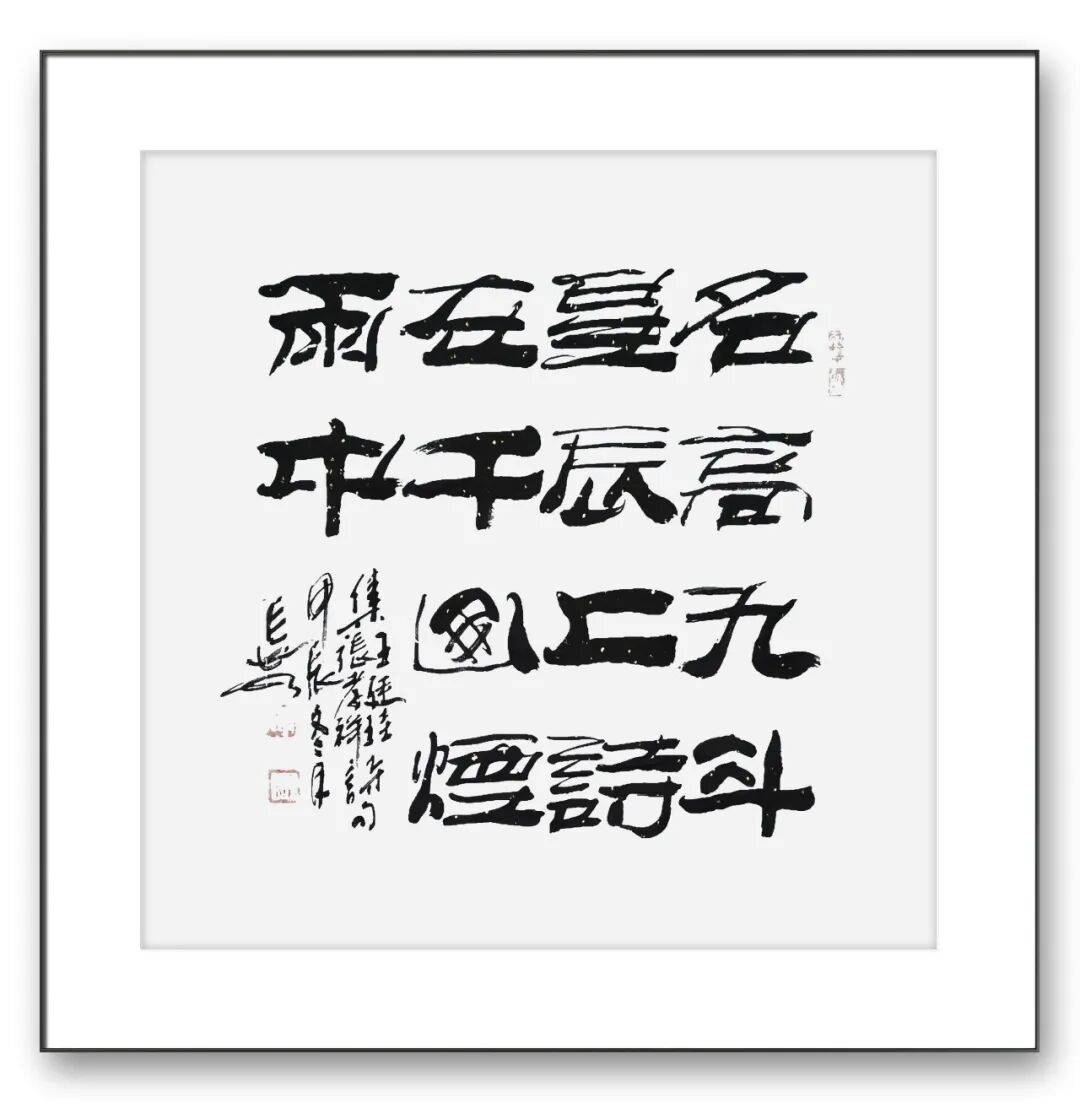 陈长水老师的隶书,在结体与章法上同样颇具匠心,尽显“拙中有巧、疏密有致”的艺术美感。其结字斜中求稳,隶中含篆,横粗竖细的搭配错落有致,章法布局疏密得当、大胆夸张,既遵循传统隶书的结体规范,又融入自己的艺术巧思。有的作品点画匀称、秀雅质朴,尽显端庄大气;有的作品倾斜随意、笔法率真,暗藏稚拙之趣;有的作品以篆笔写隶、以隶笔写篆,楷隶交融,中正规矩中透着灵动;还有的作品大小参差、错落有致,藏露互见间趣味盎然。这种多样化的结体与章法表达,不仅展现了陈老师深厚的艺术功底,更体现了他“师古不泥古”的艺术追求——他不局限于对古帖的机械模仿,而是在深入理解传统的基础上,加入自己的人生感悟与审美追求,让每一幅作品都具有独特的艺术个性。