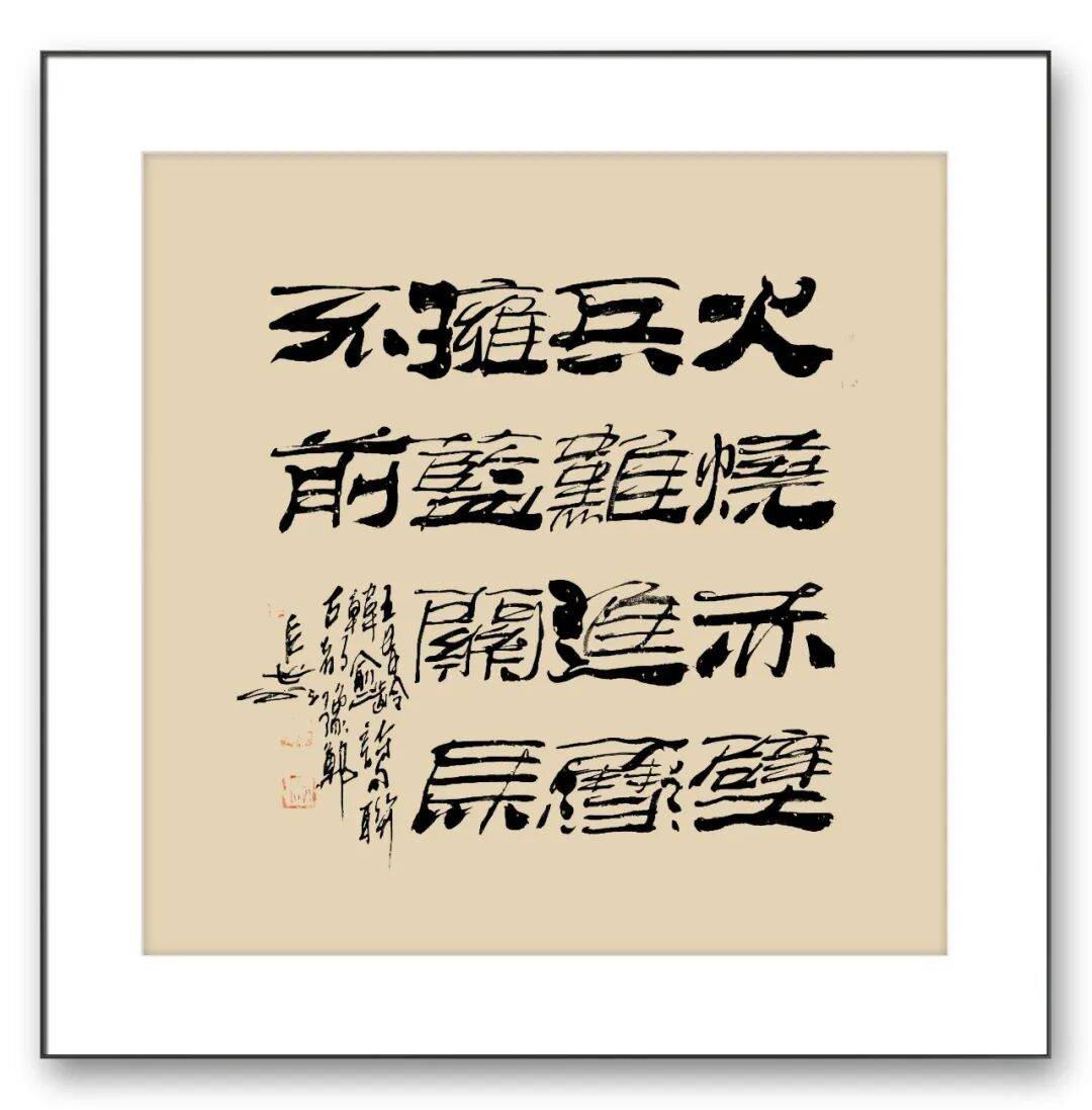 隶书是陈长水老师最具代表性的书体,其隶书作品深植汉隶正典气象,又融入个人感悟与时代风范,形成了古质典雅、雄浑洒脱的独特风貌。汉隶作为中国书法史上的重要里程碑,上承篆体的庄重古朴,下启楷草的灵动流畅,兼具庙堂的庄重与民间的率真。陈老师深谙汉隶精髓,以《张迁碑》的雄厚、《好大王碑》的稚拙、《礼器碑》的劲健、《石门颂》的率意为根基,反复临摹、深入体悟,将诸碑的精髓融会贯通,又巧妙掺入魏碑的刚健之气,最终强化出属于自己的隶书风格——古质中不乏典雅,气象外蕴含神韵,既保留了汉隶的庄重古朴,又增添了灵动洒脱的个人气质。
