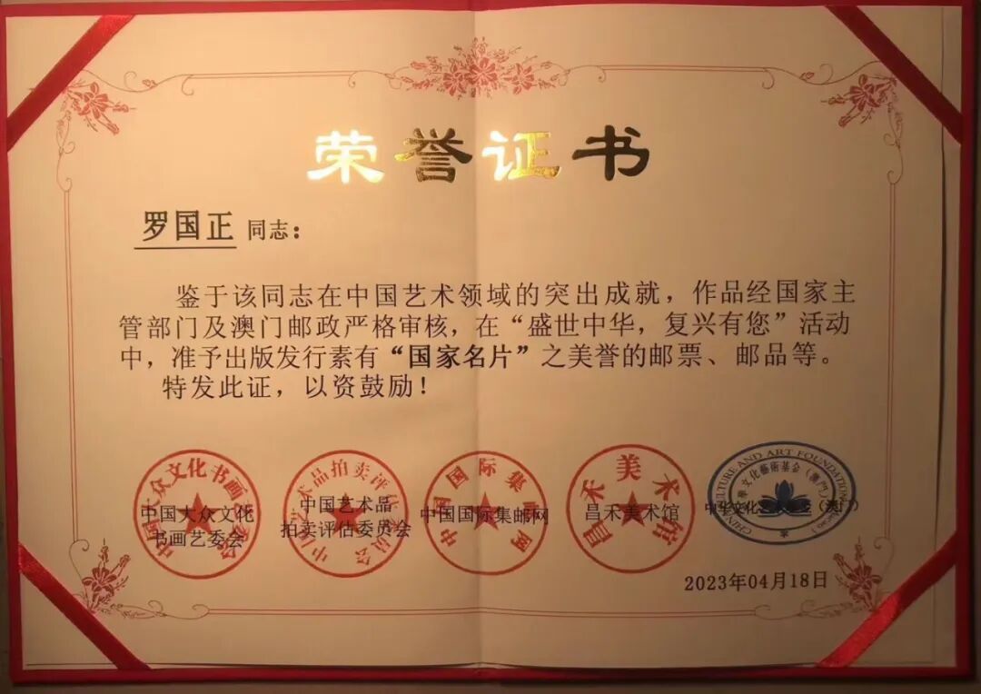罗国正先生热爱公益慈善事业,多年前他就全资赞助家乡修建多条道路和多项基础设施。近年来,他又赞助图书给全国各大图书馆和图书室有四千六百一十六家,其图书被包括国家图书馆、各大学和省、市、地方等图书馆收藏;支持和赞助多次多场的公益慈善拍卖,包括汶川地震期间,他也捐出大量的书画作品,所得巨款,他都不收分文,全部赞助给公益慈善单位。电视台和有关公益慈善单位发给他的奖状也有五十多次,还有很多是他没有留名而做的奉献超千次。