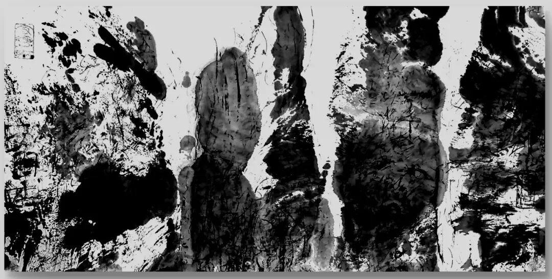 在笔墨语言上,他独创水重乱柴皴,以技法破程式,以无序藏有序,暗合道家“大巧若拙、大乱大治”的辩证哲思。纵笔大写意,不求局部完美,而求整体气韵,“上败下补,左失右成”,在笔墨的偶然与必然之间,把握生命的自在与洒脱。墨色浓淡相生、干湿互济,水与墨在宣纸上交融渗透,既是物质的流变,亦是“有无相生”的哲学演绎:黑为有、白为无,黑处厚重如磐,是大地之载;白处空灵悠远,是天地之虚。他深谙“计白当黑”的东方空间哲学,视空白为画面的呼吸、气韵的通道、意境的延展,让实与虚、密与疏、动与静互为表里,构成太极阴阳流转的视觉秩序,将传统太极构图与黄金分割相融,让哲学理性与艺术感性浑然一体。