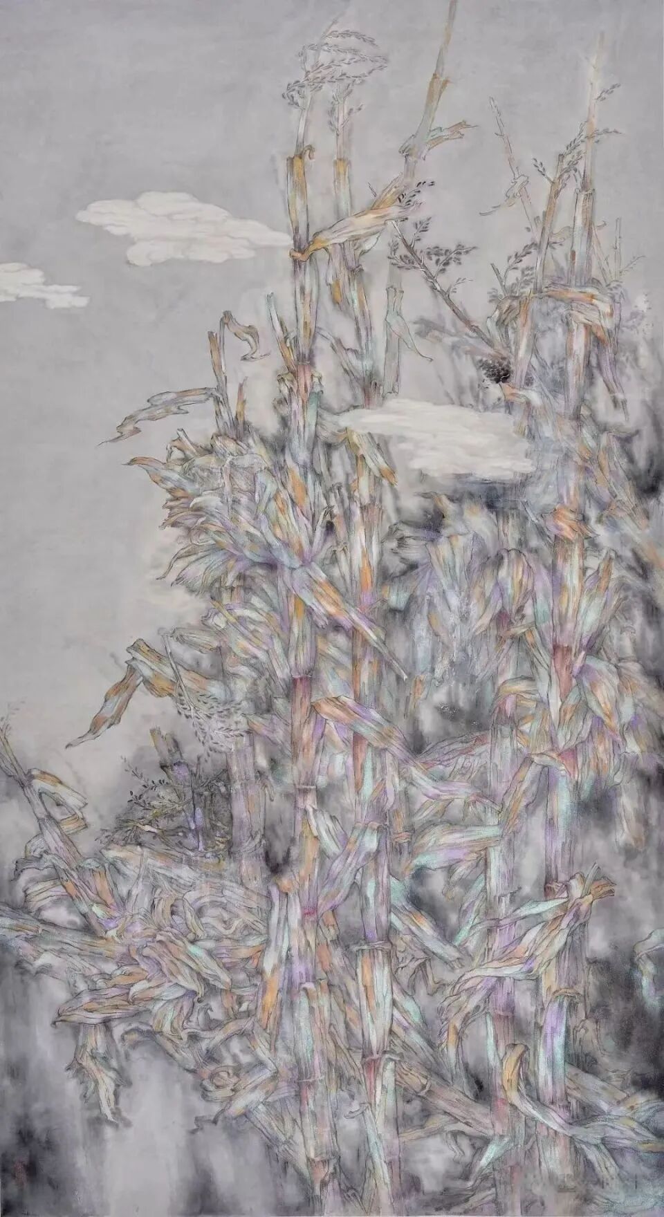 譬如,画家笔下的玉米,茁壮劲挺,氤氲朴素,透出不猎奇、不矫情、不雕琢、不做作的天真平淡之质,这都是难能可贵的,而诸如玉蔬的写意随性表现与昆虫的工整细致,适成对比,使小品不小,含蓄蕴藉,境生象外,意味无尽。其他如《轻衣薄着几枝间》《雪梅恋》《团叶风摇碧玉珠》《飞向林间自在啼》等等,都体现出笃意绘画致与典雅,它既是技术娴熟的佐证,也是风骨与人文修养的结晶。范建宇成长并成熟于当代文化语境之中,当代文化语境作为他艺术的沃土,定会使他的艺术根深叶茂,使他的步履越来越坚实。