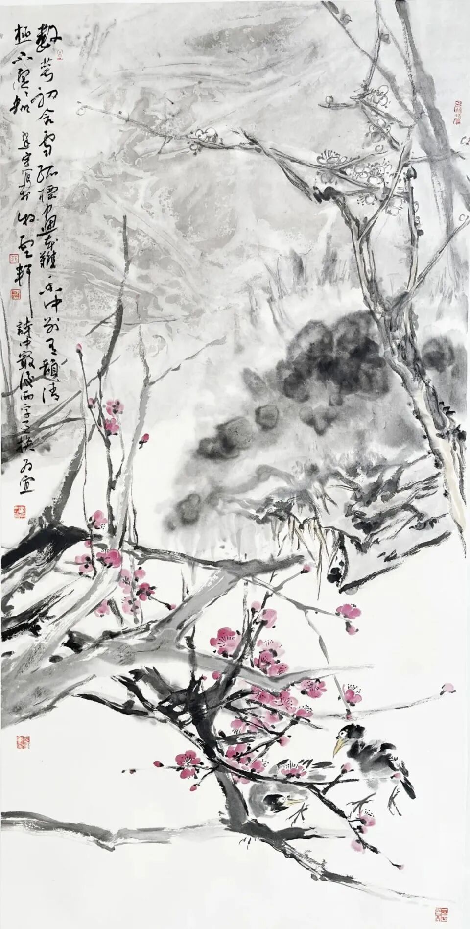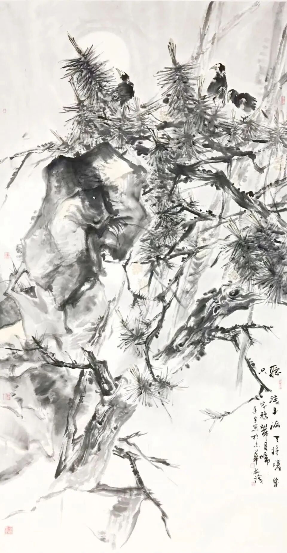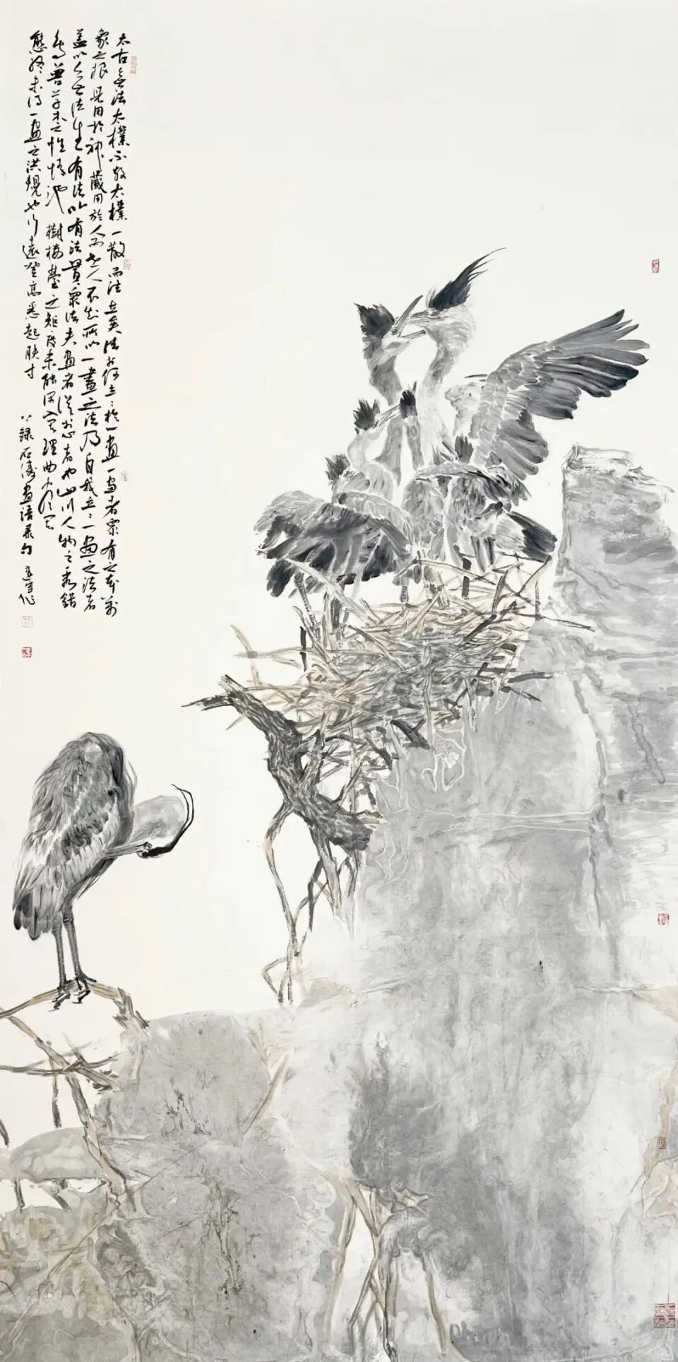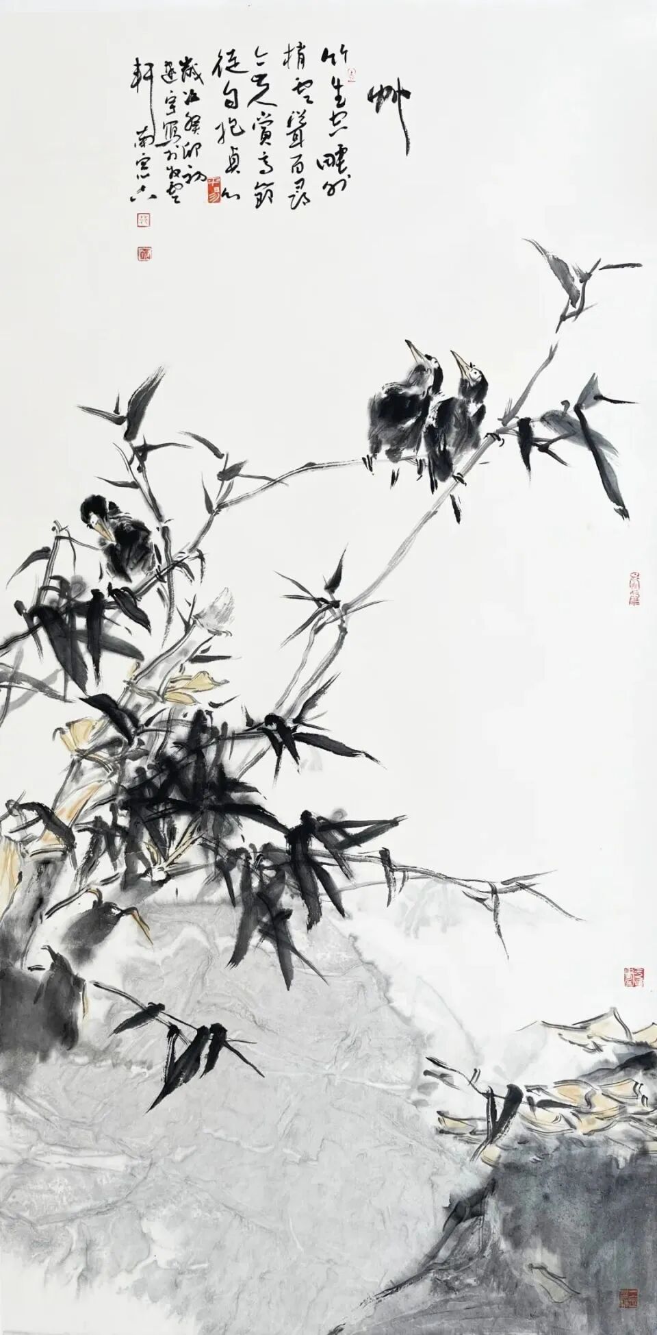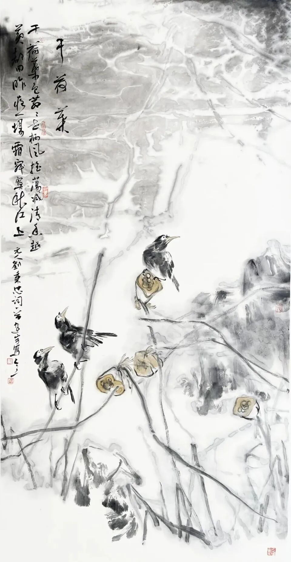 范建宇善于在写意的理念中,提升出一种近乎抽象的思考能力和认识能力,他把写意花鸟画的笔墨从浓湿墨、淡湿墨,演绎为“游心物外”和“风神骨气者居上”的精神性语言特质,在充实之中变幻为有聚有散、有虚有实、有内有外、有断有连、有层次、有风致、有灵动、有飘逸的多种美感与多种可能性的变化,这里我们分明感受到范建宇在前人那里获得的宝贵谕示:“笔法要古,墨气要厚,丘豁要稳,气韵要浑”气韵由笔墨而生,或取圆浑而雄壮者,或取顺快而流畅者。作为当代画家,范建宇以独立的思考与成熟的笔墨语言,通过艺术寻求着对自然生命的把握,因此,他的花鸟画已从简单地咏物言志的原则中脱离,深化为对生命形态和生命形式的寻找、发现与表达。