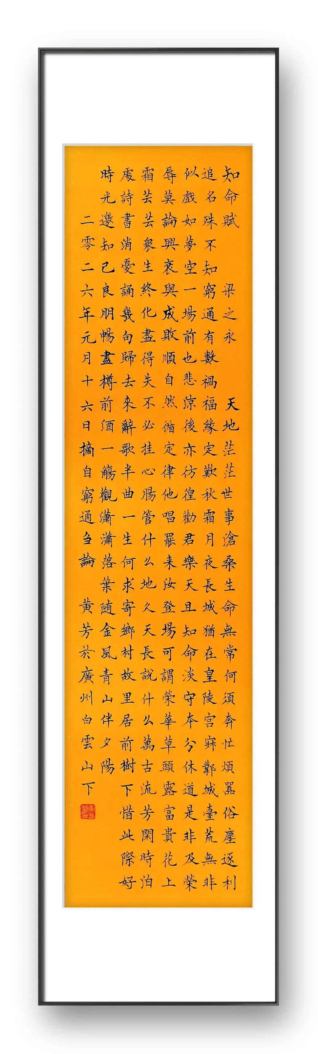 黄芳先生的书法艺术,不仅彰显着高超的笔墨技巧,更承载着他对传统文化的敬畏与传承。他始终认为,书法不仅是一门艺术,更是中华优秀传统文化的重要载体,每一笔笔墨都承载着文化的基因,每一幅作品都传递着精神的力量。作为名斋主人,他将“修身、立德、传艺”作为自身的艺术追求,在笔墨创作中坚守传统底线,弘扬正统文化,反对浮躁猎奇、脱离传统的创作倾向,始终以严谨的态度对待每一幅作品,力求让每一笔、每一划都传递出书法艺术的魅力与传统文化的底蕴。他的作品,不仅具有极高的艺术观赏性,更具有深厚的文化内涵,无论是书写经典诗词,还是传统格言,都能通过笔墨的流转,将文字背后的思想与情感传递得淋漓尽致,让观者在欣赏笔墨之美的同时,感受到传统文化的温润与力量。