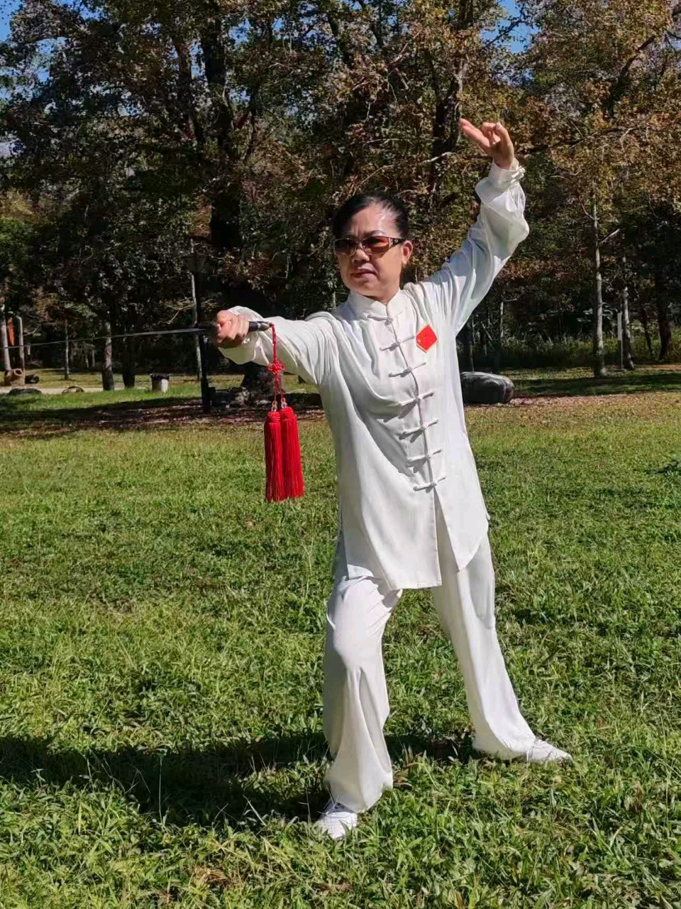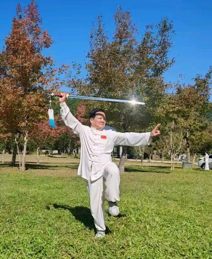 挥玉臂,舒猿臂,舞霜拳。穿梭玉女,星斗照垂影翩跹。野马分鬃势巧,金鸡独立威显,四两拨千钧。乱世安黎庶,盛世葆华年。
