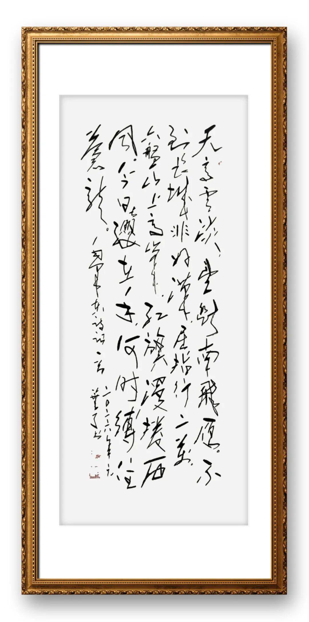 墨法的巧妙运用,是董瑞杰书法作品的另一大特色,他深谙“墨分五彩”的精髓,将枯墨、润墨、浓墨、淡墨灵活搭配,使画面墨气淋漓、层次丰富,兼具视觉冲击力与含蓄意境。他善于利用墨色的变化营造氛围,大笔一挥,枯墨飞白尽显苍劲,如“大漠孤烟直,长河落日圆”般雄浑壮阔;铰笔一转,细笔润墨尽显灵动,如“新月之出天涯”般清雅秀丽。在作品中,他常常以浓墨点染核心笔画,凸显字体的精神气度,以淡墨铺陈辅助线条,营造空灵悠远的意境,破墨、积墨、宿墨等技法的灵活运用,使笔墨之间既有“干裂秋风”的苍劲,又有“润含春雨”的温润,形成了浓淡相宜、虚实相生的艺术效果。这种笔与墨相合亦相争的创作手法,让力与意合,既写出了三秦大地的雄浑气象,又展现了文人书法的清雅意韵,使每一幅作品都充满了生命力与感染力。