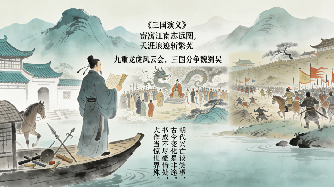《三国演义》者,乱世之史诗,英雄之绝唱也。起于东汉末年之烽烟,终于西晋一统之沧桑。罗贯中以如椽大笔,绘就群雄逐鹿之画卷:曹孟德挟天子以令诸侯,雄才大略,尽显乱世奸雄之姿;刘玄德携关张桃园结义,仁德布于四海,常怀兴复汉室之望;孙仲谋踞江东虎视天下,沉稳果敢,守父兄基业以拓疆。更有诸葛孔明,羽扇纶巾,运筹帷幄,空城退敌显智绝,六出祁山见忠肠;关云长过五关斩六将,义薄云天,华容放曹留千古佳话。官渡之战,以弱胜强,彰谋略之精妙;赤壁烽火,烈焰冲天,显水火之奇章。“分久必合,合久必分”,道尽历史轮回之规律;“鞠躬尽瘁,死而后已”,写尽忠臣报国之热肠。