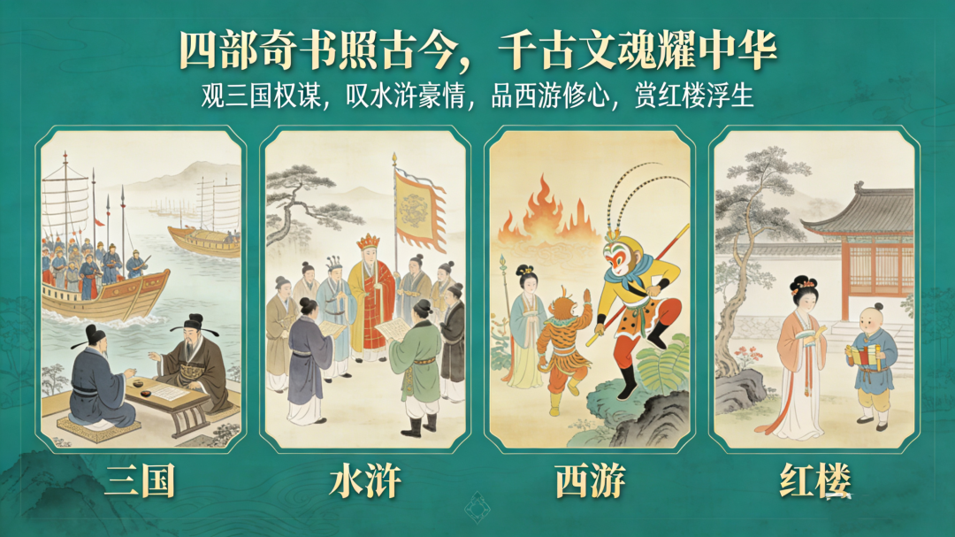 呜呼!四大名著,各领风骚。《三国》见权谋忠义,《水浒》显侠气刚肠,《西游》寓成长智慧,《红楼》藏人性柔肠。它们如四面明镜,照见中国人之文化特质、精神脊梁;似四座丰碑,屹立于世界文学之林,万古流芳。今赋此篇,敬颂奇书,愿文脉永续,经典恒昌!
