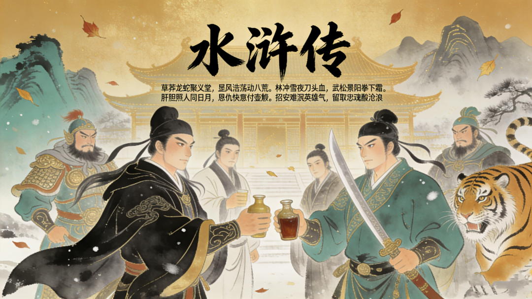 《水浒传》者,侠义之壮歌,豪杰之列传也。施耐庵笔走龙蛇,记北宋末年一百单八将聚义梁山。武松景阳冈上,赤手毙猛虎,勇冠天下;又将知县赏银尽数分与猎户,不恋钱财,尽显义之担当。鲁提辖拳打镇关西,救民于水火,粗中有细;林教头风雪山神庙,忍无可忍终上梁山。宋江仗义疏财,号“及时雨”,聚豪杰于水泊,树“替天行道”之旗;李逵直爽鲁莽,却忠心不二,为兄弟两肋插刀。书中人物,或被逼无奈,或愤世嫉俗,皆怀一腔热血,反抗不公,尽显江湖义气之刚。