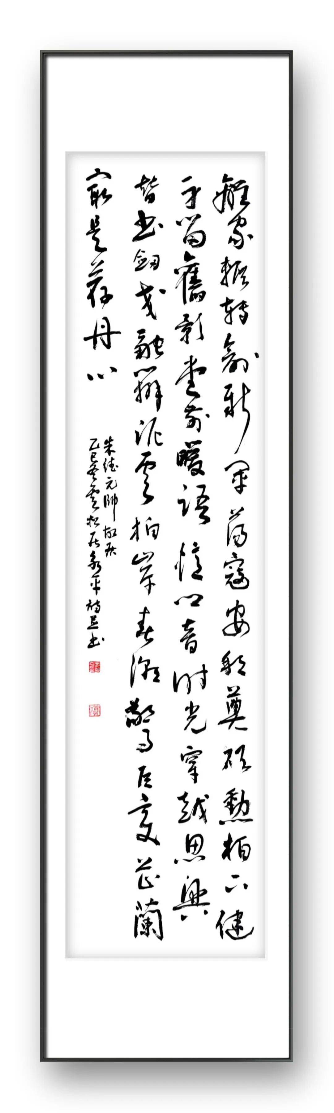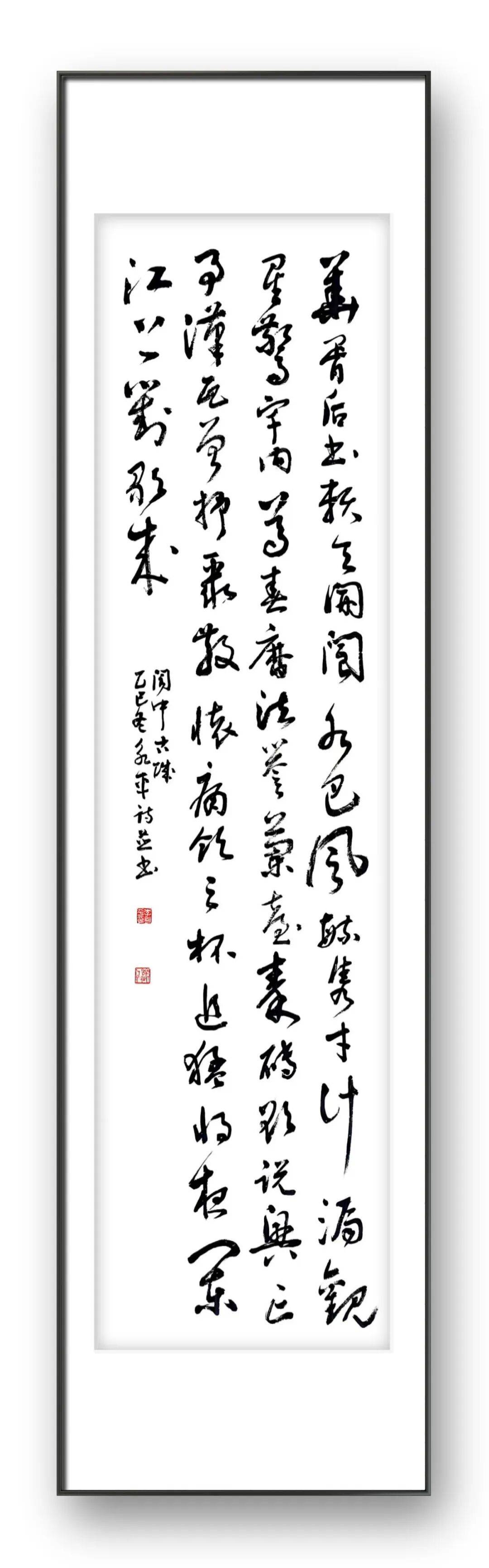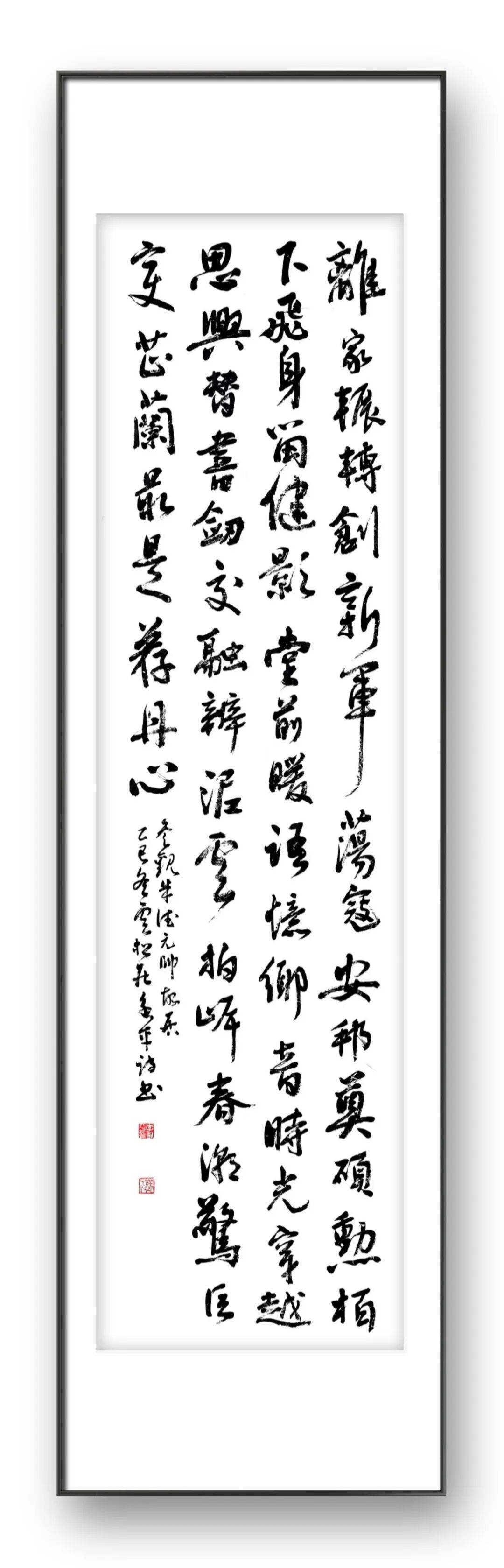 而行草作品,则是老师性情的淋漓释放。笔势纵横捭阖,墨韵跌宕起伏,既有王羲之的潇洒飘逸,又有颜真卿的雄浑刚健。线条如行云流水,或轻如蝉翼,或重如崩山,在提按顿挫间尽显书写的韵律与节奏。字与字之间顾盼呼应,气脉贯通,虽连绵不绝却又字字独立,在动态的平衡中营造出强烈的视觉张力。时而如疾风骤雨,气势磅礴;时而如小桥流水,温婉雅致,将情感的起伏与笔墨的变化完美融合,让人在流动的线条中感受到生命的律动与艺术的激情。