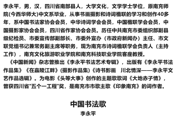 纵观李永平老师的书法作品,没有浮华的修饰,没有刻意的雕琢,每一笔都饱含深情,每一划都彰显格调。他以章草为基,融古今之韵;以诗文为魂,抒家国之情;以笔墨为桥,传文化之脉。他的书法,是嘉陵江人文底蕴的生动写照,是传统文化的当代传承,更是个人情怀与精神追求的真实流露。在书法艺术的道路上,李永平老师始终不忘初心、笃行不怠,用笔墨书写着对传统文化的敬畏,对家乡的热爱,对艺术的执着,为当代书法艺术的传承与发展,贡献着自己的力量,也为我们展现了一位当代文人书法家的初心与担当。