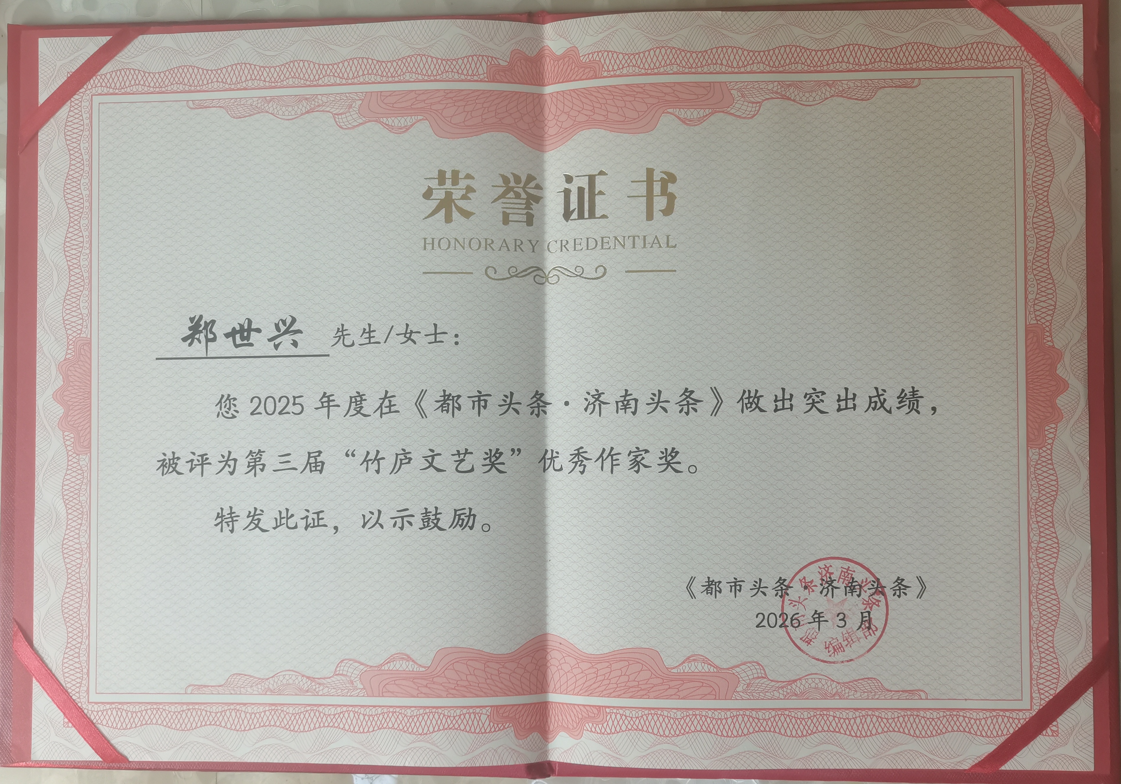 此刻捧着这沉甸甸的“竹庐文艺奖”优秀作家证书,因年事已高,行动不便,未能参加3月24日泉城盛会,石广东先生已代我领取证书,26日一早孙斯水先生从周村驱车40里路亲自将获奖证书送来淄川,接过证书,让我心潮澎湃。逾八旬之躯,获此殊荣,既感诚惶诚恐,更觉文友关怀之温暖。