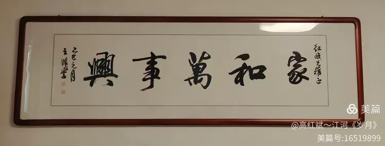 今天我把这粗浅的一点感受写下来与我身边的朋友分享,我想让更多的人感受到书法的魅力和王明学老师虽是大家却谦逊为人的风采。因为王老师的作品曾被作为国宝赠送给外国友人。我今天有幸能得到王老师为所写的“家和万事兴”的墨宝,乃不胜感激之至!