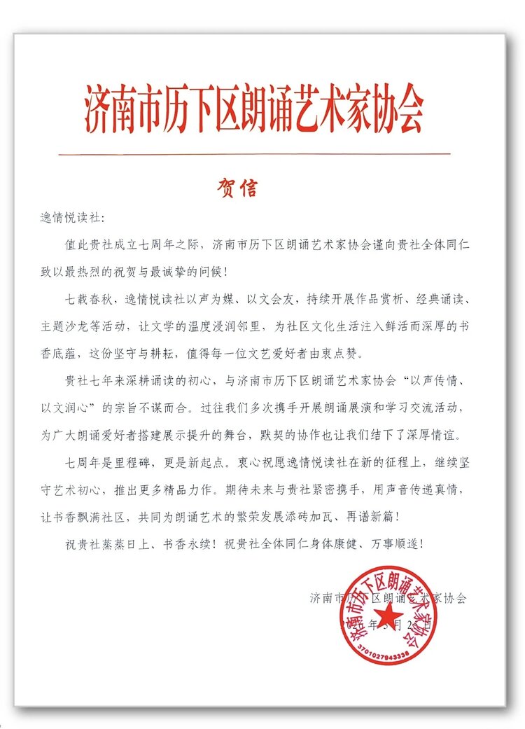 历下区朗诵艺术家协会主席刘宗致贺信