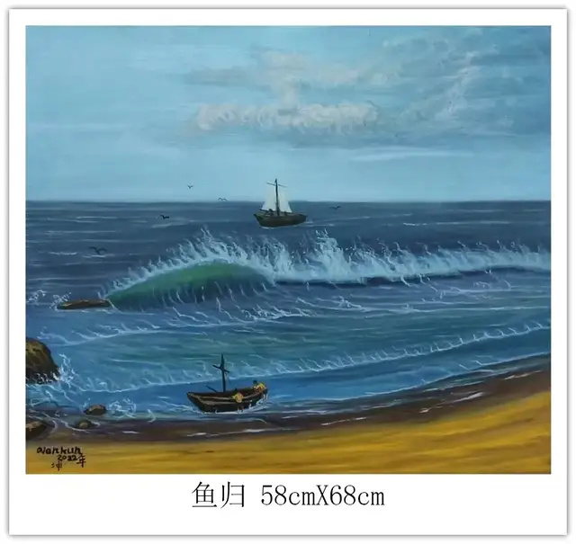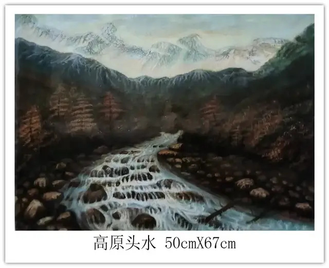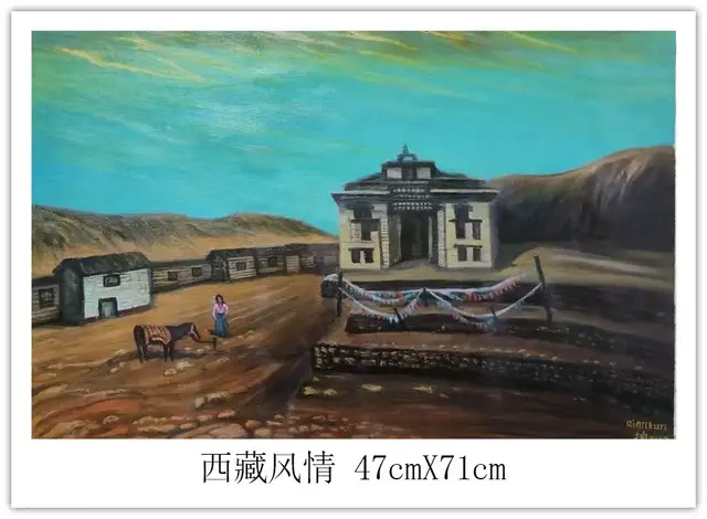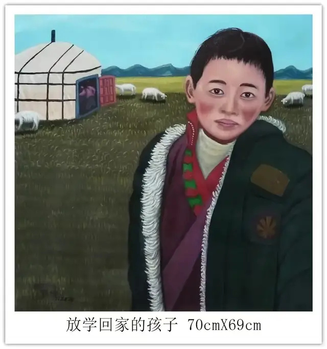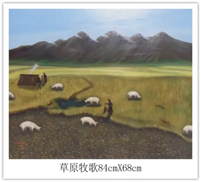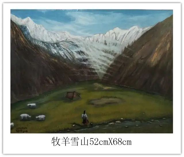 钱坤的艺术世界,首先是对民族风情的深情礼赞。如《高原故乡》与《牧羊少年》,以鲜明的色彩和细腻的笔触,生动描绘了藏族同胞的生活图景。身着传统服饰的人物与辽阔的高原、雪山、草原、羊群融为一体,画面和谐宁静,传递出浓郁的民族气息和对这片土地深沉的爱恋。这不仅是生活的记录,更是对坚韧、淳朴生命状态的颂歌。其次他的画笔饱含对祖国壮丽山河的咏叹《大海波涛》以磅礴气势展现海洋的雄浑力量,翻滚的巨浪与翔的海鸟充满动感与生机;《山峡雄峰》则以硬朗的线条和丰富的色彩,刻画出山峦的巍峨险峻与河流的奔腾不息。这些作品彰显了他驾驭宏大场景的能力,以及对自然伟力进行艺术升华的深厚功力。